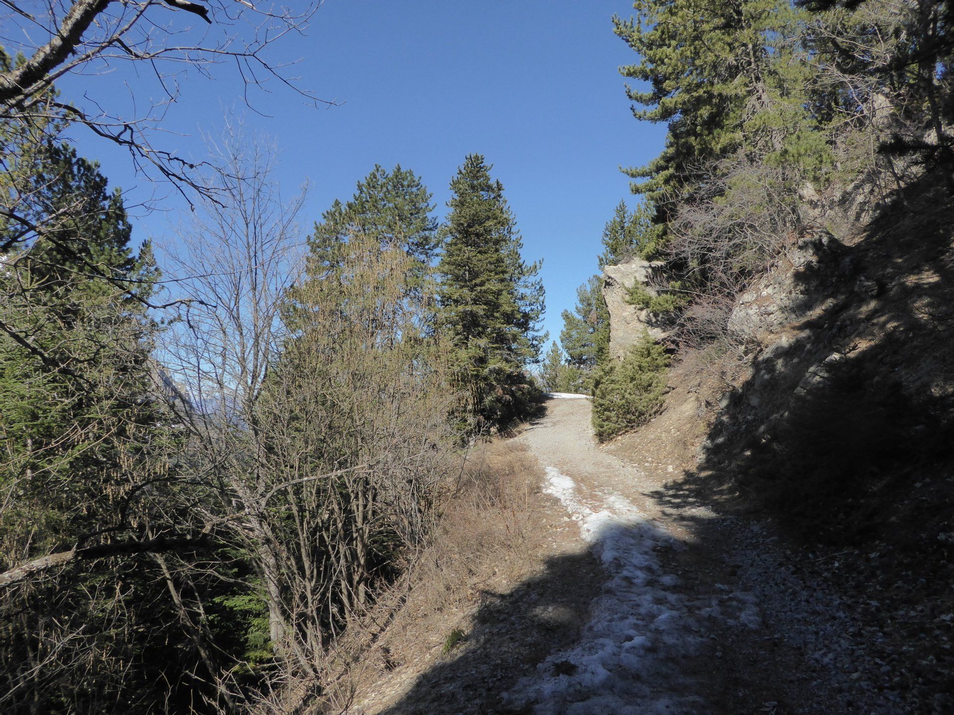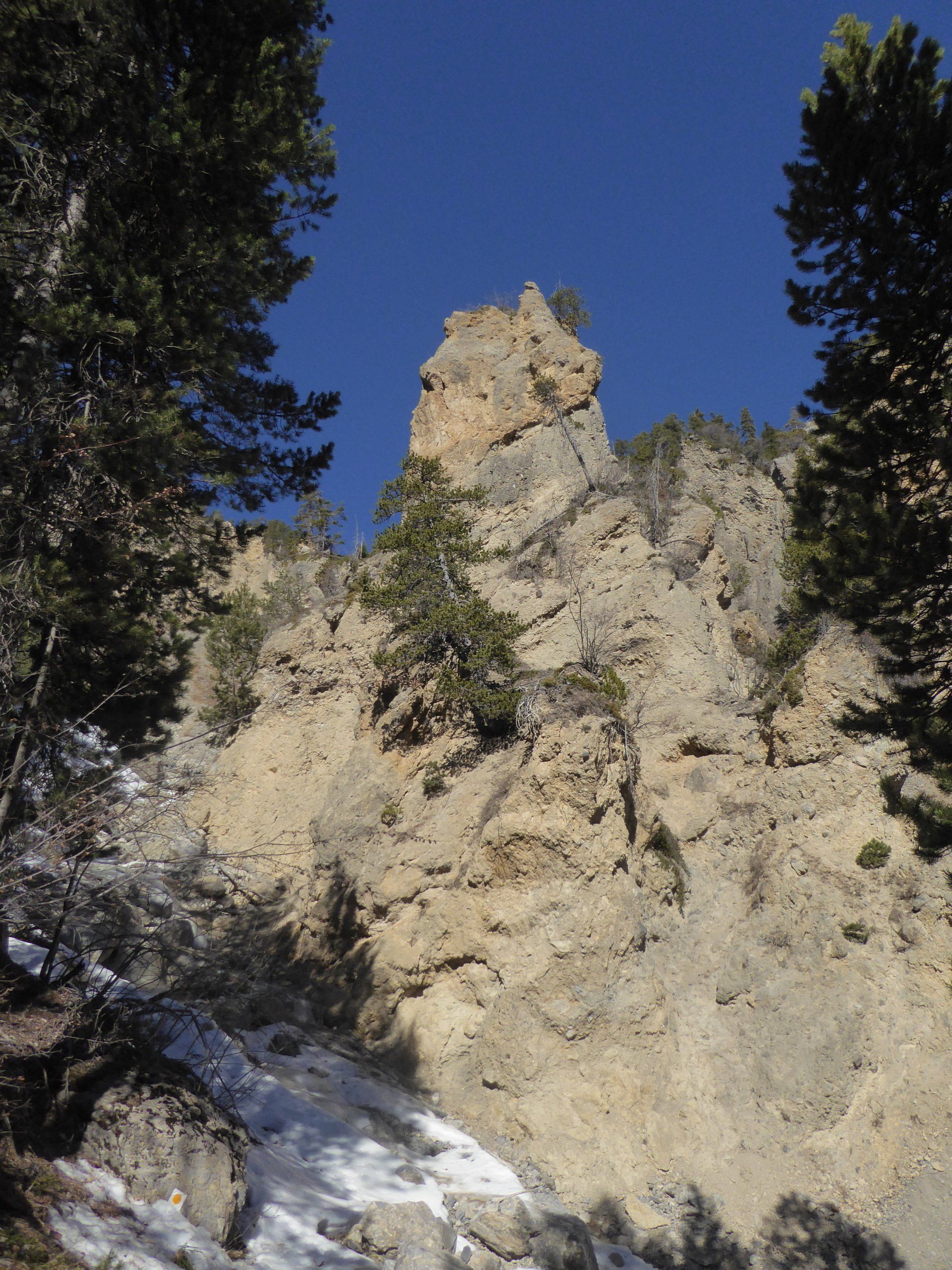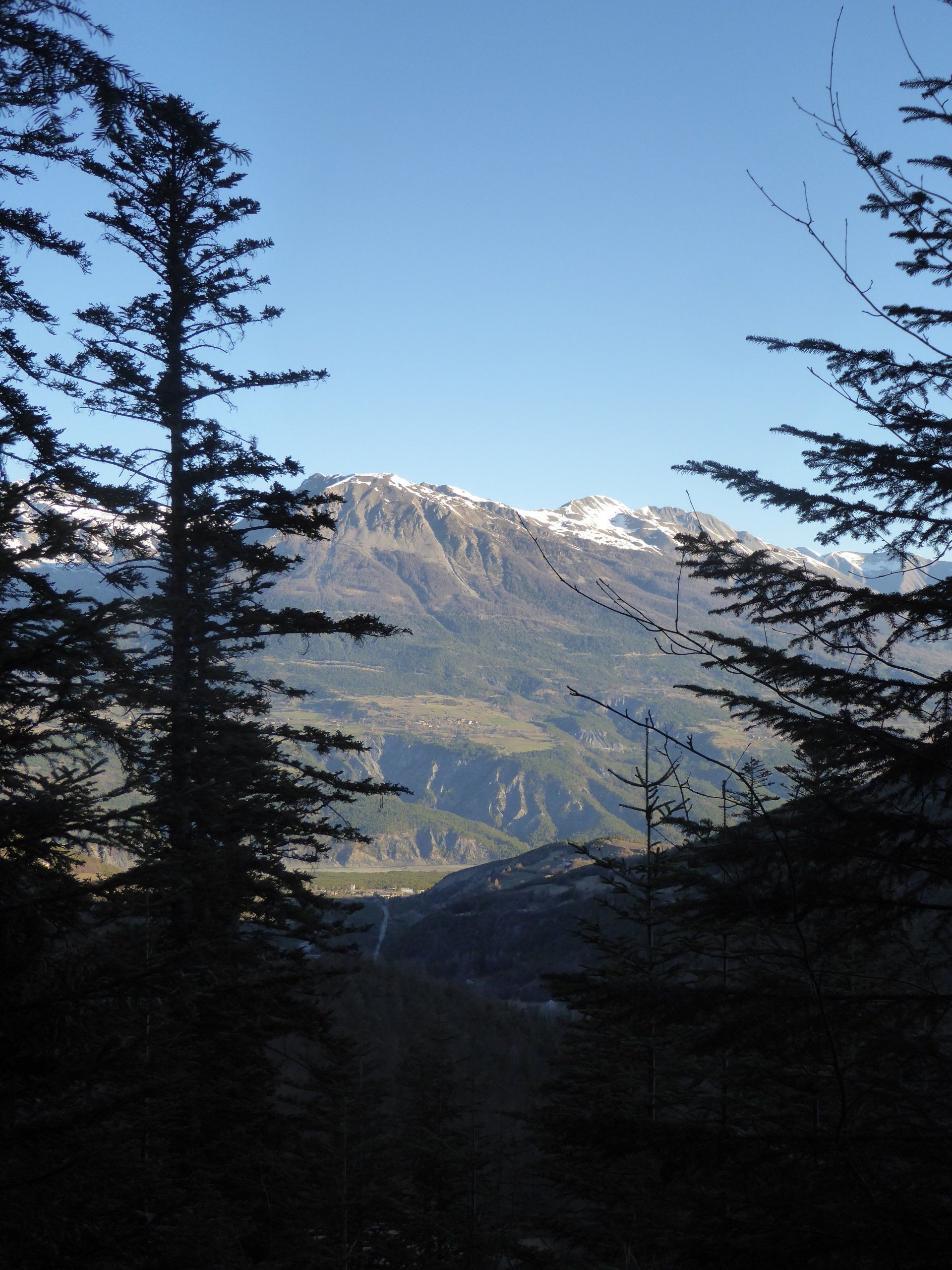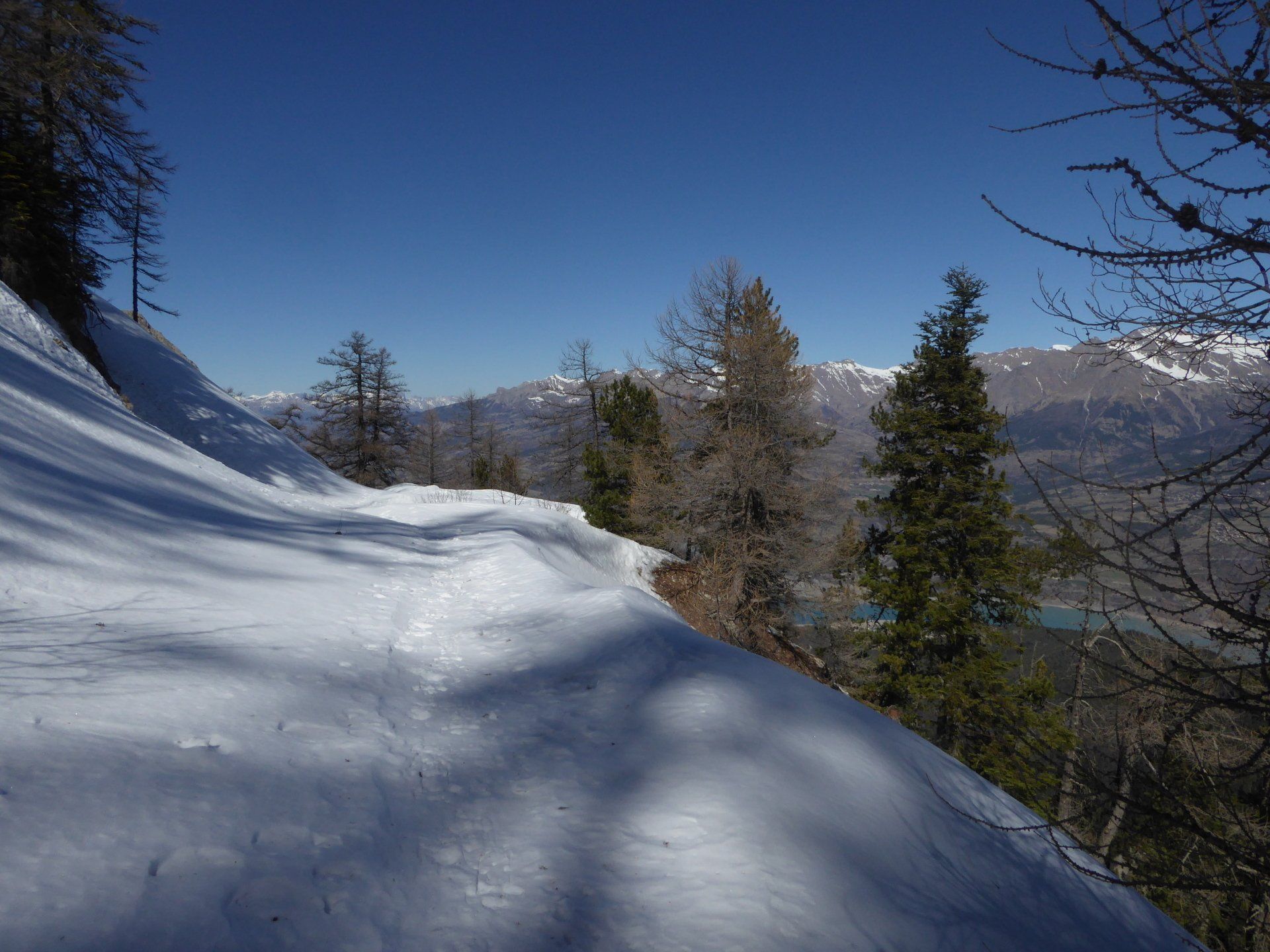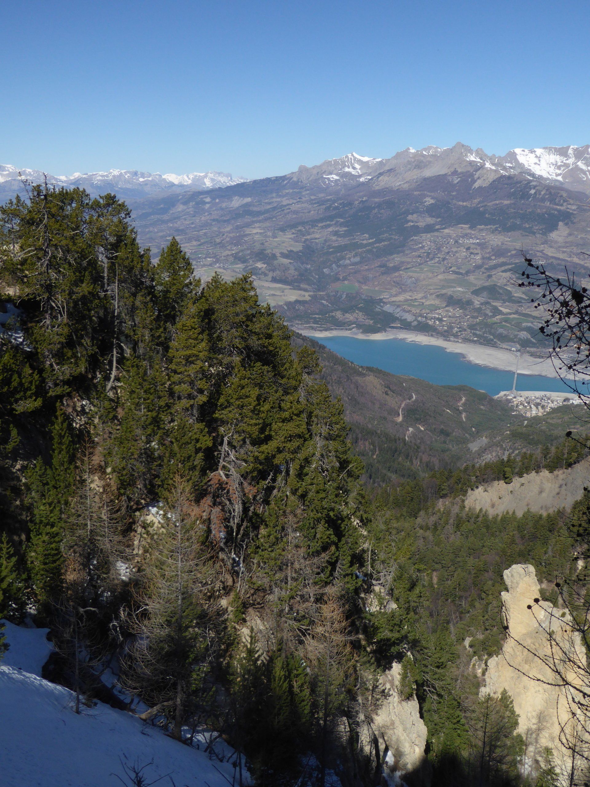 Trop tôt dans la saison pour que la route de la Fontaine de l'Ours ne soit ouverte, les plaques de verglas sont maîtres des lieux. Nuit au chaud dans nos duvets, un peu en pente ;-) Le lendemain matin, les lacets jusqu'à la Fontaine sont un peu lancinants. Nous découvrons la statue de l'ours et entamons le chemin des pyramides avec ses superbes belvédères sur le lac de Serre-Ponçon et ces amas verticaux de roches érodées. Le Morgon nous fait des clins d’œil entre deux arbres, aux détours des chemins qui alternent entre neige et sol déneigé. L'arrivée aux portes nous offre le cirque, somptueux, recouvert d'une neige épaisse. Ce lieu est magique. Le Morgon se dresse avec quelques zones soufflées par le vent vers son sommet. Après une pause casse-croûte, nous entamons la suite de notre boucle, rejoignons le col de la Baisse enivrés par la beauté du cirque qui nous entoure. Le lac se dissimule sous son épaisse couche de neige. Après le col, le plan galère commence. Nous saurons après que ce chemin est chaotique l'été, l'hiver c'est complètement déraisonnable et je ne suis pas fière de cette épopée. Pas de trace, nous nous fions au GPS. La pente est prononcée, nous espérons trouver une trace et atteindre les lacets qui doivent nous permettre de descendre. Nous enchaînons les traversées de pentes enneigées et exposées, soufflons quand nous trouvons quelques arbres. Faire la trace avec ce dévers est épuisant et l'incertitude de la tenue de la neige pesante. Une crête nous laisse espérer la fin de l'épreuve mais c'est un leurre, derrière il y a des rochers et une pente encore plus impressionnante. D'après le GPS, nous sommes sur le chemin mais là, devant, nous ne passerons pas. Nous cherchons à contourner la difficulté par le dessous, en vain. Après plusieurs glissades sans conséquence, la fatigue est très présente et chacun se demande en silence si nous n'aurons pas à passer la nuit dehors. Ça serait un moindre mal par rapport à une avalanche. Notre bâche et nos couvertures de survie pourraient nous le permettre. 3 options s'offrent à nous :