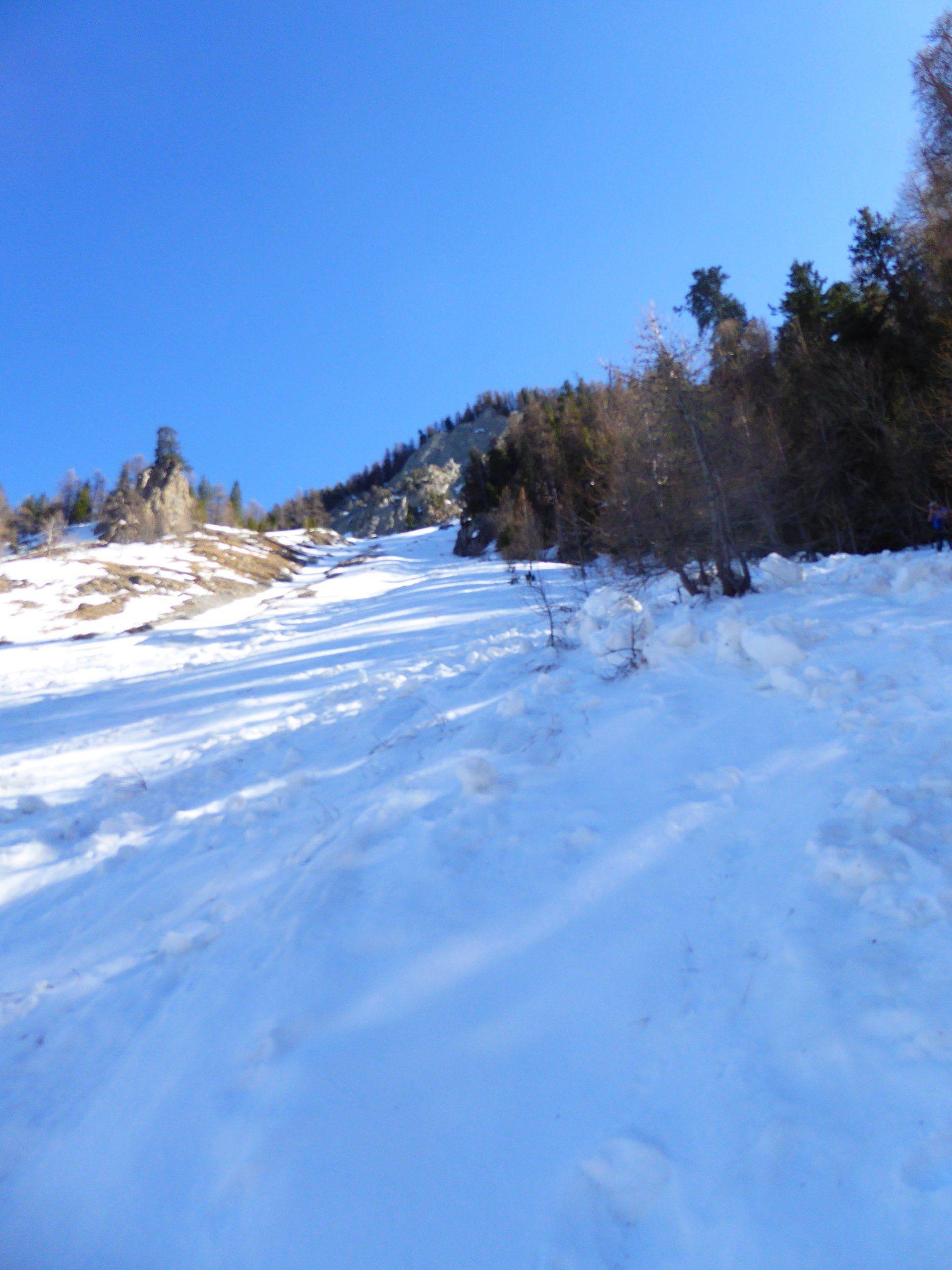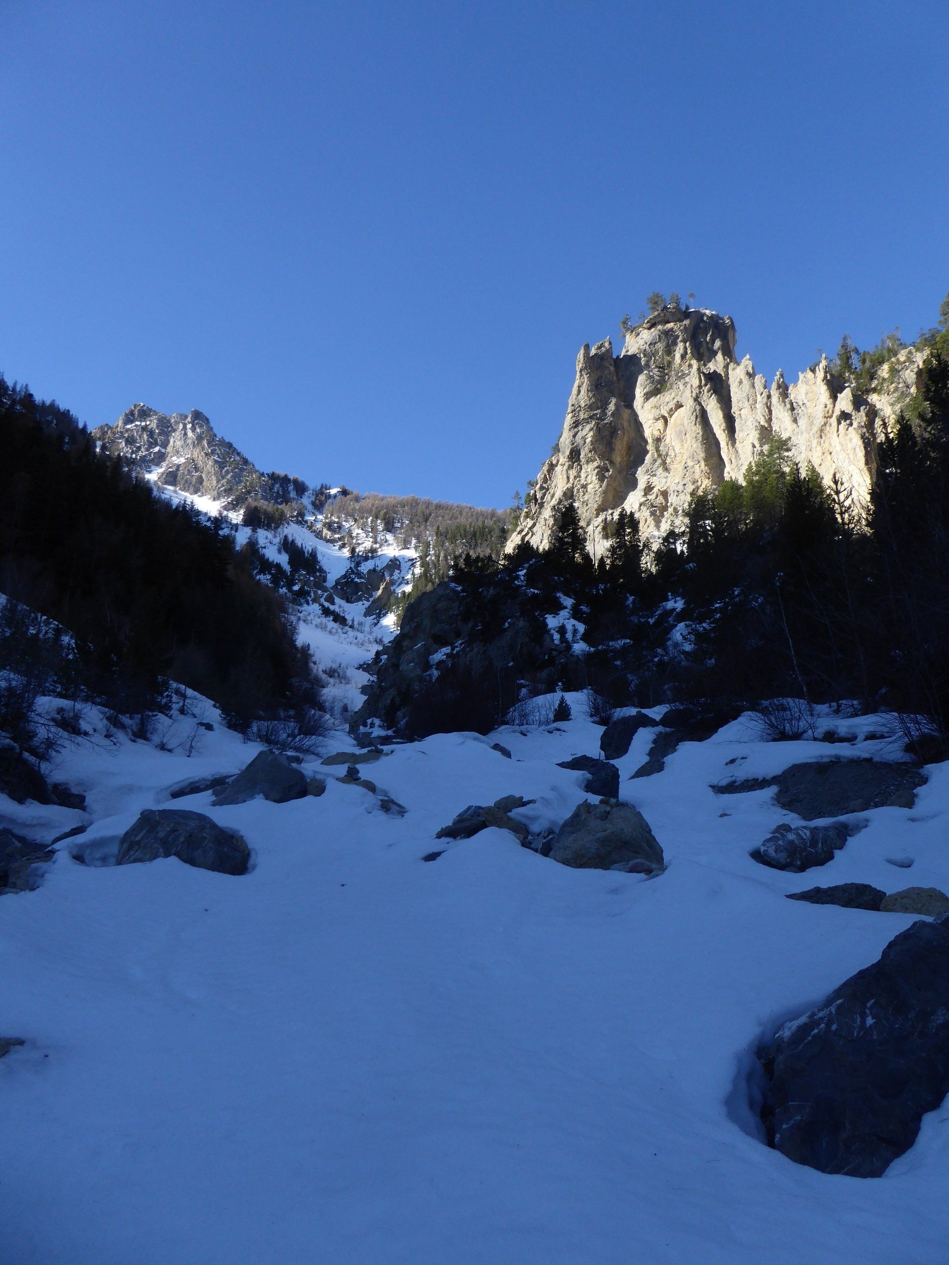 Nous abandonnons les raquettes pour les crampons. La descente est sportive, très en pente, avec des changements importants de neige parfois glacée, parfois poudreuse jusqu'en haut de la cuisse. En fin de descente, nous marchons sur les restes d'une avalanche, elles sont nombreuses dans ce fond de cirque. Pas de ressaut, nous rejoignons enfin le torrent (quel soulagement !), puis le chemin du matin.