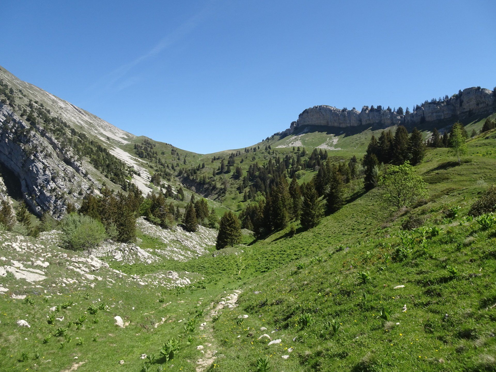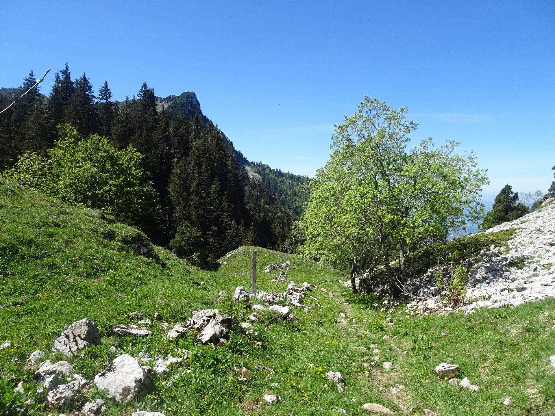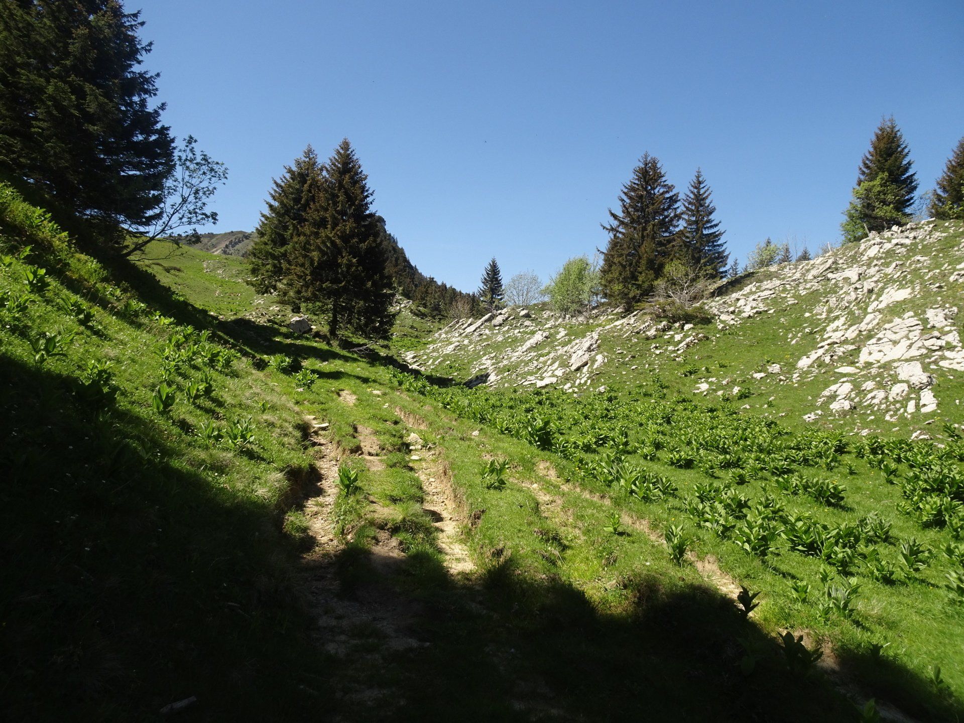Après ce premier palier bien agréable, la pente est plus forte, le minéral plus présent en direction de la cheminée du Lorzier.
