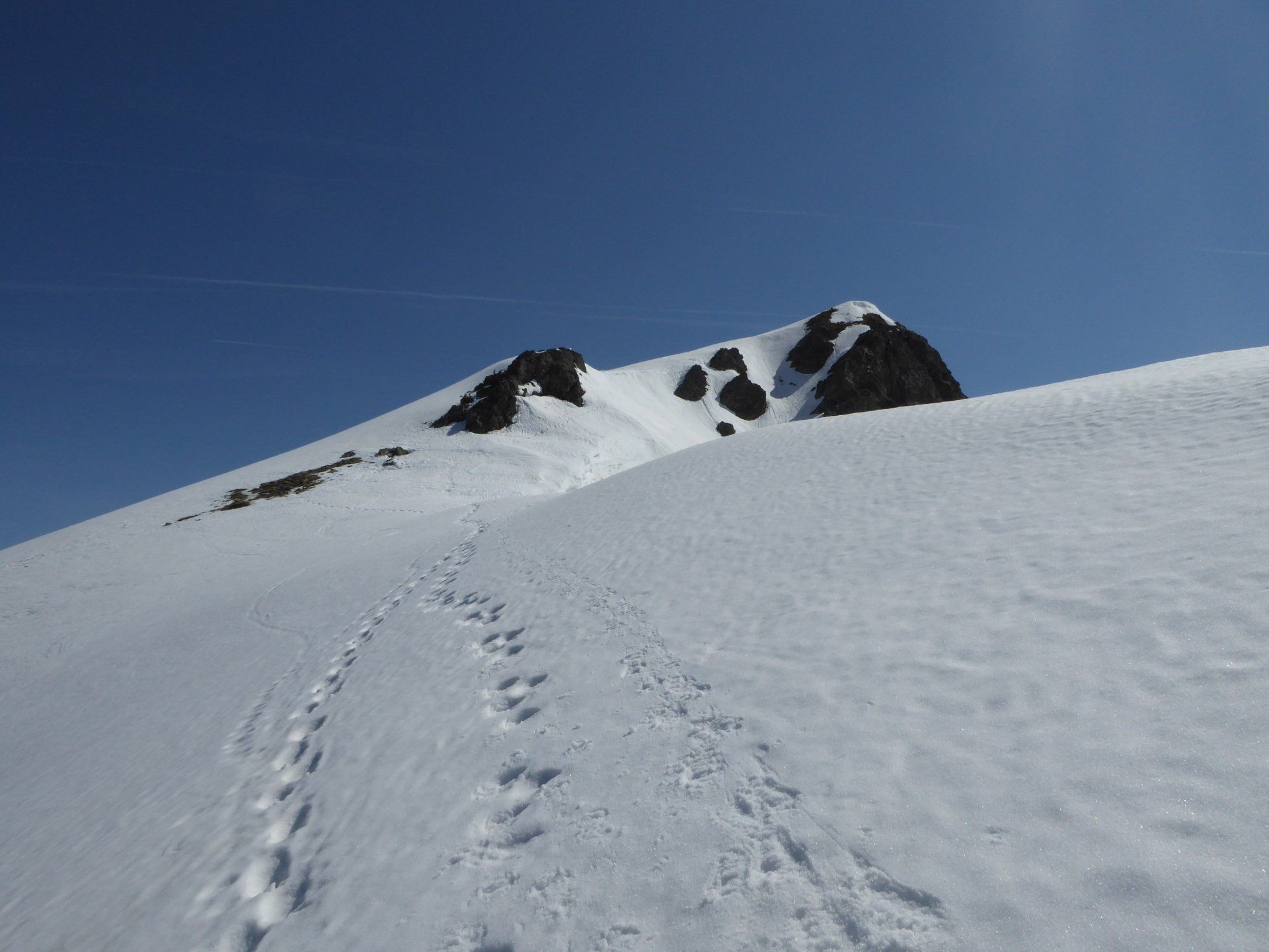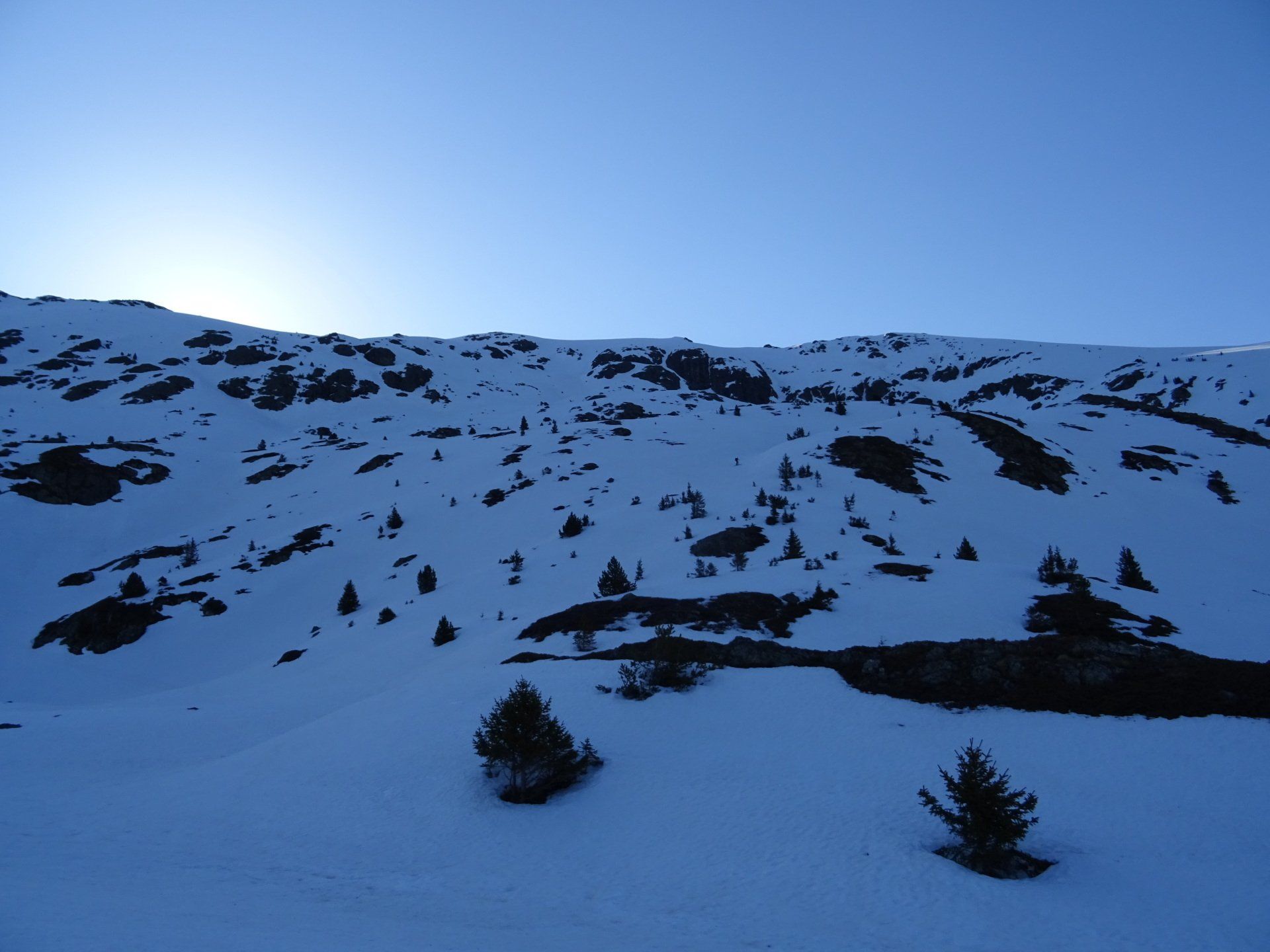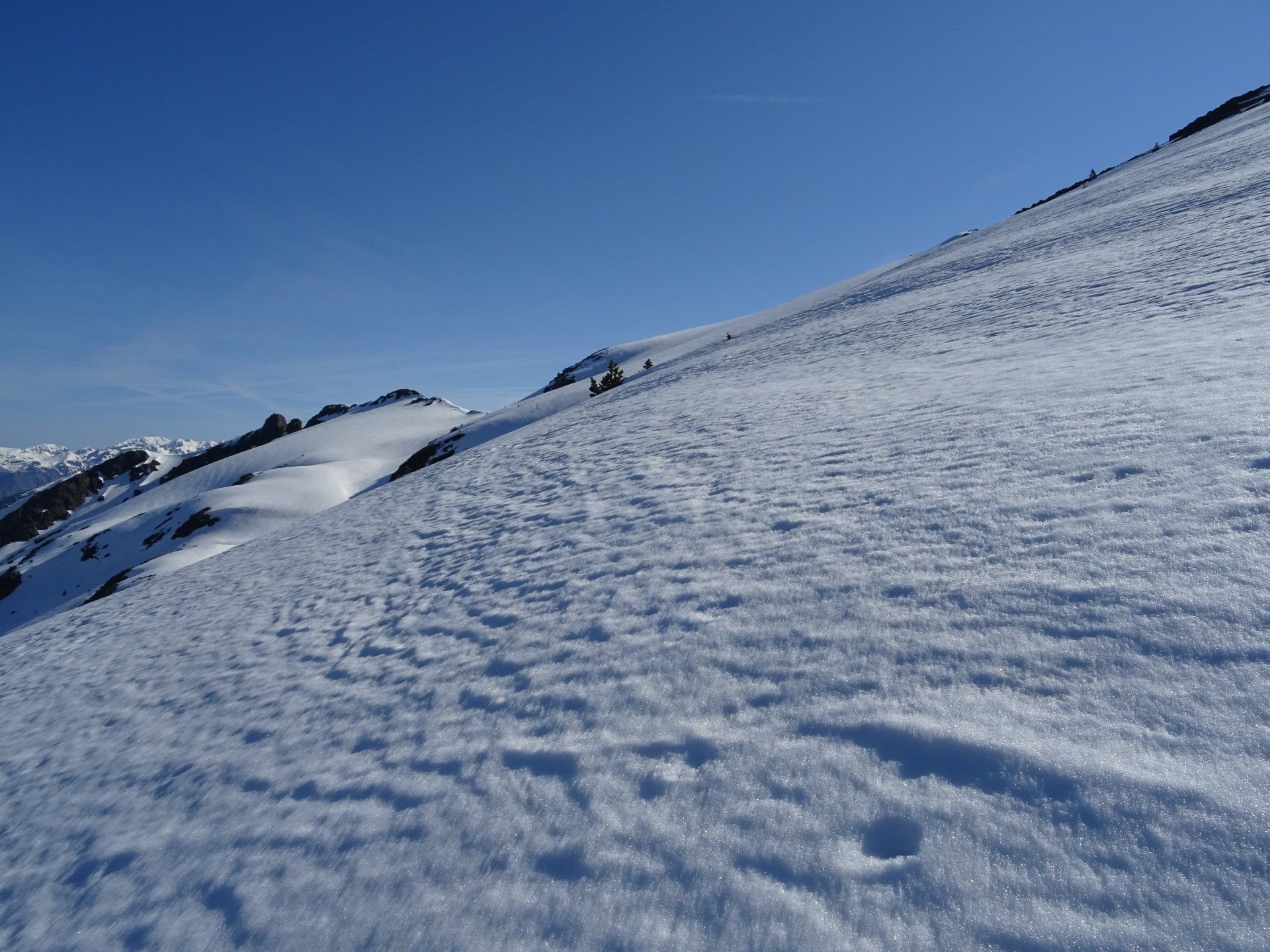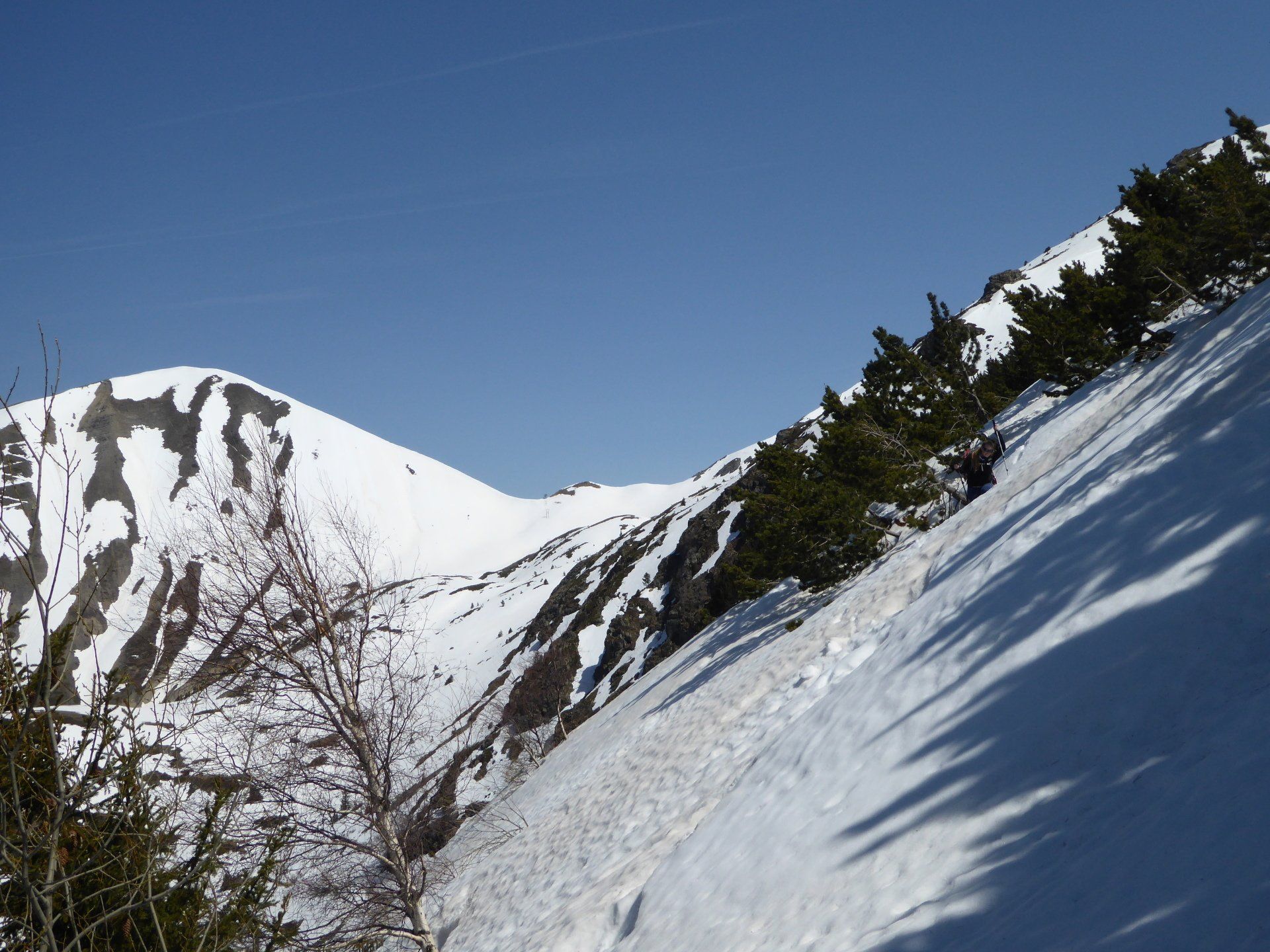Le soleil nous a rejoint. A défaut de trace nous attaquons la pente, parfois tout droit en choisissant les versants les moins exposés.