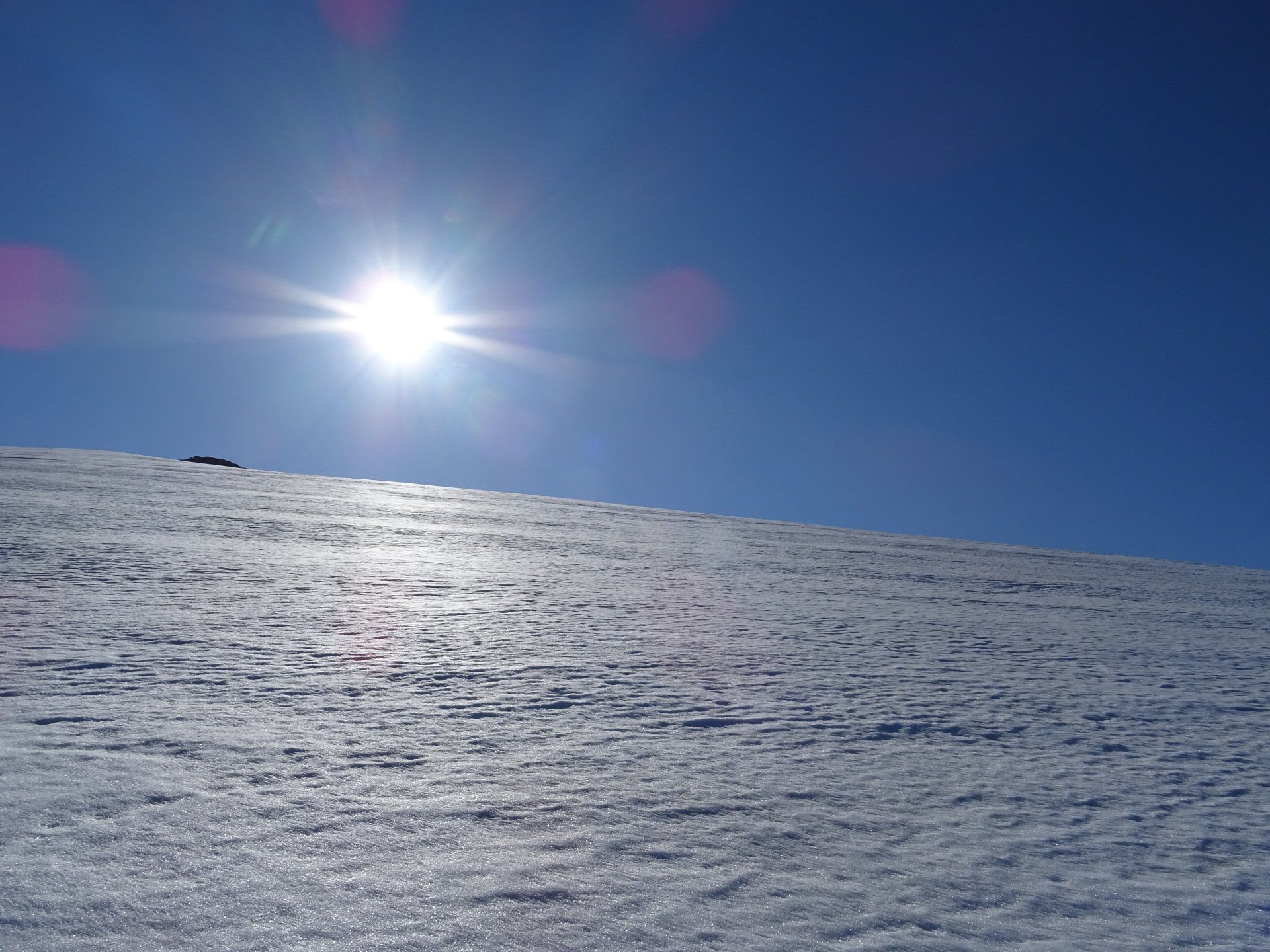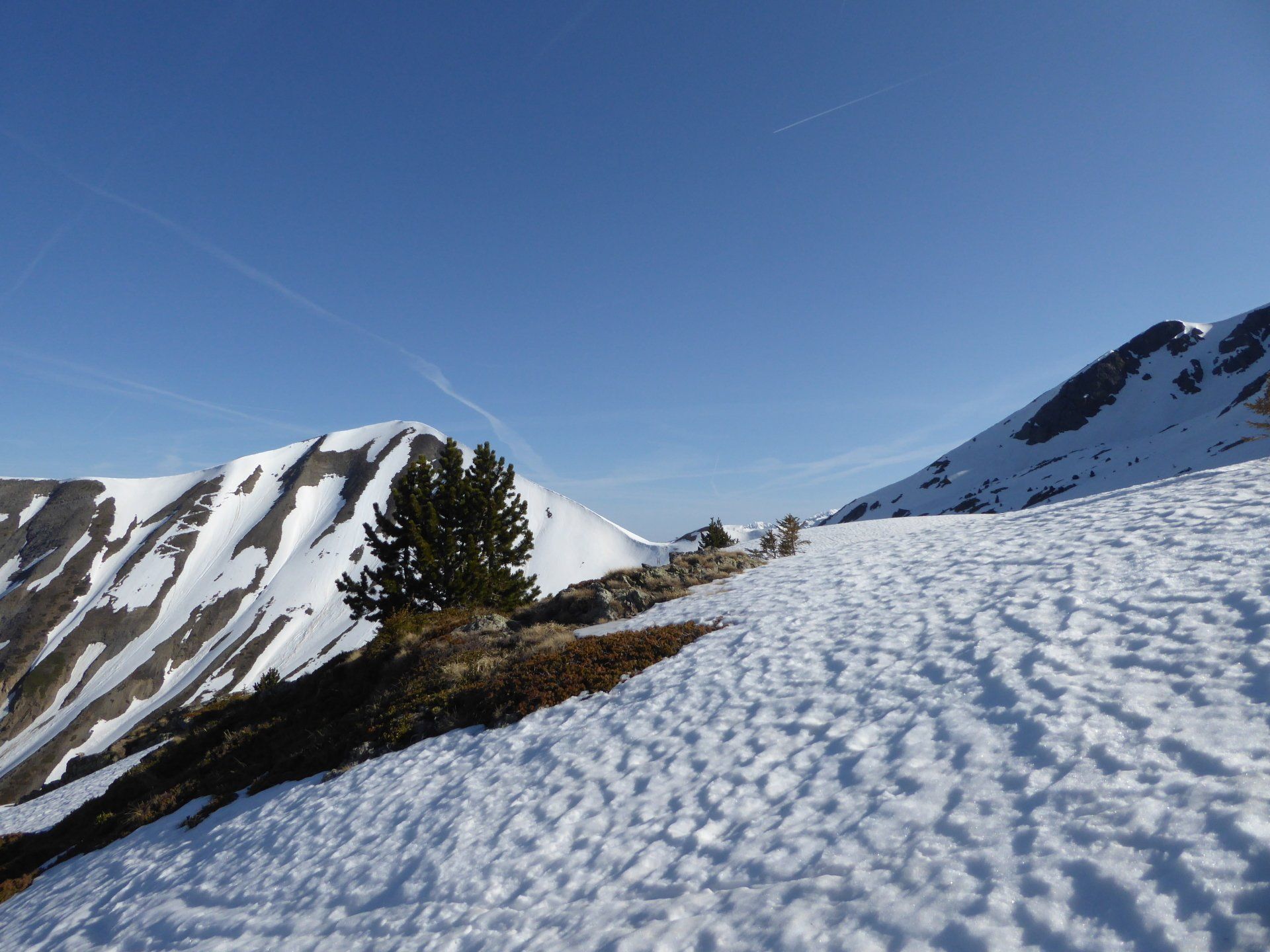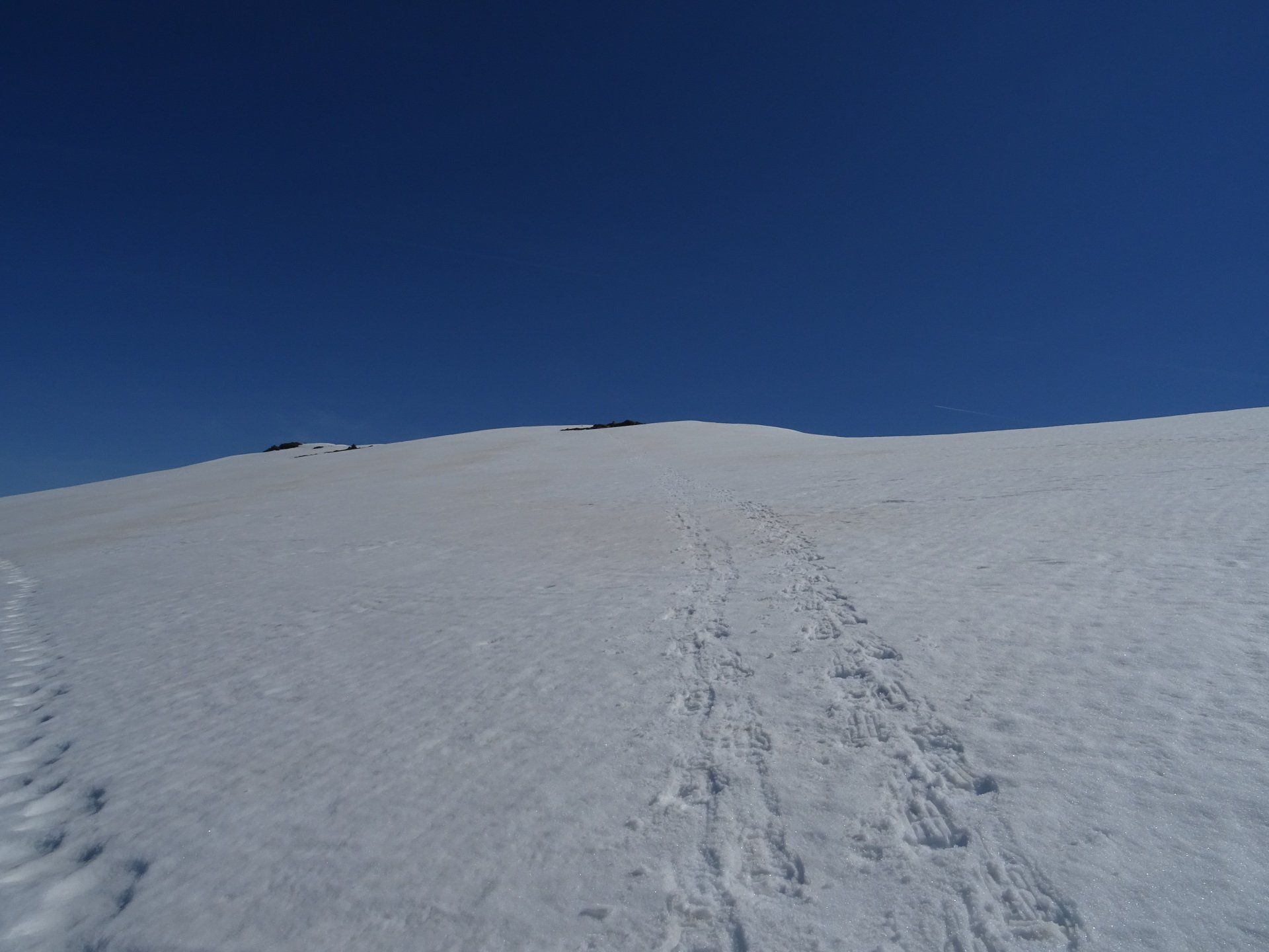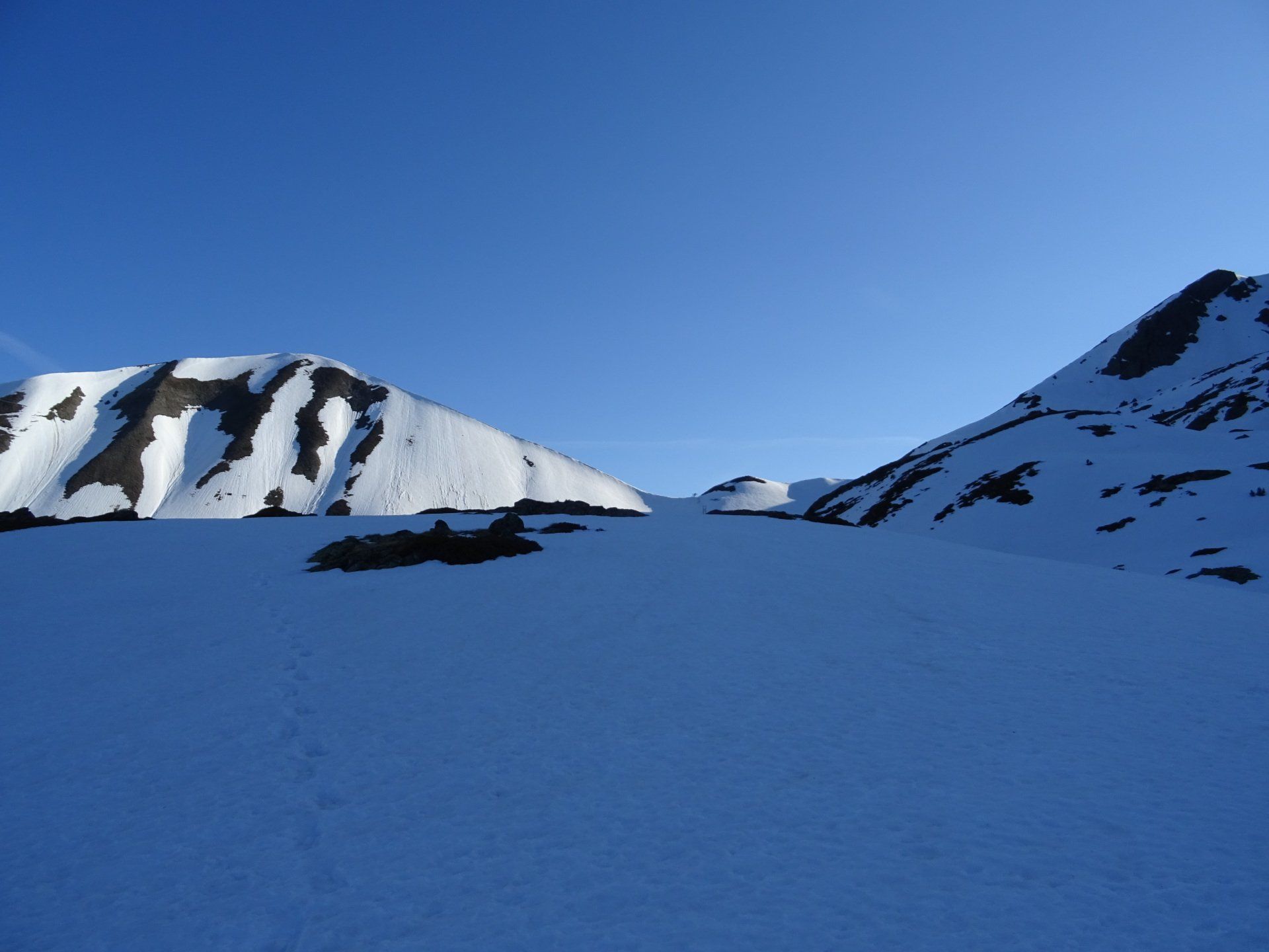Le soleil nous a rejoint. A défaut de trace nous attaquons la pente, parfois tout droit en choisissant les versants les moins exposés.