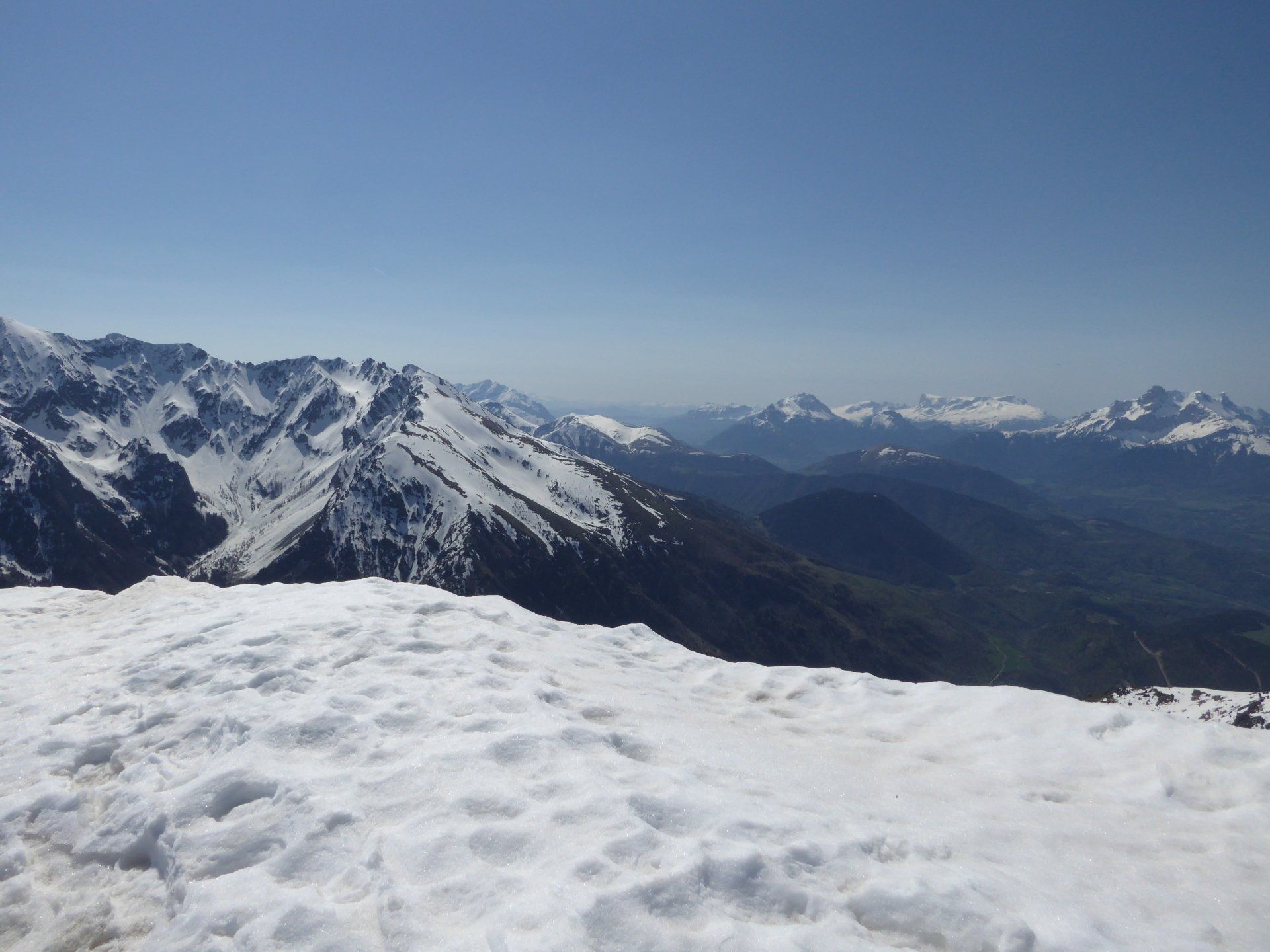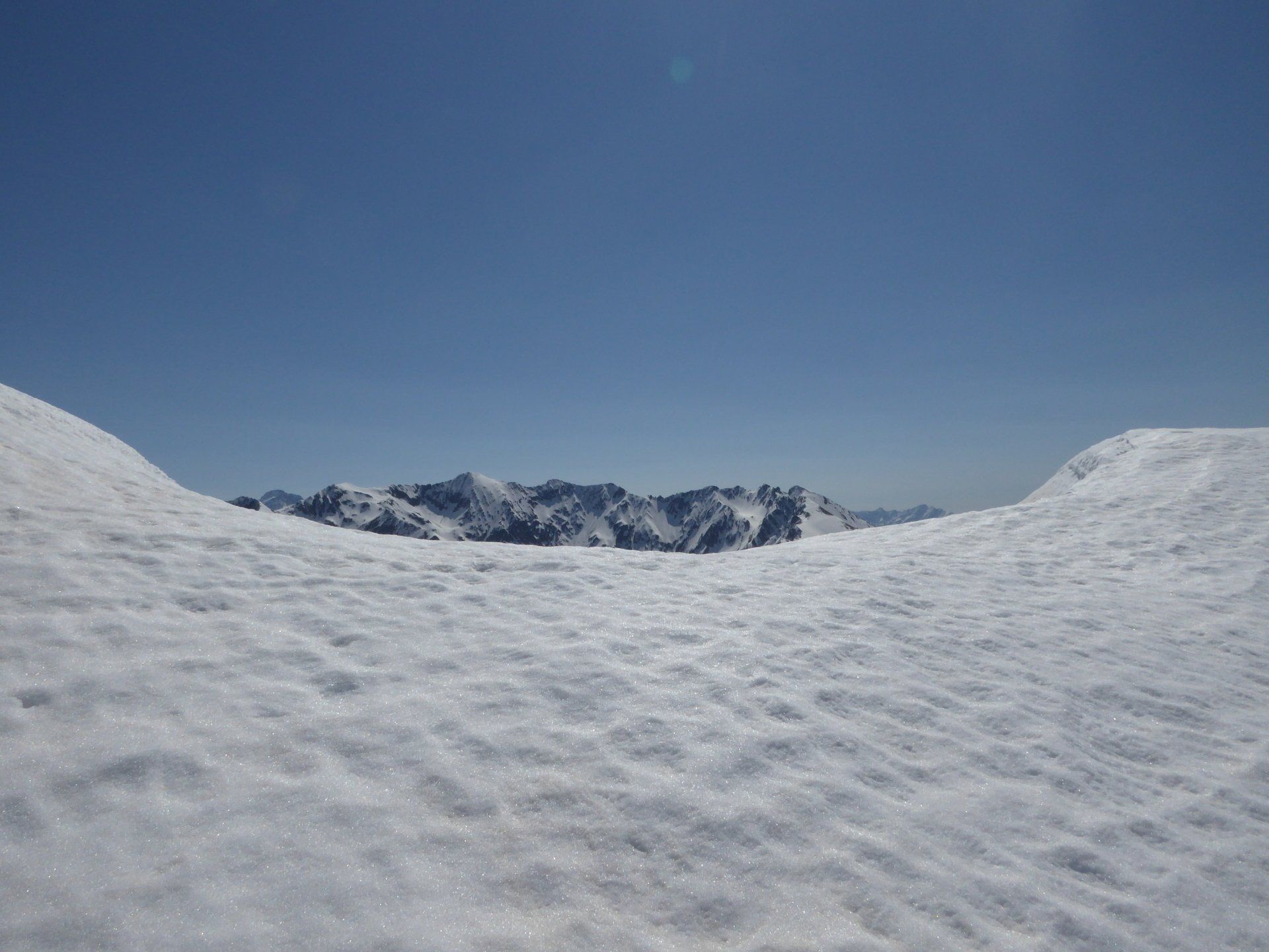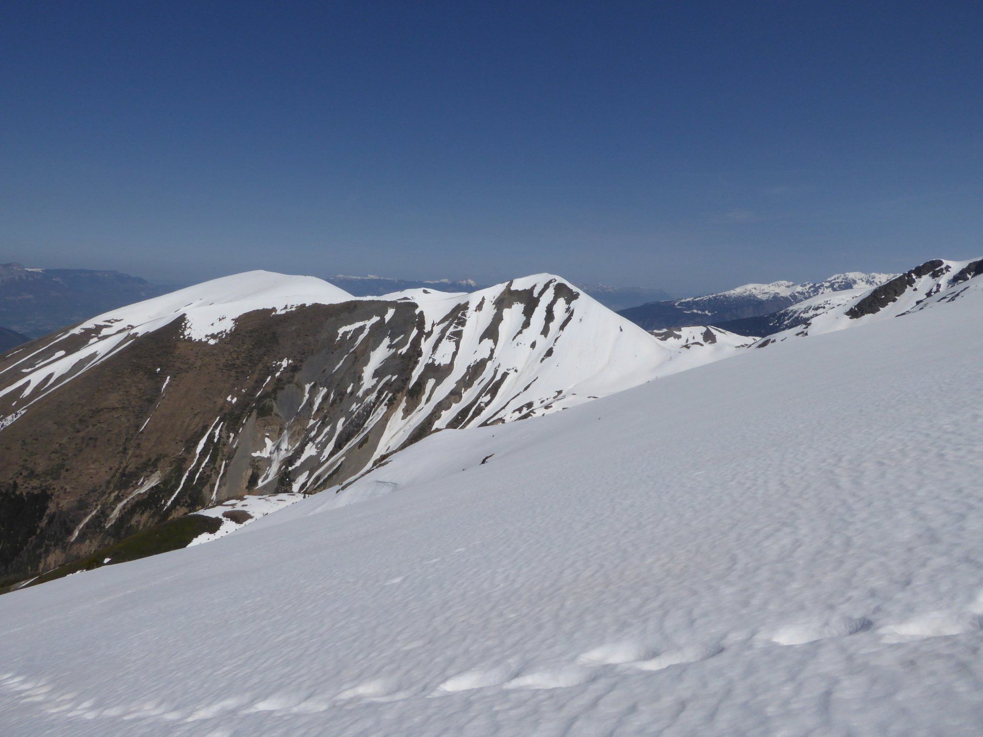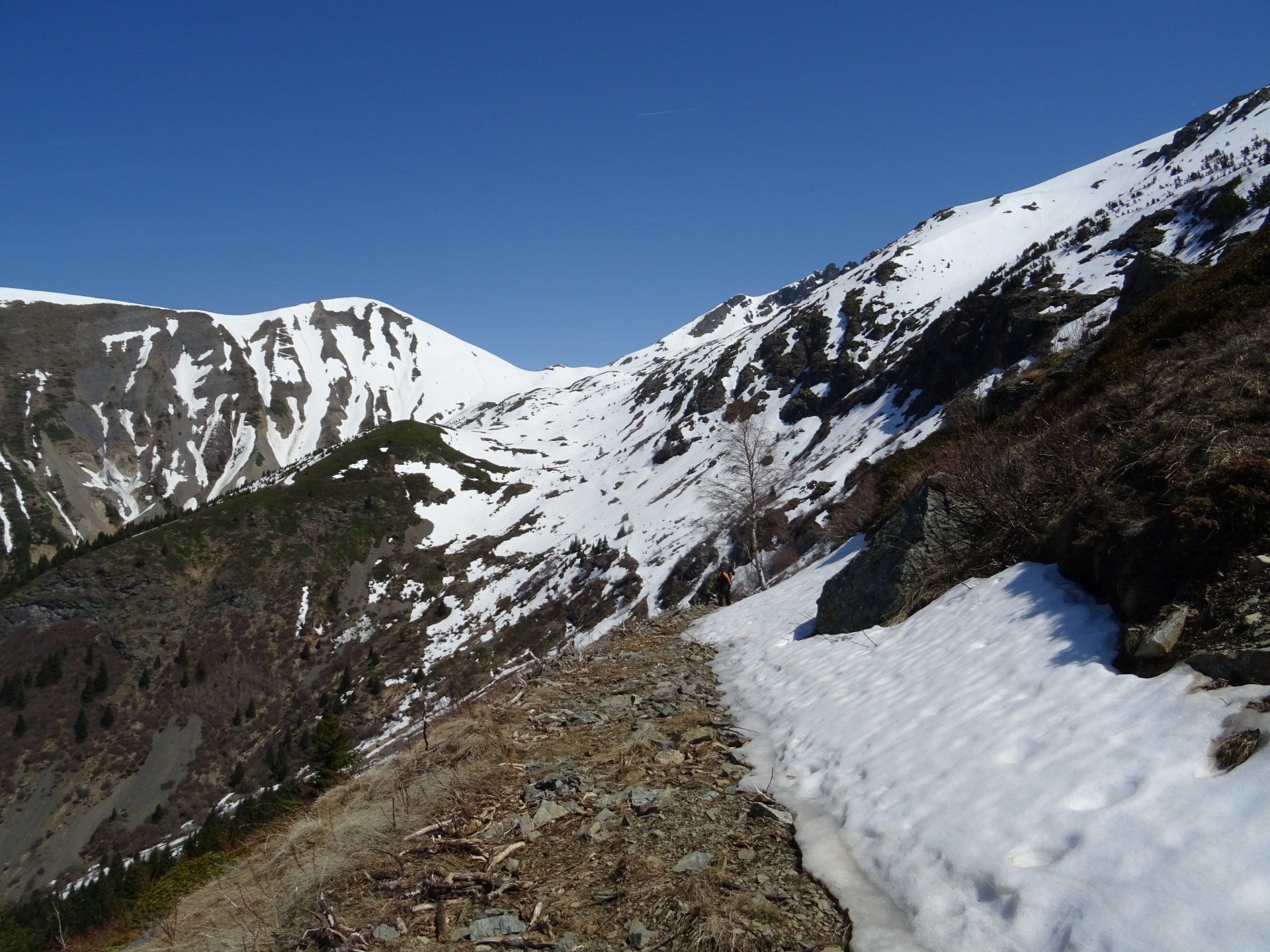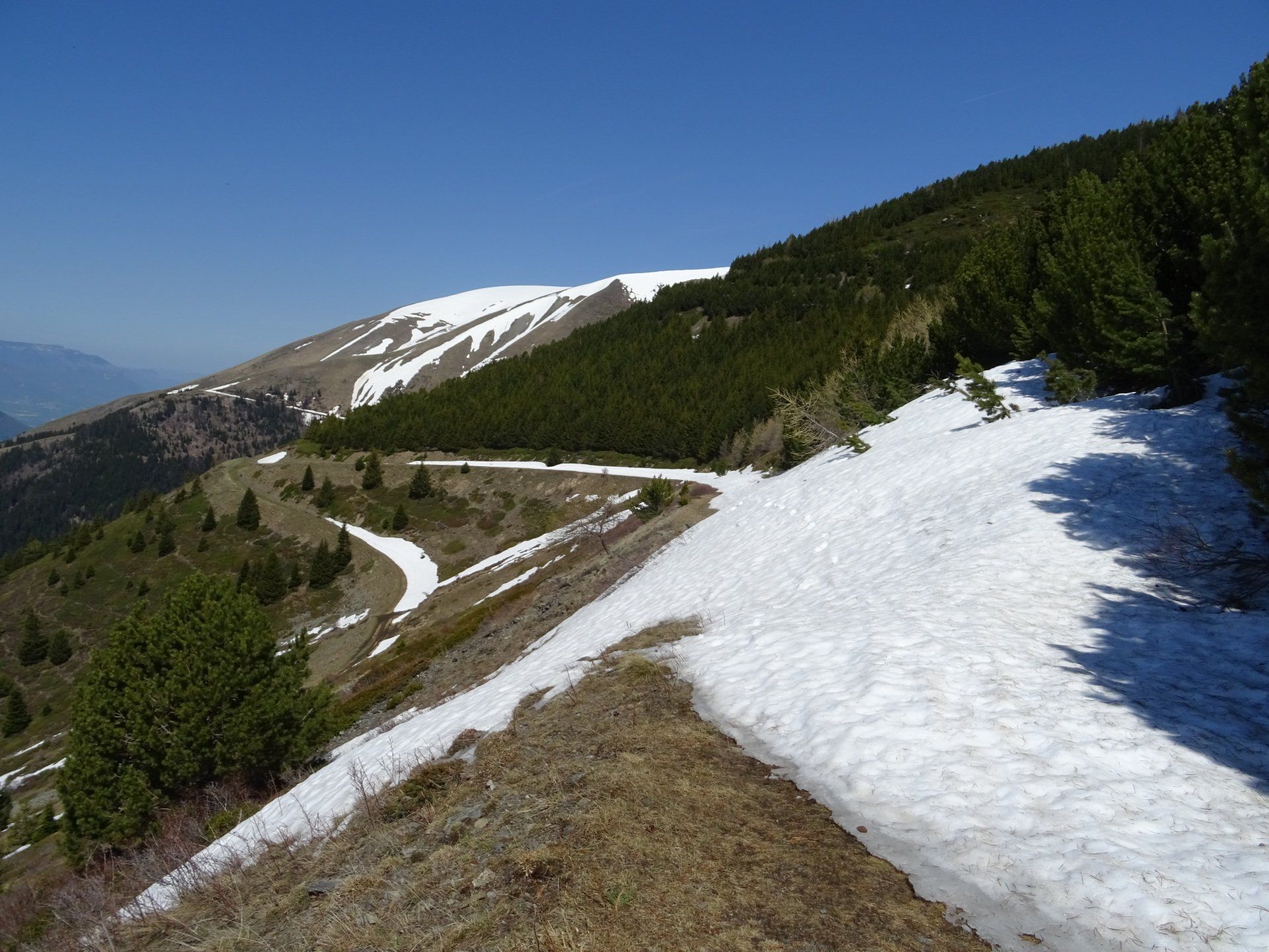 La neige est encore très présente. Neige de printemps avec glissades garanties. Quelques portions sur les fesses feront le bonheur de notre co-randonneuse.