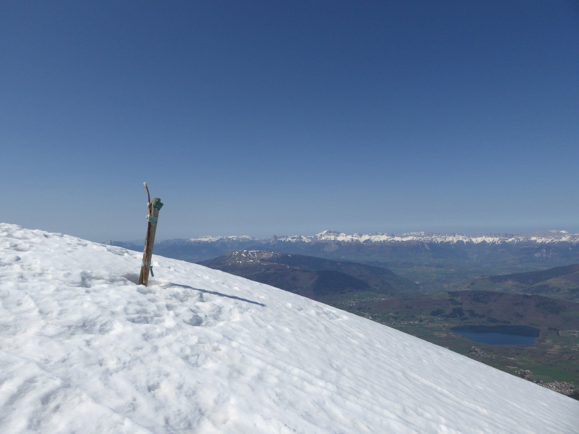 Nous atteignons le Lac Carlet. Seul le panneau trahira sa présence sous la neige. Dans le fond, nous apercevons le Mont Aiguille.