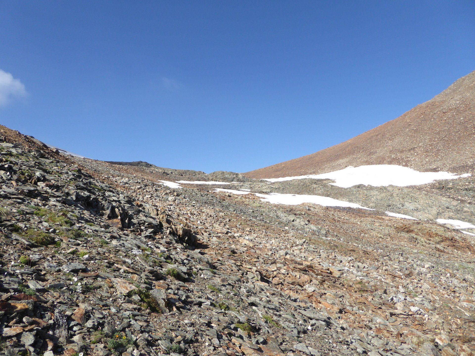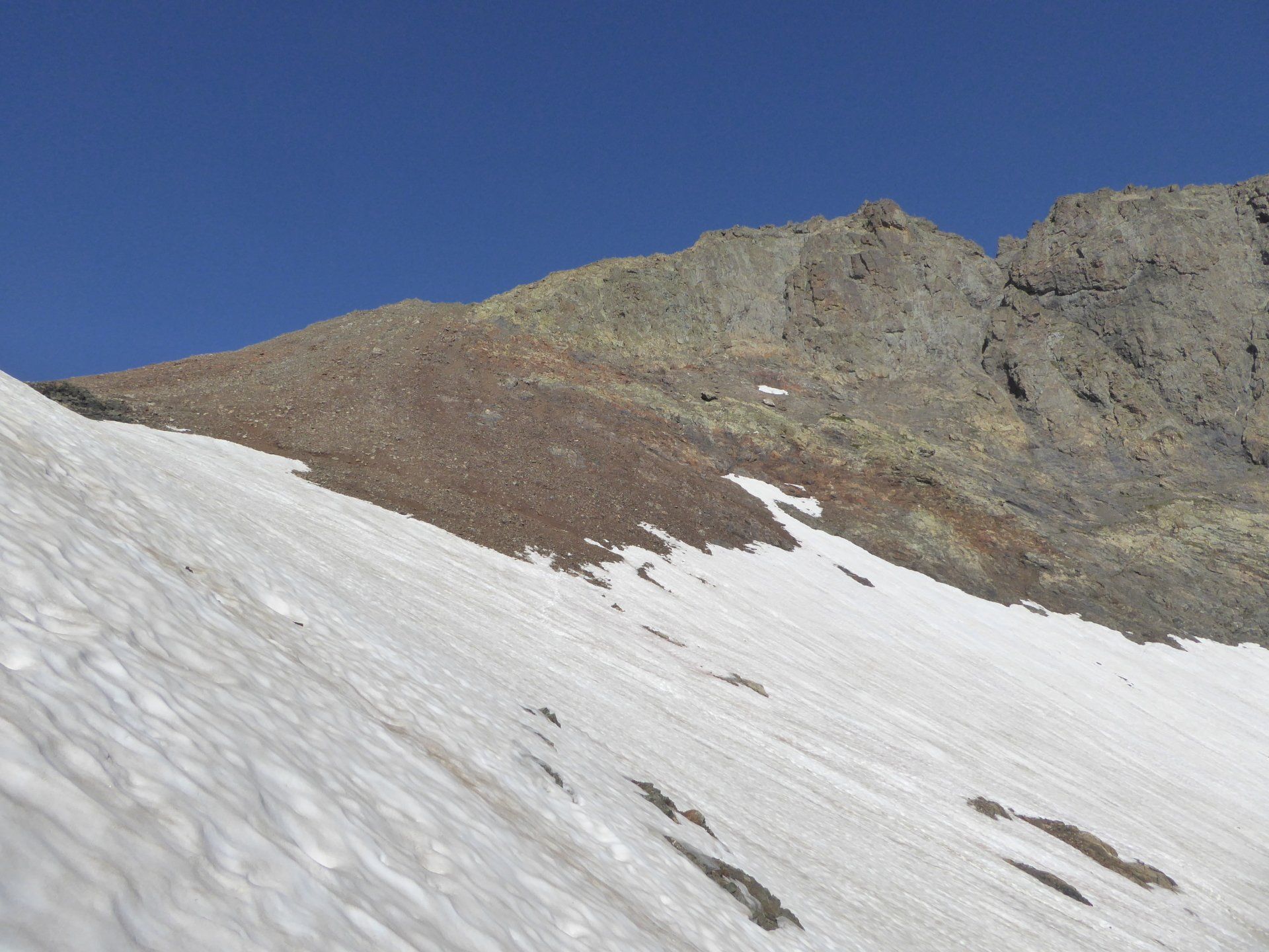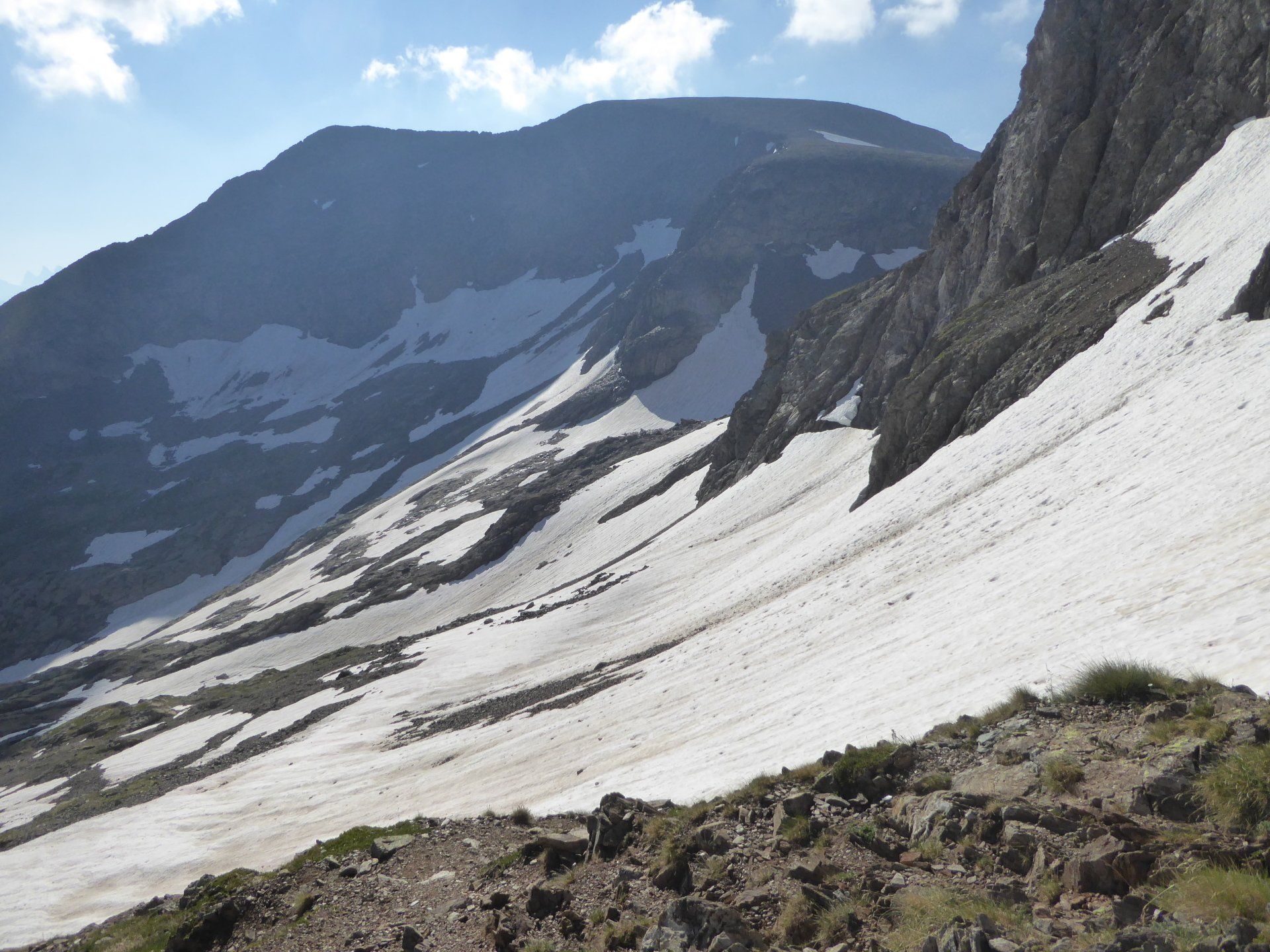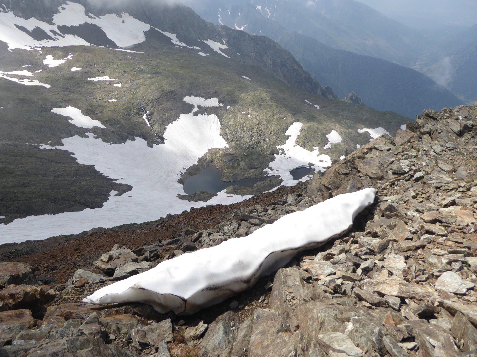 Nous n'avons pas pris nos équipements de neige. Les névés sont encore très présents. A la montée, nous profitons de la moindre langue de rochers qui émergent de la neige pour éviter de marcher sur la neige glissante. Cela nous mène à faire des "pieds et des mains" dans des amas de rochers pour éviter la glissade sur la neige. Nous décidons de ne pas reprendre le même chemin pour le retour, ça ne serait pas raisonnable. Le choix s'impose donc à nous de faire la grande boucle.