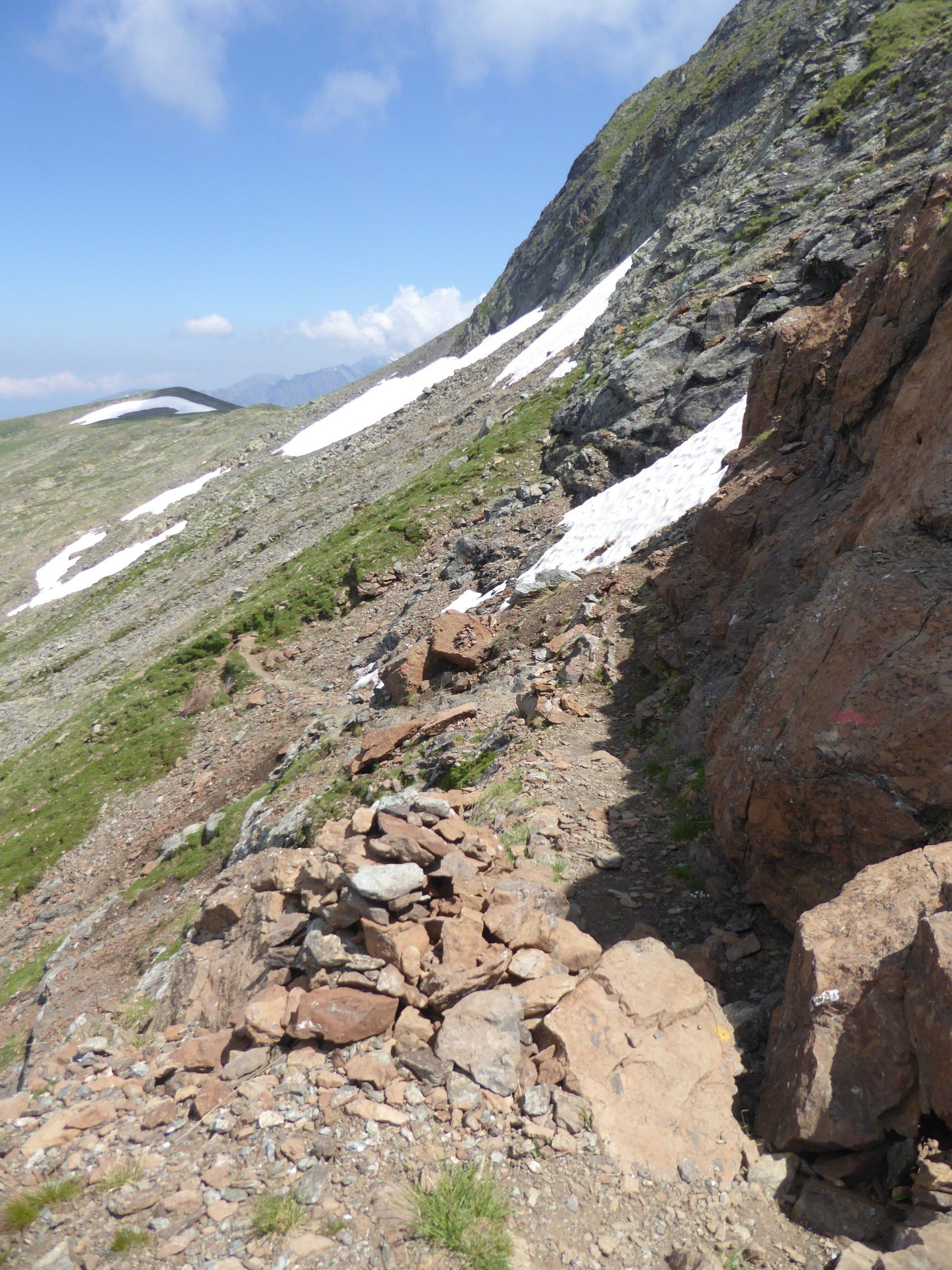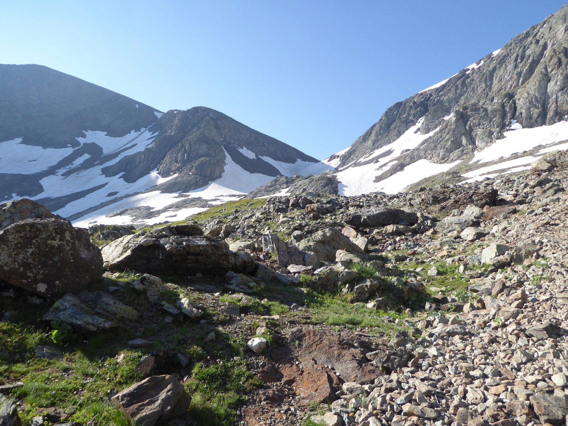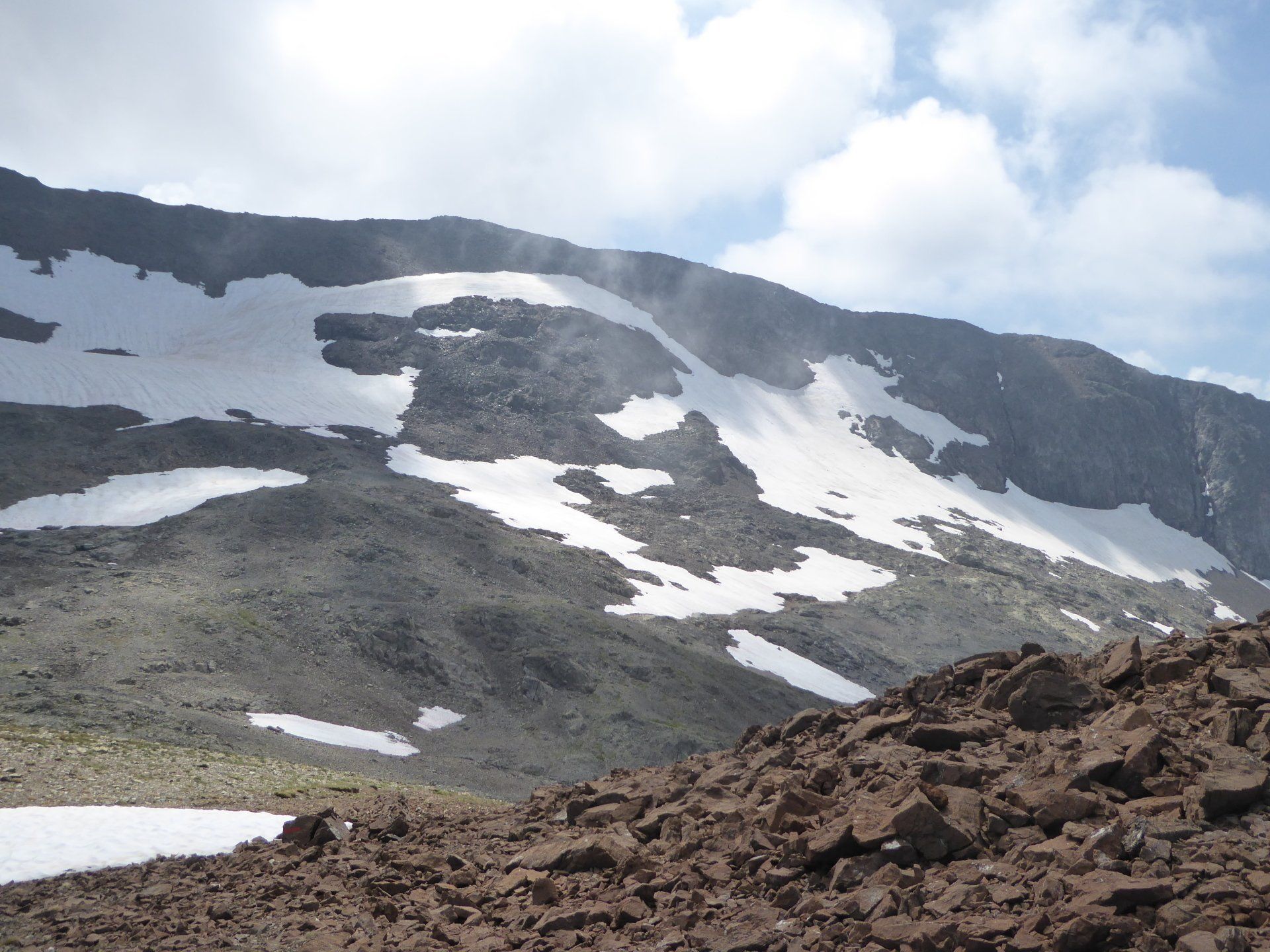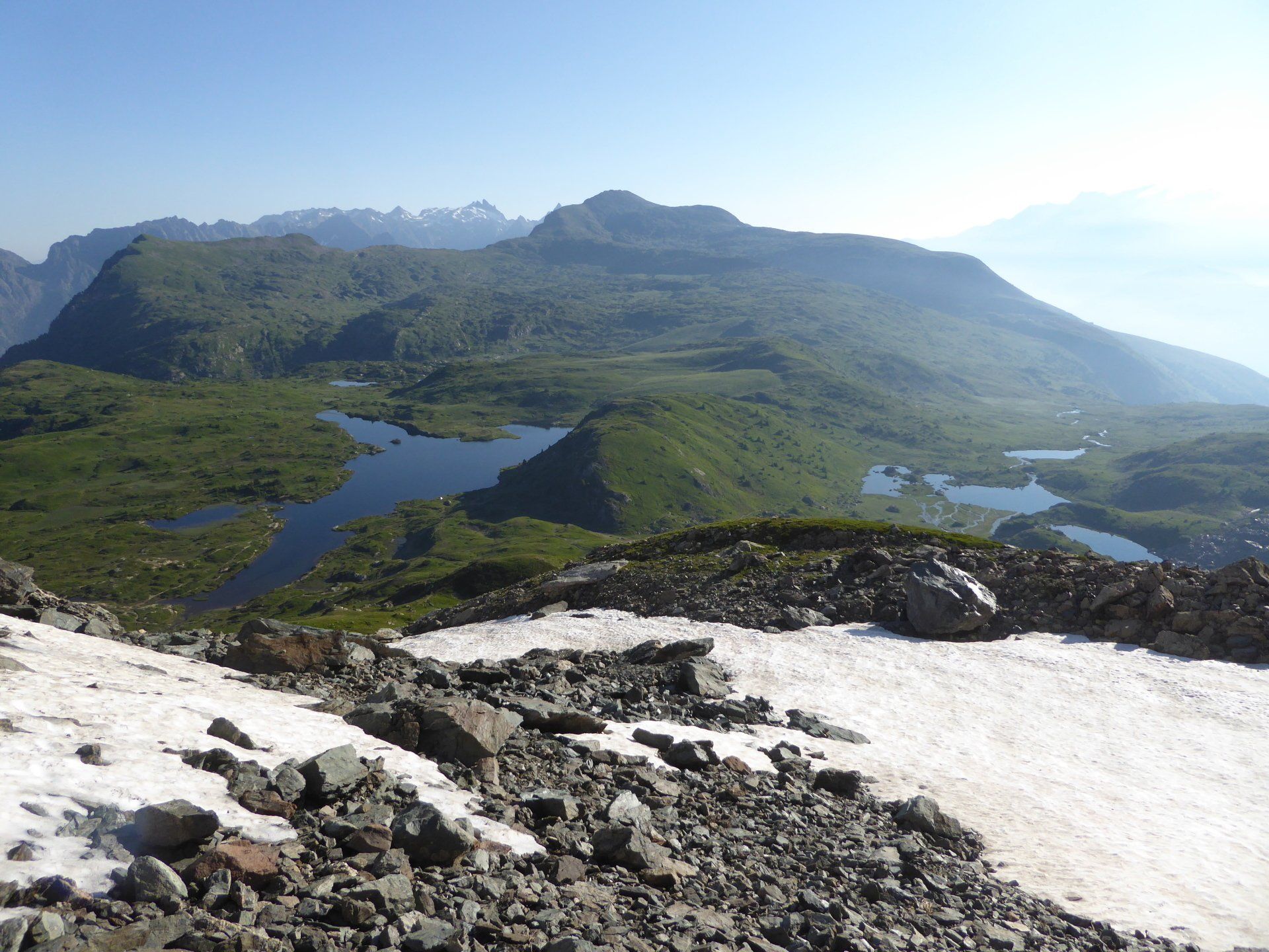 Nous n'avons pas pris nos équipements de neige. Les névés sont encore très présents. A la montée, nous profitons de la moindre langue de rochers qui émergent de la neige pour éviter de marcher sur la neige glissante. Cela nous mène à faire des "pieds et des mains" dans des amas de rochers pour éviter la glissade sur la neige. Nous décidons de ne pas reprendre le même chemin pour le retour, ça ne serait pas raisonnable. Le choix s'impose donc à nous de faire la grande boucle.