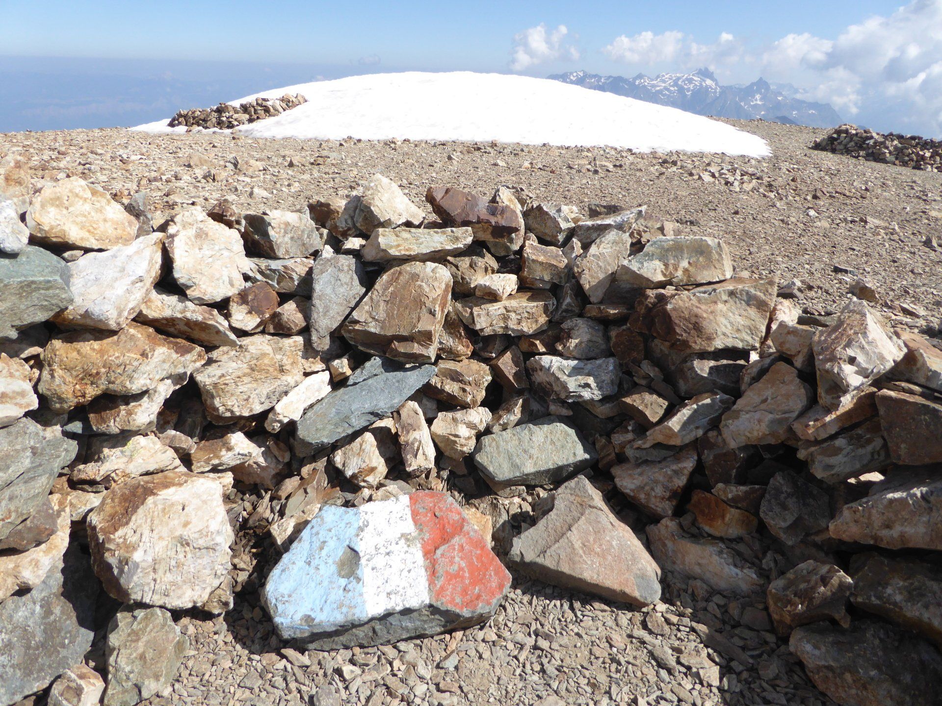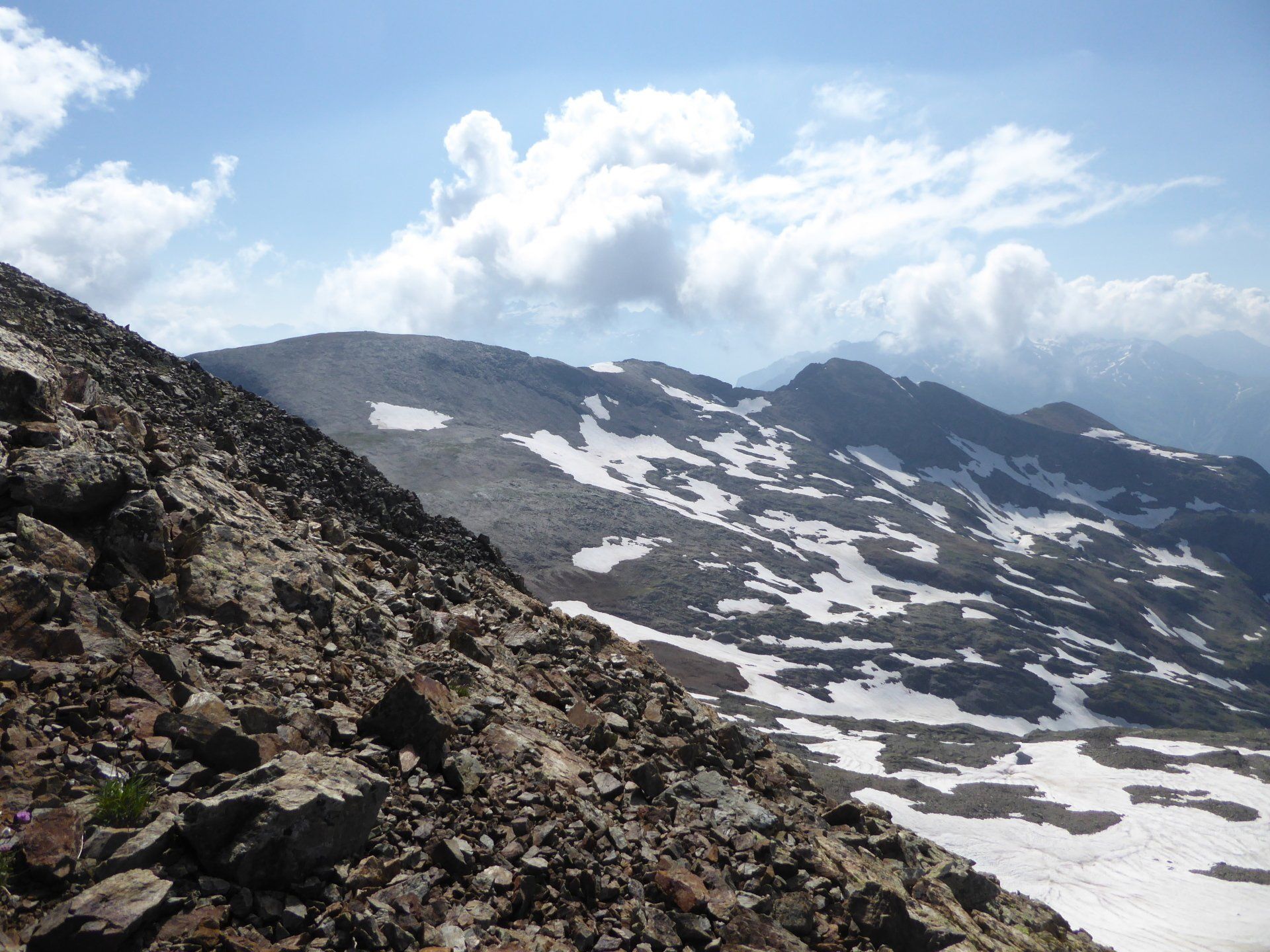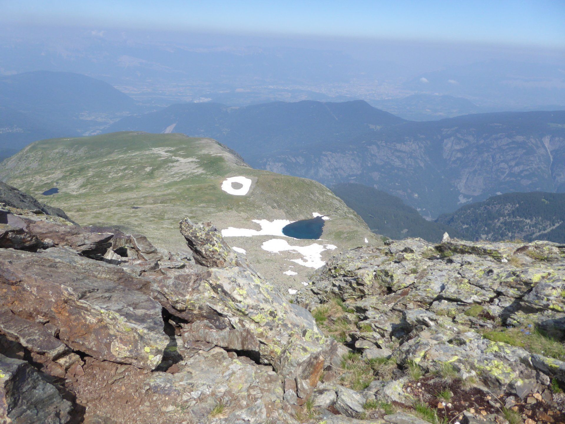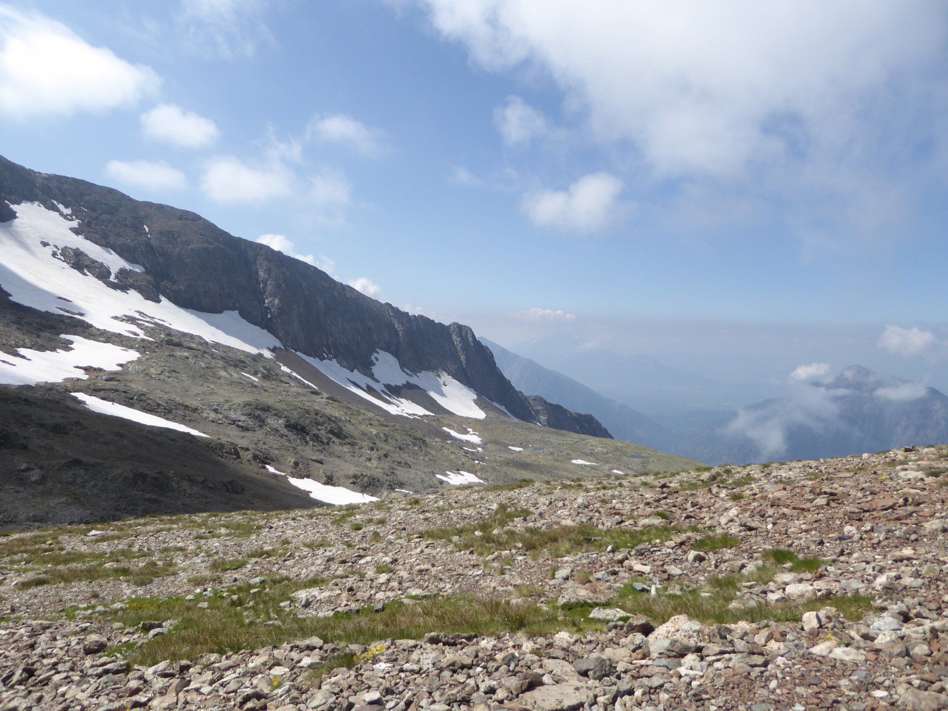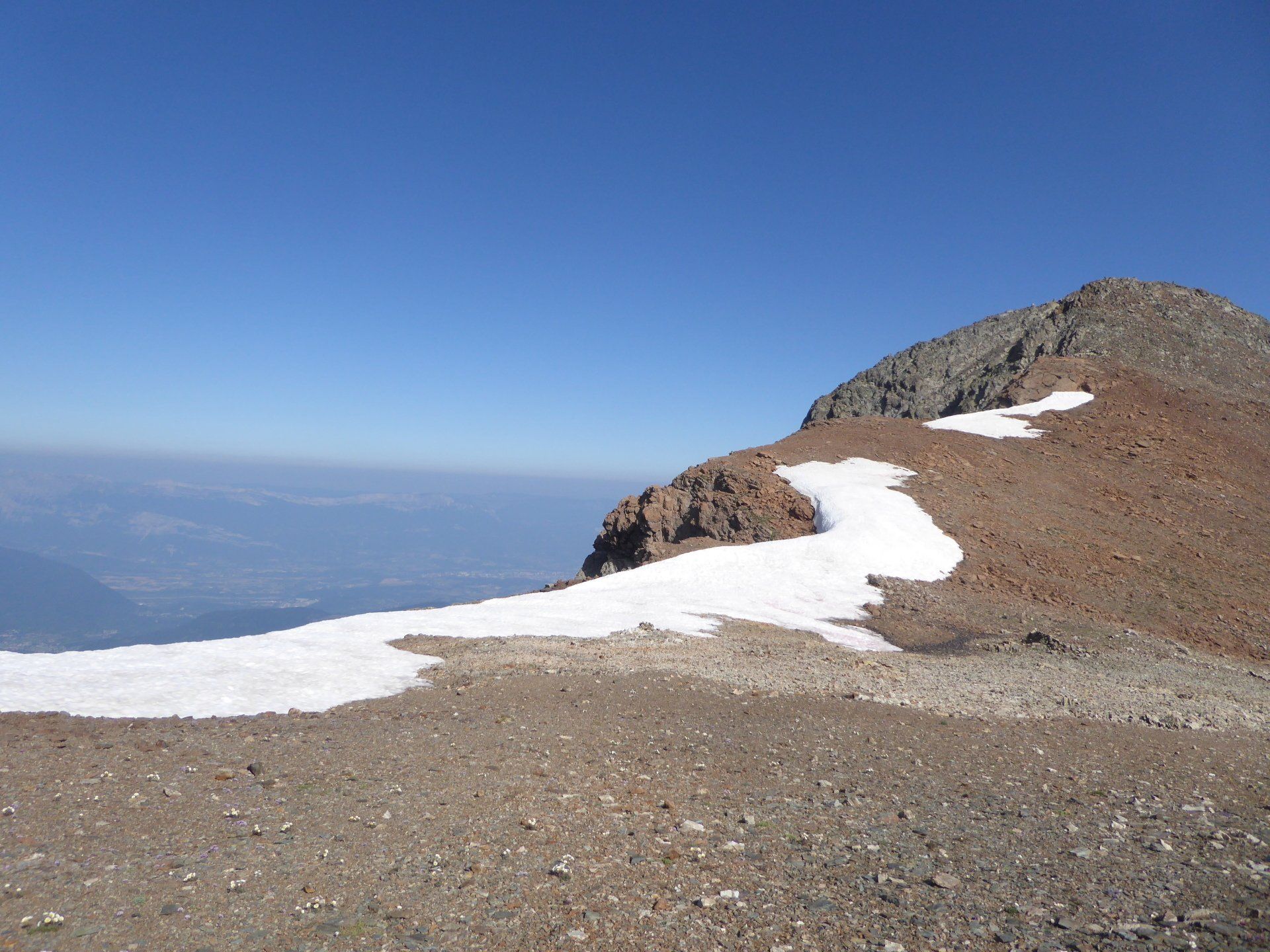 Nous n'avons pas pris nos équipements de neige. Les névés sont encore très présents. A la montée, nous profitons de la moindre langue de rochers qui émergent de la neige pour éviter de marcher sur la neige glissante. Cela nous mène à faire des "pieds et des mains" dans des amas de rochers pour éviter la glissade sur la neige. Nous décidons de ne pas reprendre le même chemin pour le retour, ça ne serait pas raisonnable. Le choix s'impose donc à nous de faire la grande boucle.