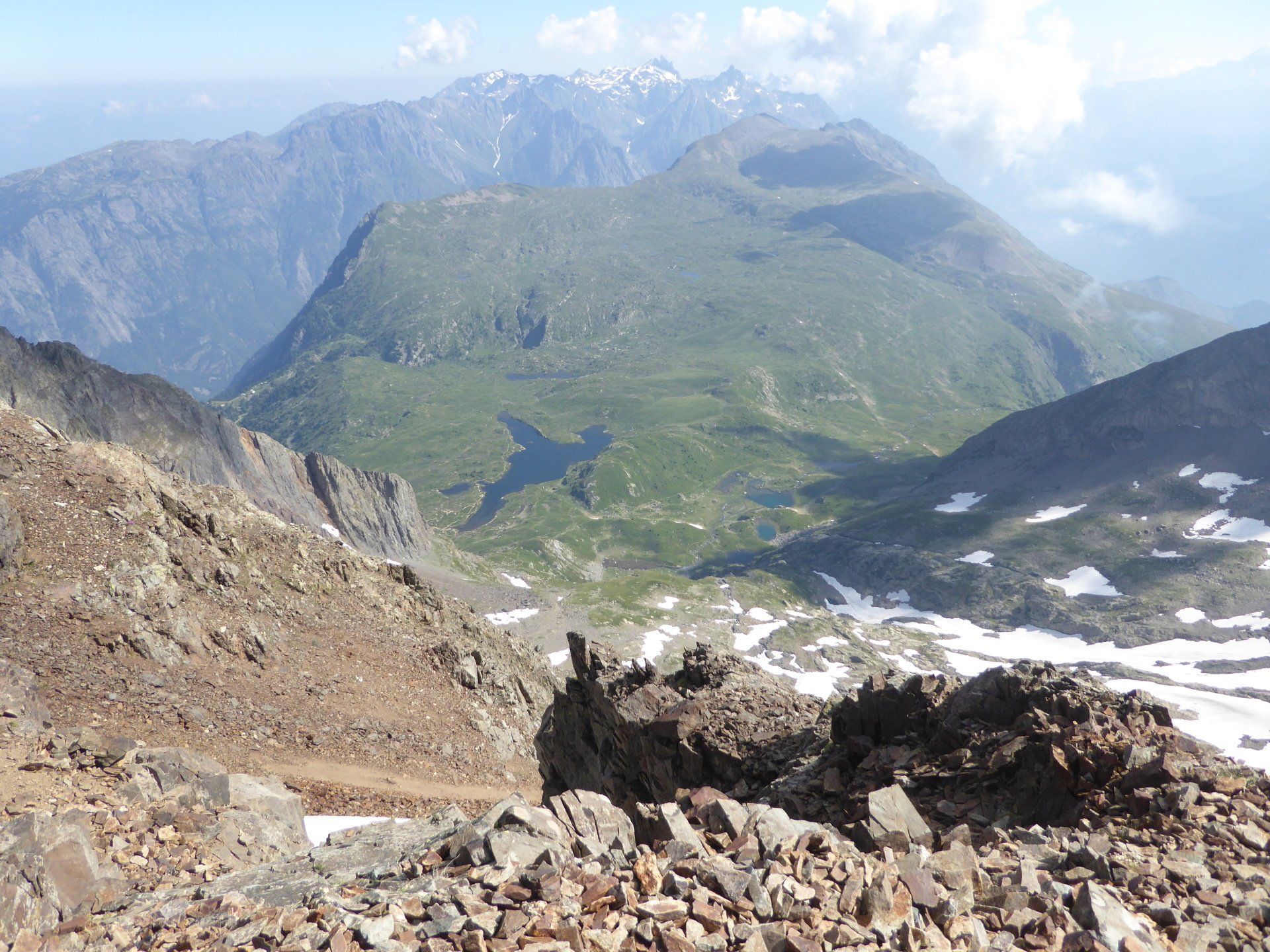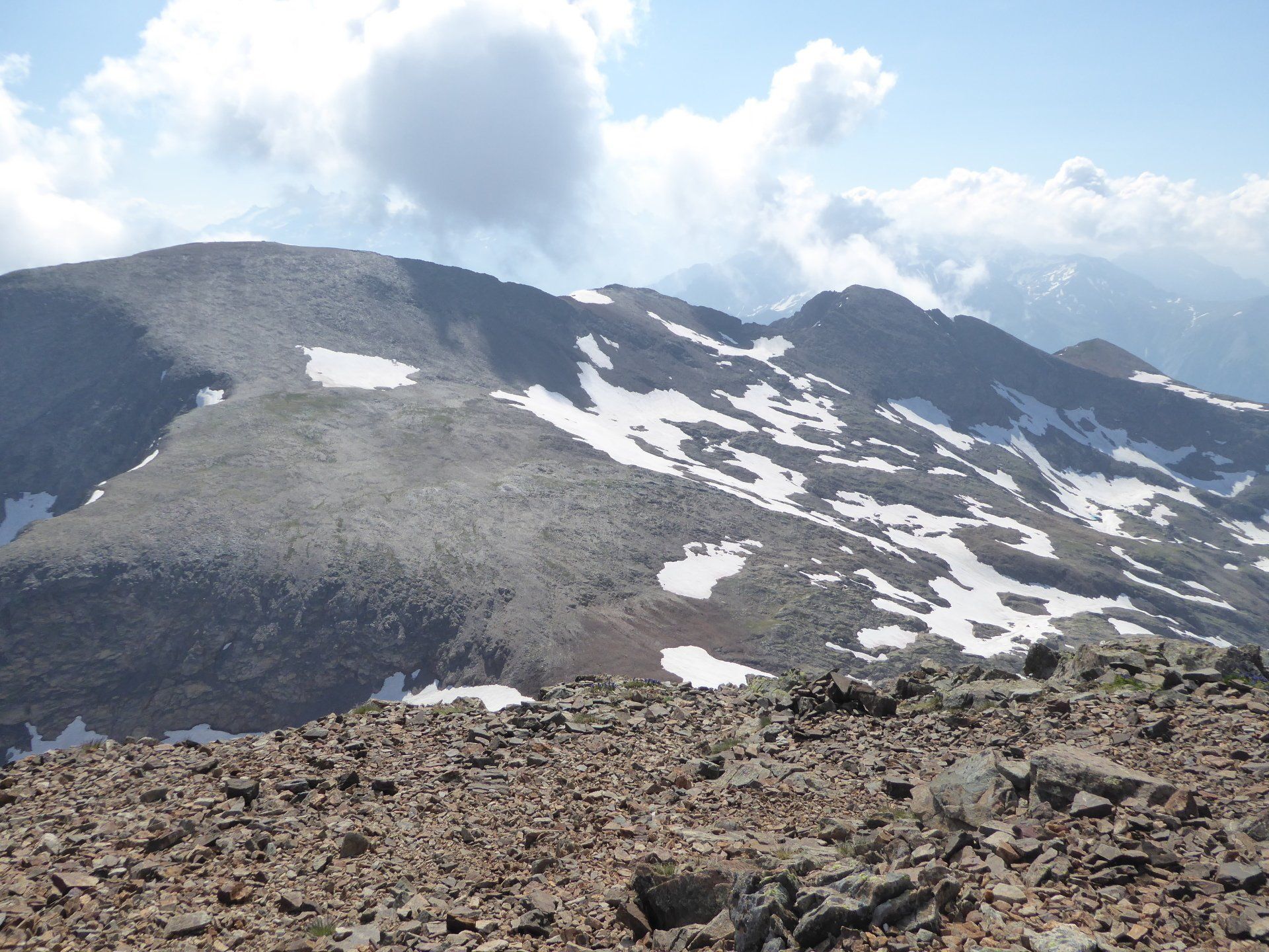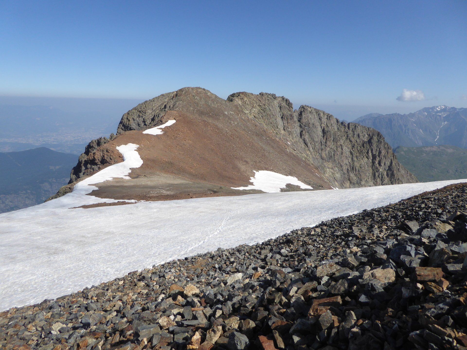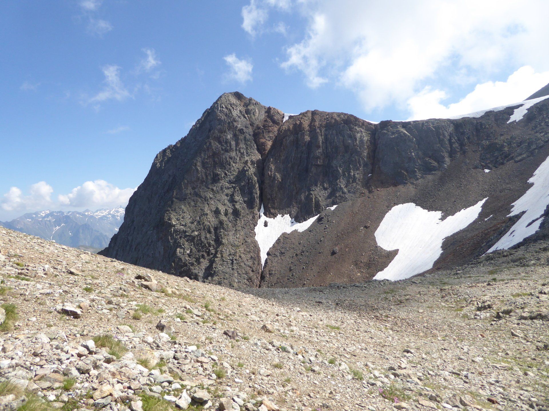 Nous n'avons pas pris nos équipements de neige. Les névés sont encore très présents. A la montée, nous profitons de la moindre langue de rochers qui émergent de la neige pour éviter de marcher sur la neige glissante. Cela nous mène à faire des "pieds et des mains" dans des amas de rochers pour éviter la glissade sur la neige. Nous décidons de ne pas reprendre le même chemin pour le retour, ça ne serait pas raisonnable. Le choix s'impose donc à nous de faire la grande boucle.