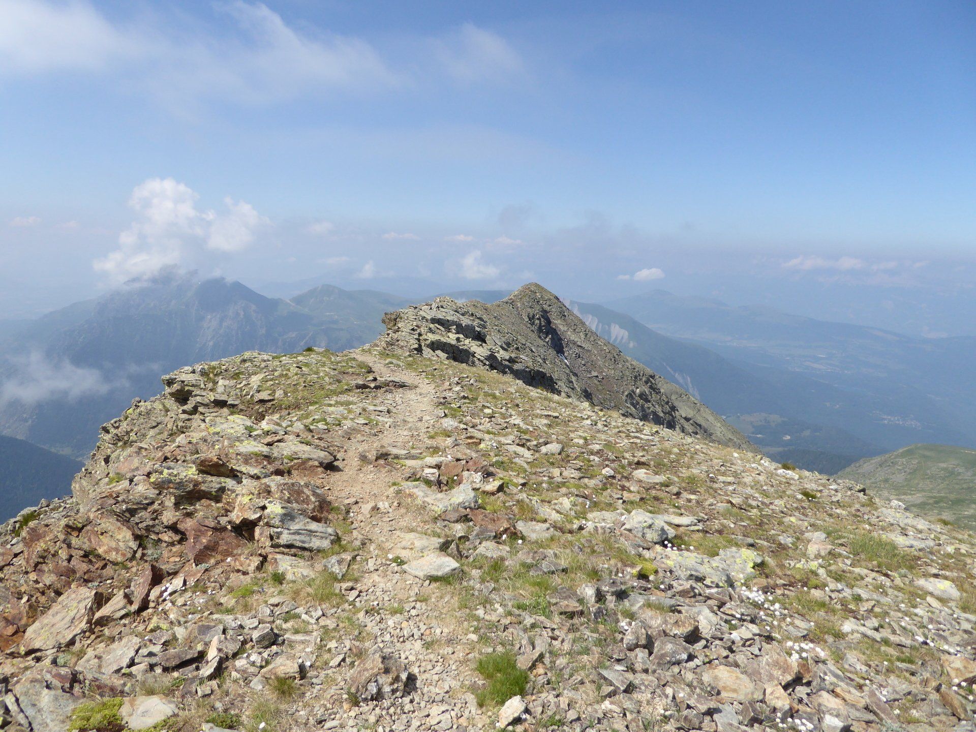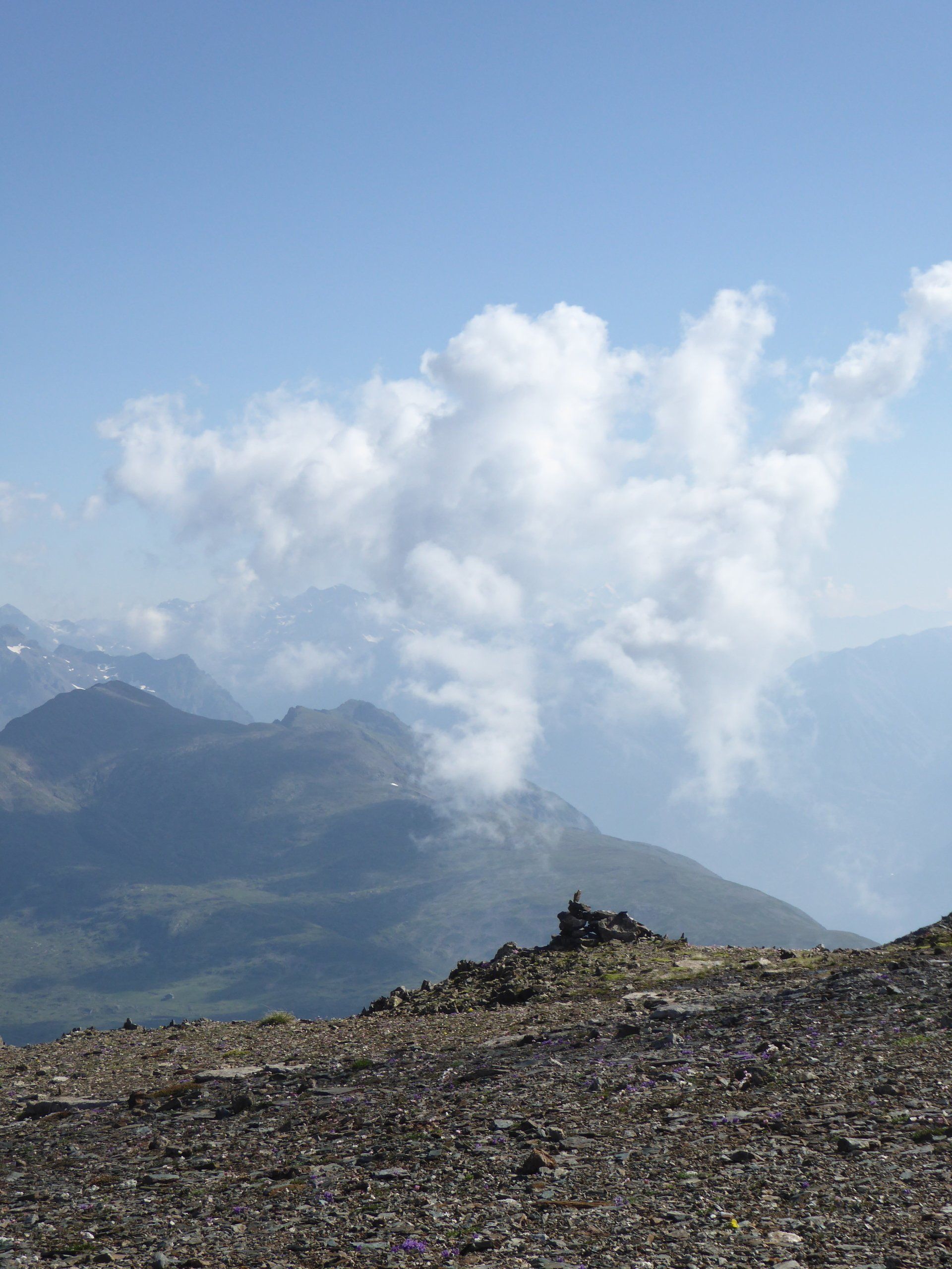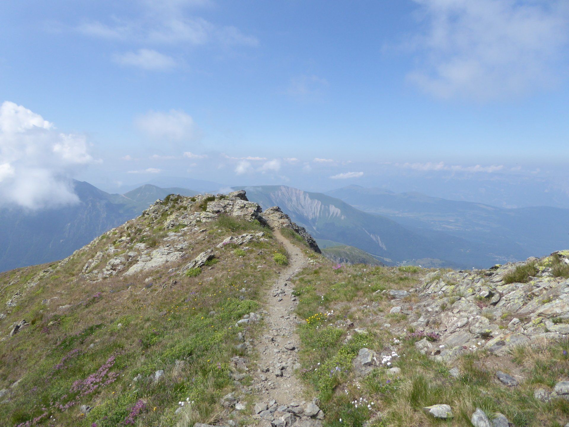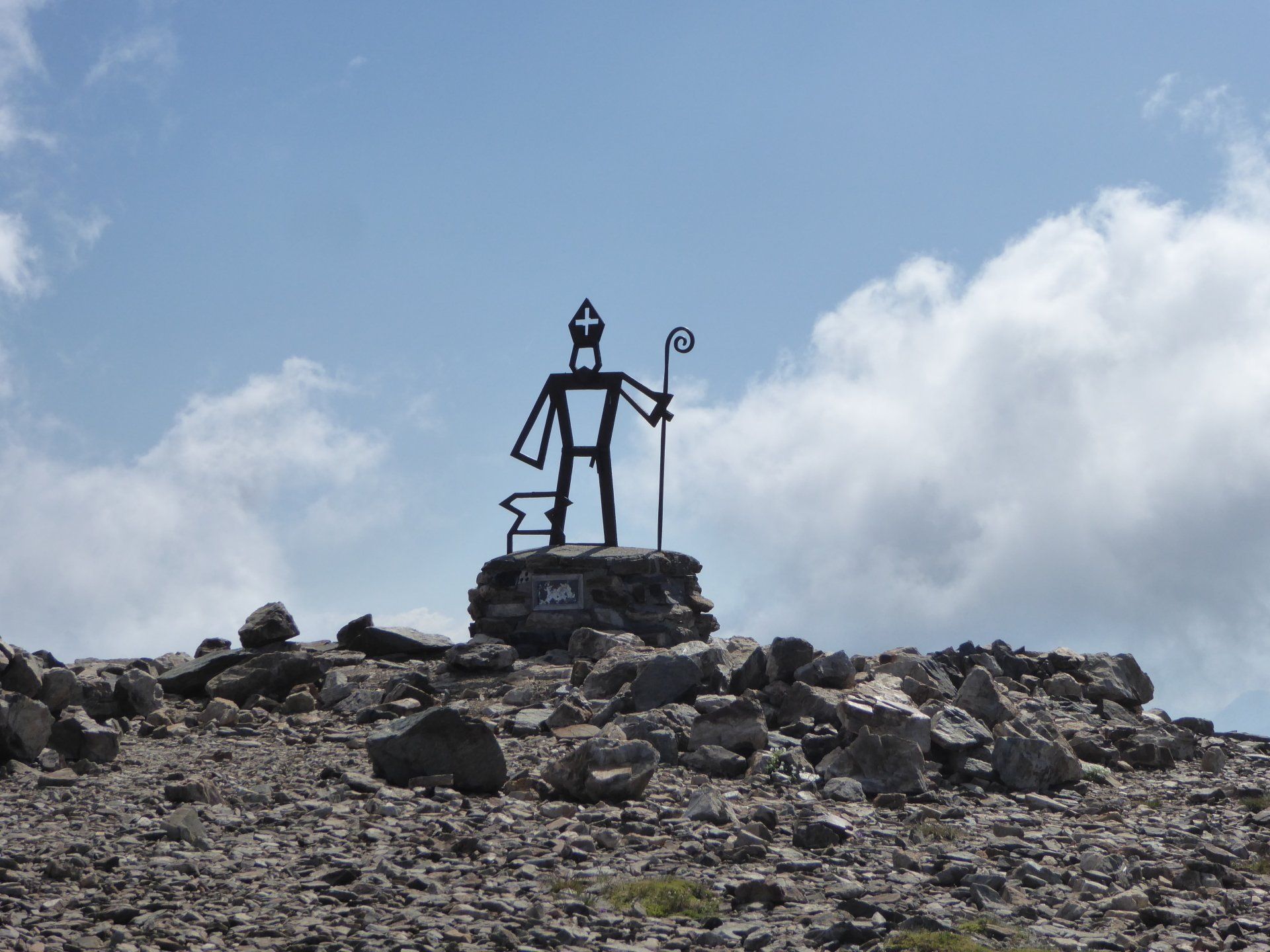 Nous arrivons au sommet par beau temps, avant que les nuages n'en prennent possession. Les randonneurs suivants, que nous croisons en redescendant, seront dans le brouillard.