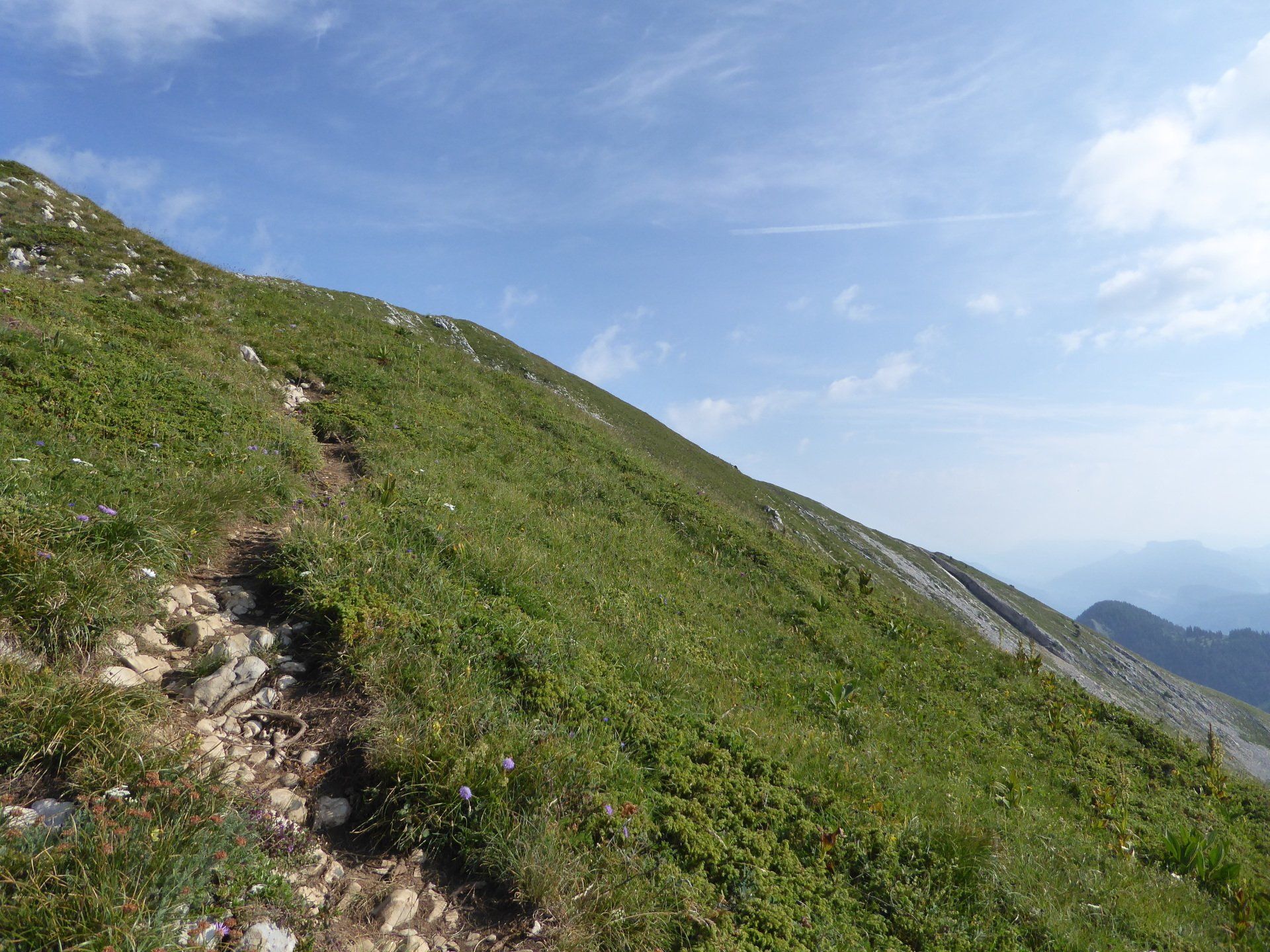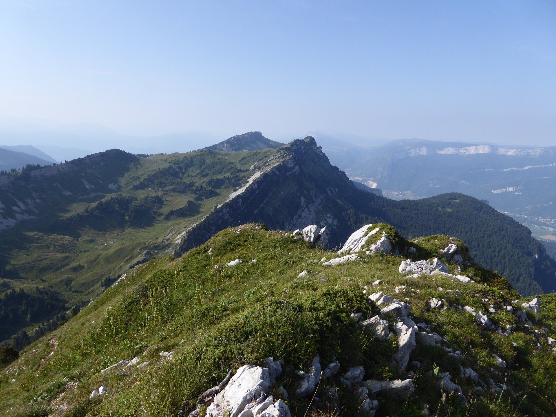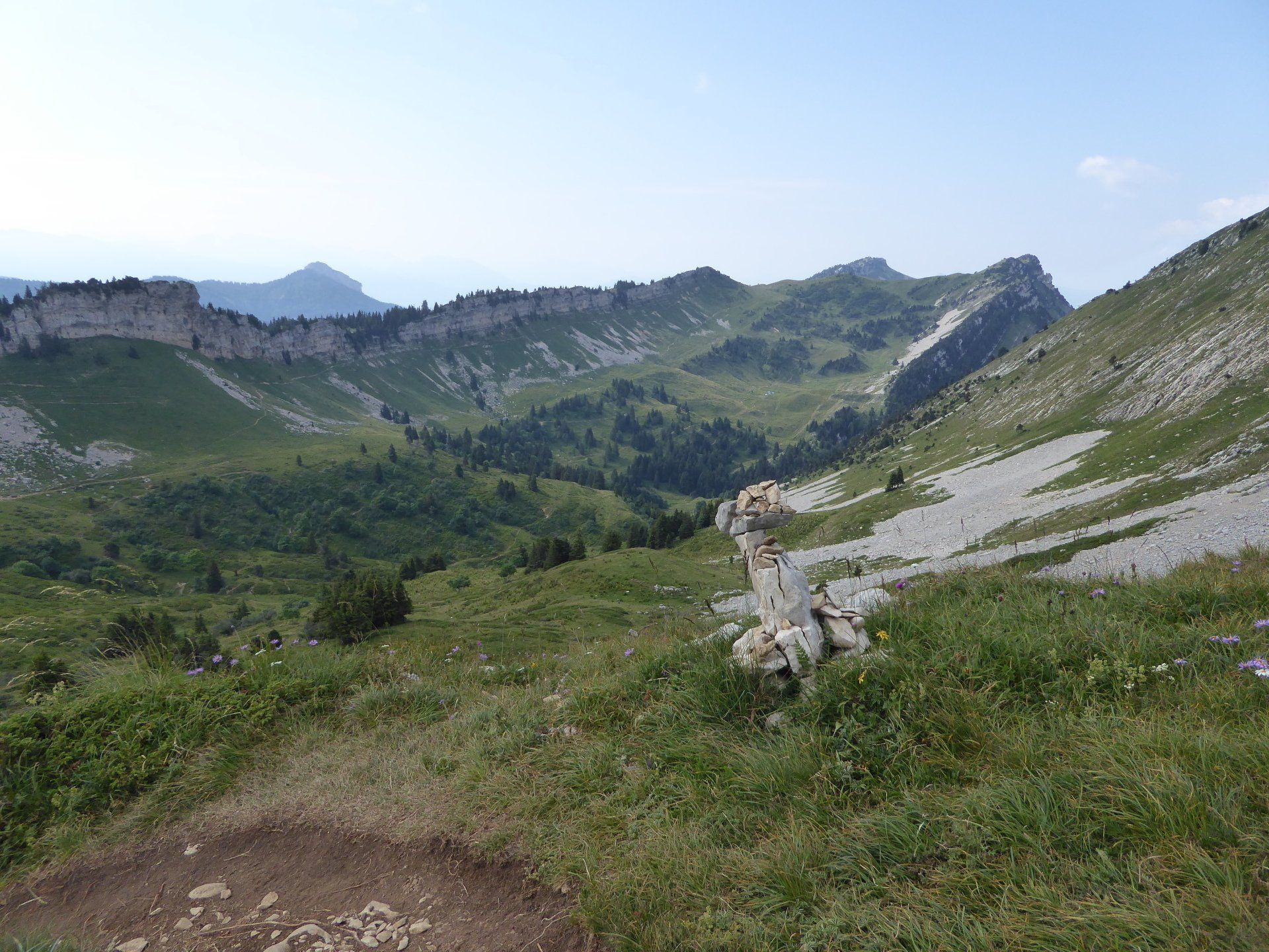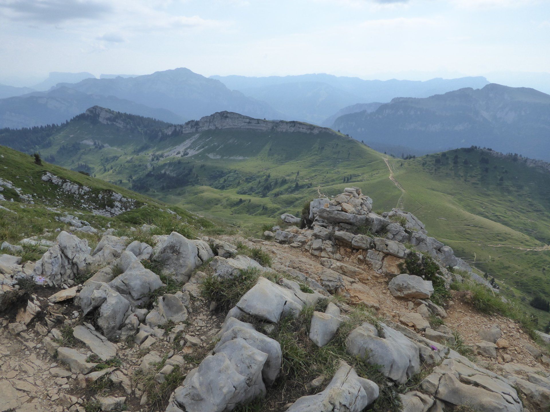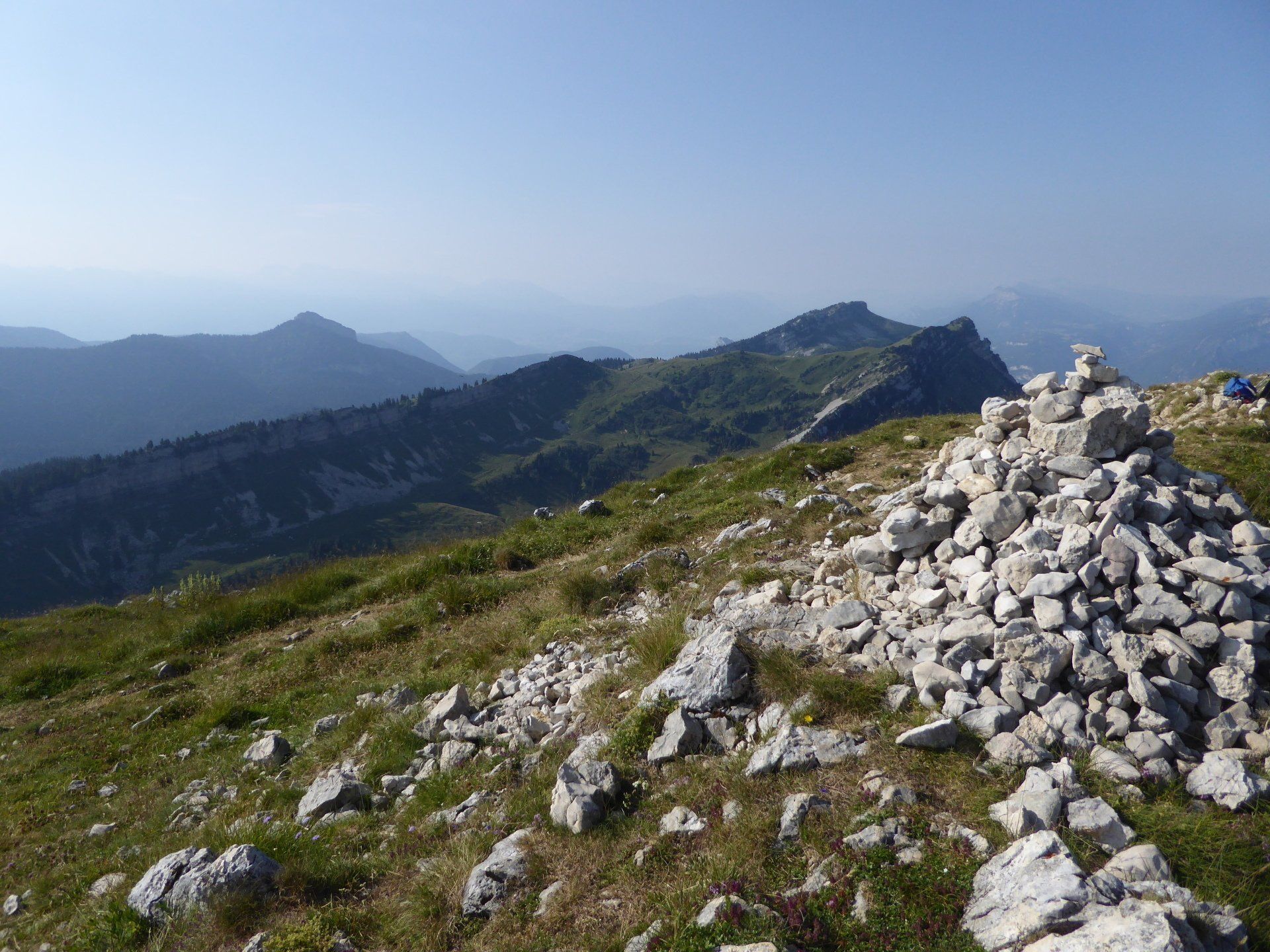 Le matin, nous rejoignons le vallon de la Grande Sure. La visibilité est bonne et nous permet de nous repérer dans cet entrelas de chemins de vaches. Nous repérons sans difficulté le pied de la crête à suivre. Quelques passages où les mains sont utiles mais sans être techniques. Le sommet est déjà occupé par un randonneur et un corbeau. En descendant vers le col de la Grande Vache nous croisons plusieurs groupes de randonneurs. Nos départs à l'aurore nous permettent de limiter les lieux fréquentés et de ne pas être ceux qui soufflent quand nous croisons d'autres personnes.