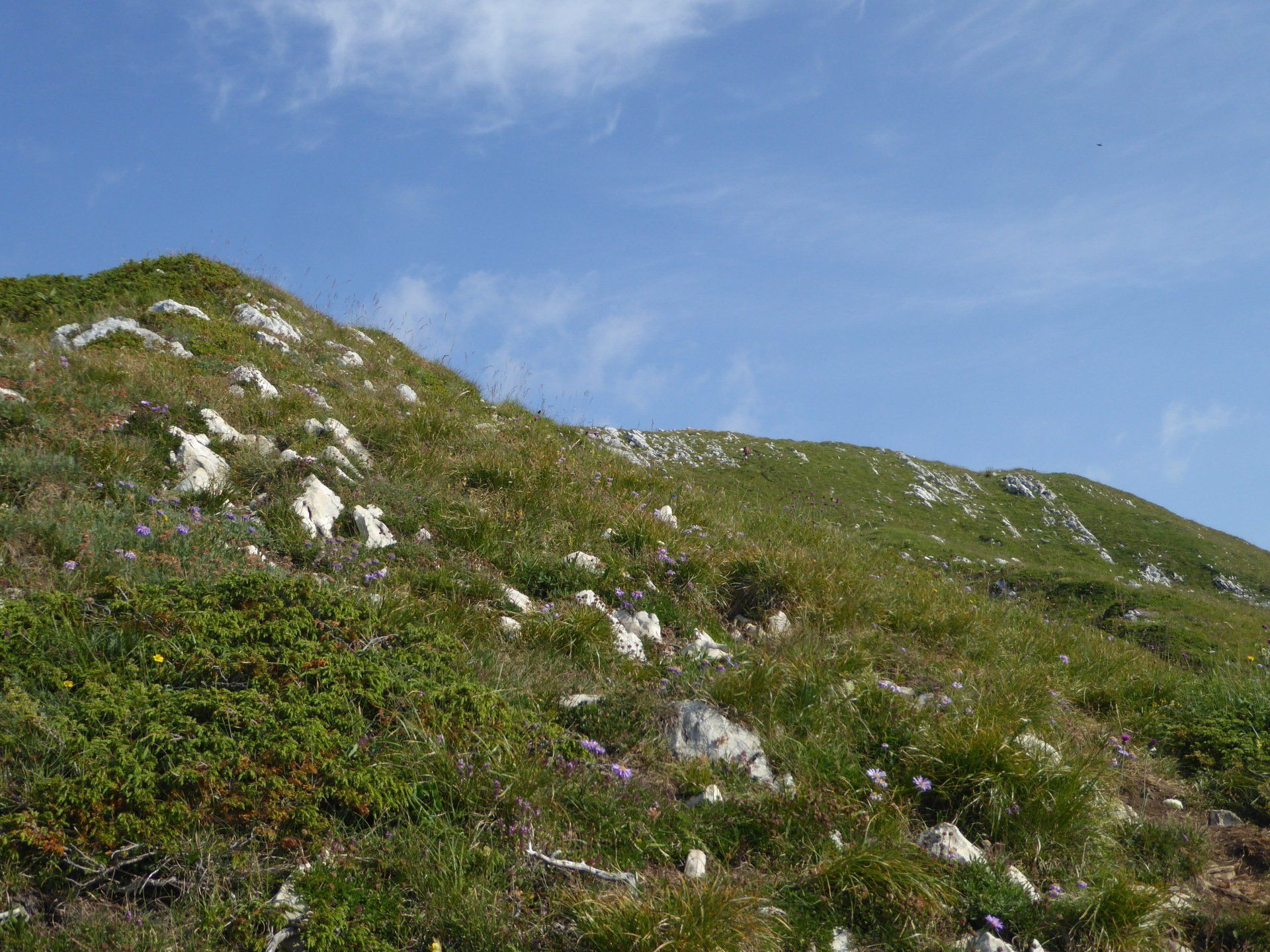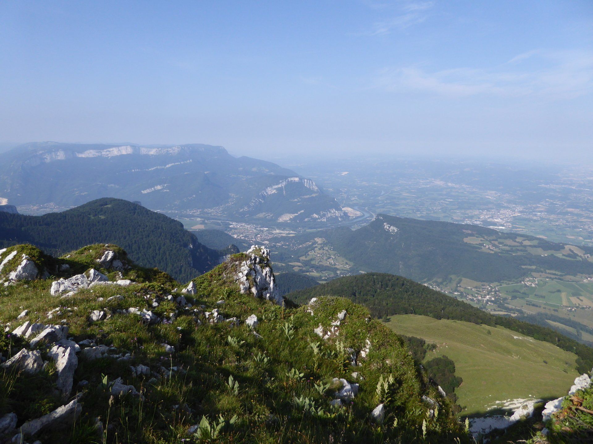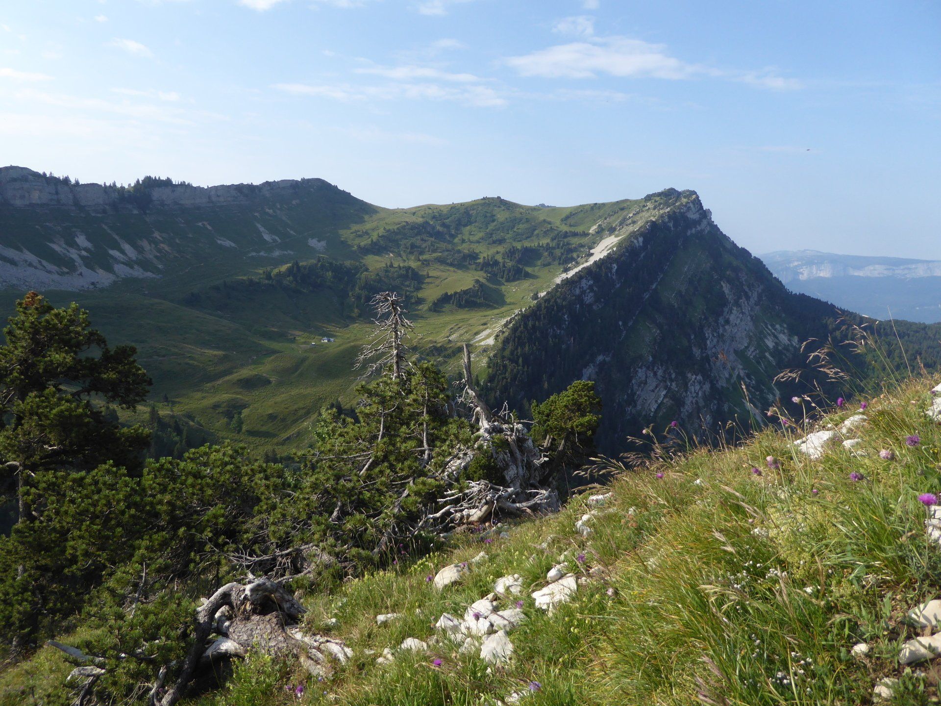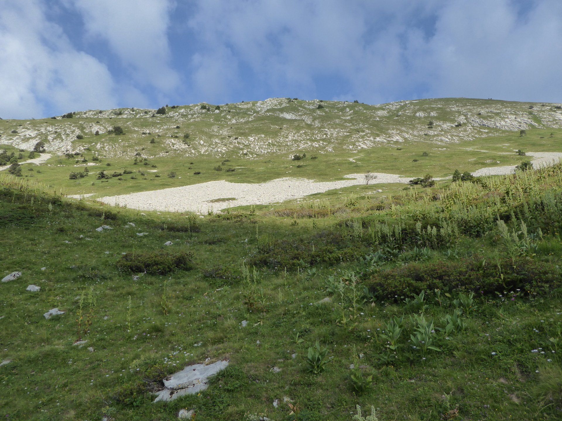 Le matin, nous rejoignons le vallon de la Grande Sure. La visibilité est bonne et nous permet de nous repérer dans cet entrelas de chemins de vaches. Nous repérons sans difficulté le pied de la crête à suivre. Quelques passages où les mains sont utiles mais sans être techniques. Le sommet est déjà occupé par un randonneur et un corbeau. En descendant vers le col de la Grande Vache nous croisons plusieurs groupes de randonneurs. Nos départs à l'aurore nous permettent de limiter les lieux fréquentés et de ne pas être ceux qui soufflent quand nous croisons d'autres personnes.