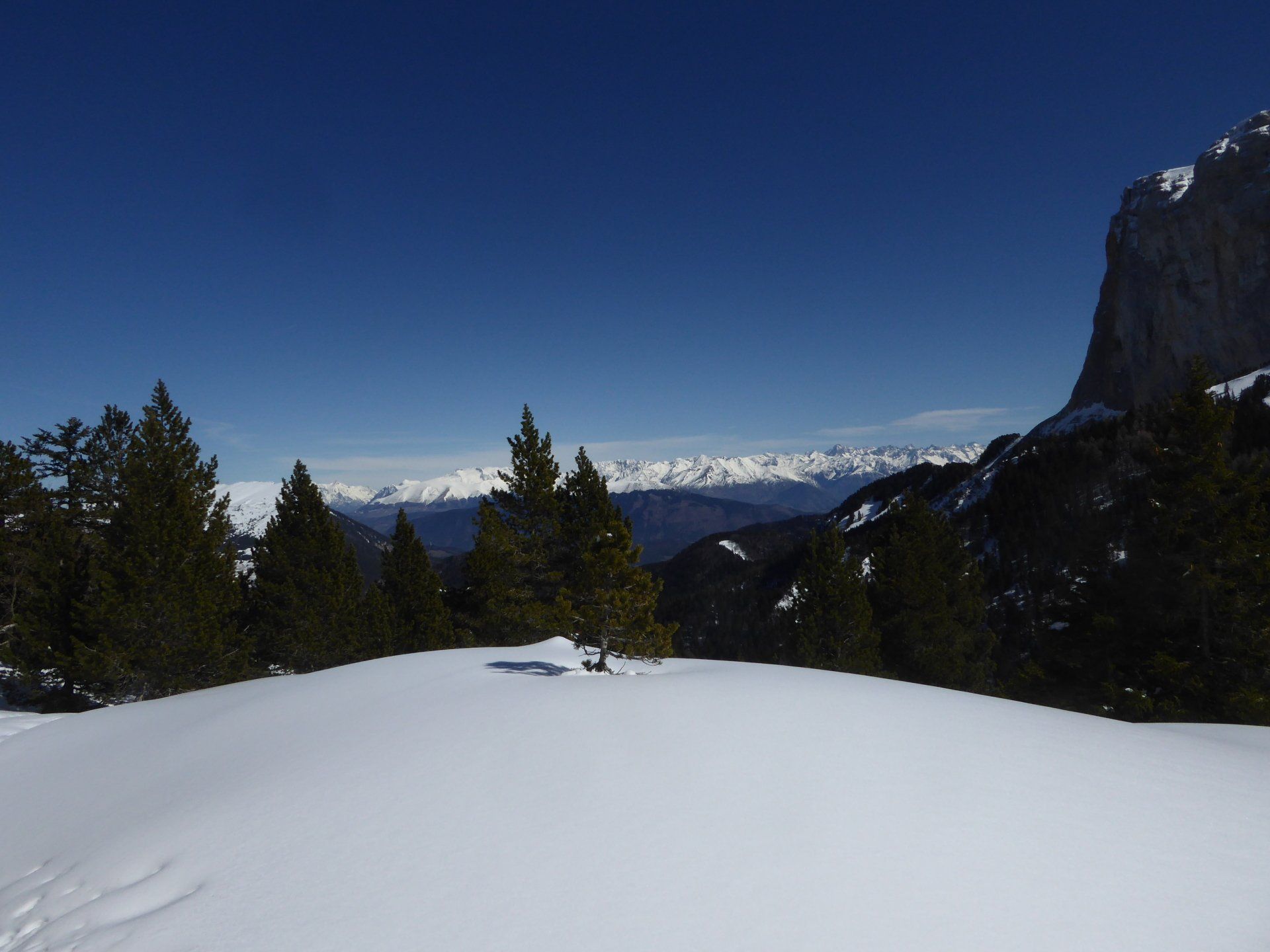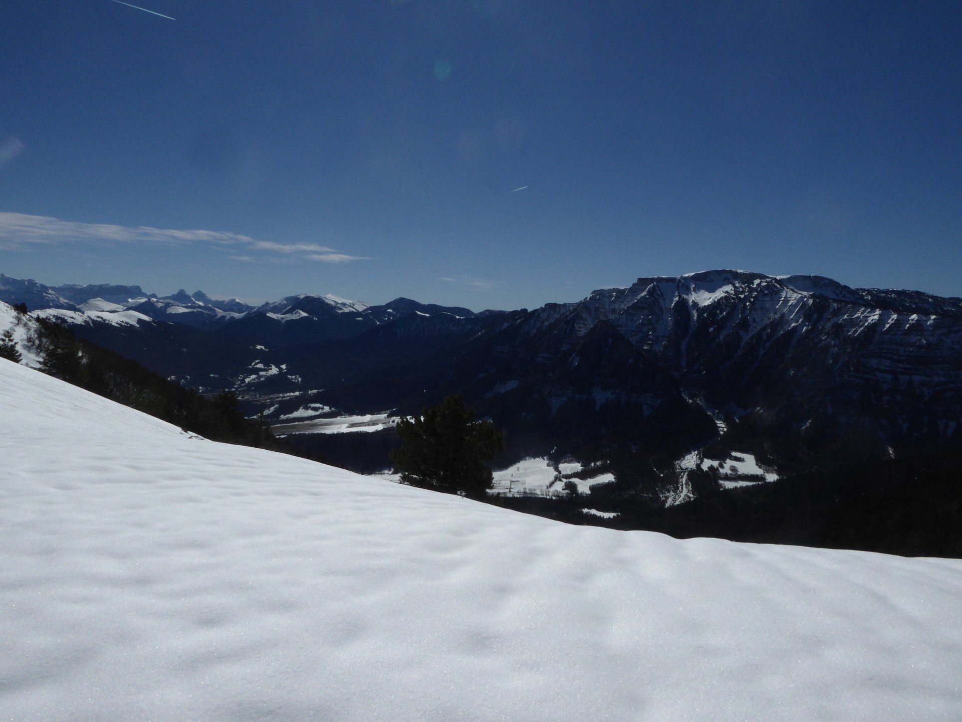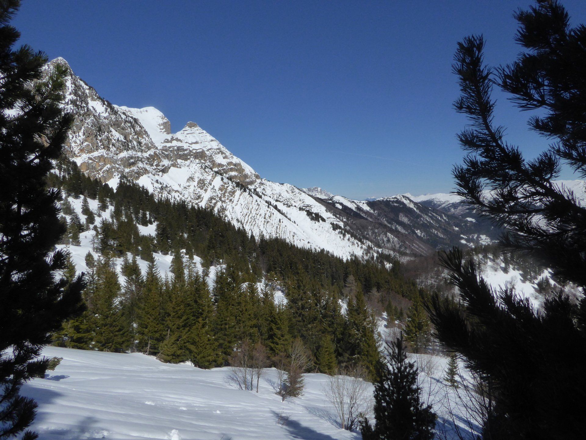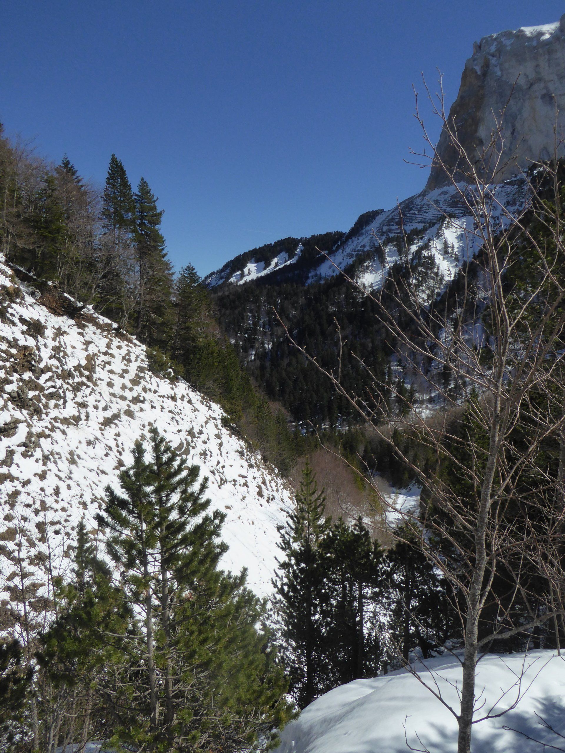 Nous nous sommes égarés avant le Col, arrivés en hors trace. La vue sur l'autre vallée et sur l'Obiou est de toute beauté. Nous cherchons le chemin pour rejoindre le Pas des Bachassons. Nous ne le trouverons jamais. Traversées de zones boisées, nous montons puis, pour éviter des langues de neige incertaines, nous redescendons, et remontons à plusieurs reprises. Le dévers sollicite nos chevilles jusqu'à ce qu'au loin nous repérions un skieur qui descend. Avant de rejoindre sa trace, nous entendons une avalanche qui se déclenche. Il y a plusieurs coulées dans le coin. Bien fatigués par nos zigzags, nous abandonnons notre objectif de relier le Pas des Bachassons. Petite pause casse-croûte. Tee shirt de rigueur tellement il fait bon. Pour descendre, nous suivons la trace de skieurs de randonnée qui sont montés par là. Les quarts de nos raquettes sont moins efficaces que les quarts des skis de randonnées et certains passages sont acrobatiques mais nous sommes bien contents d'avoir trouvé ces traces. La neige glisse, comme si elle roulait sur elle-même. Heureusement, le soleil et le ciel bleu nous auront accompagnés tout du long.