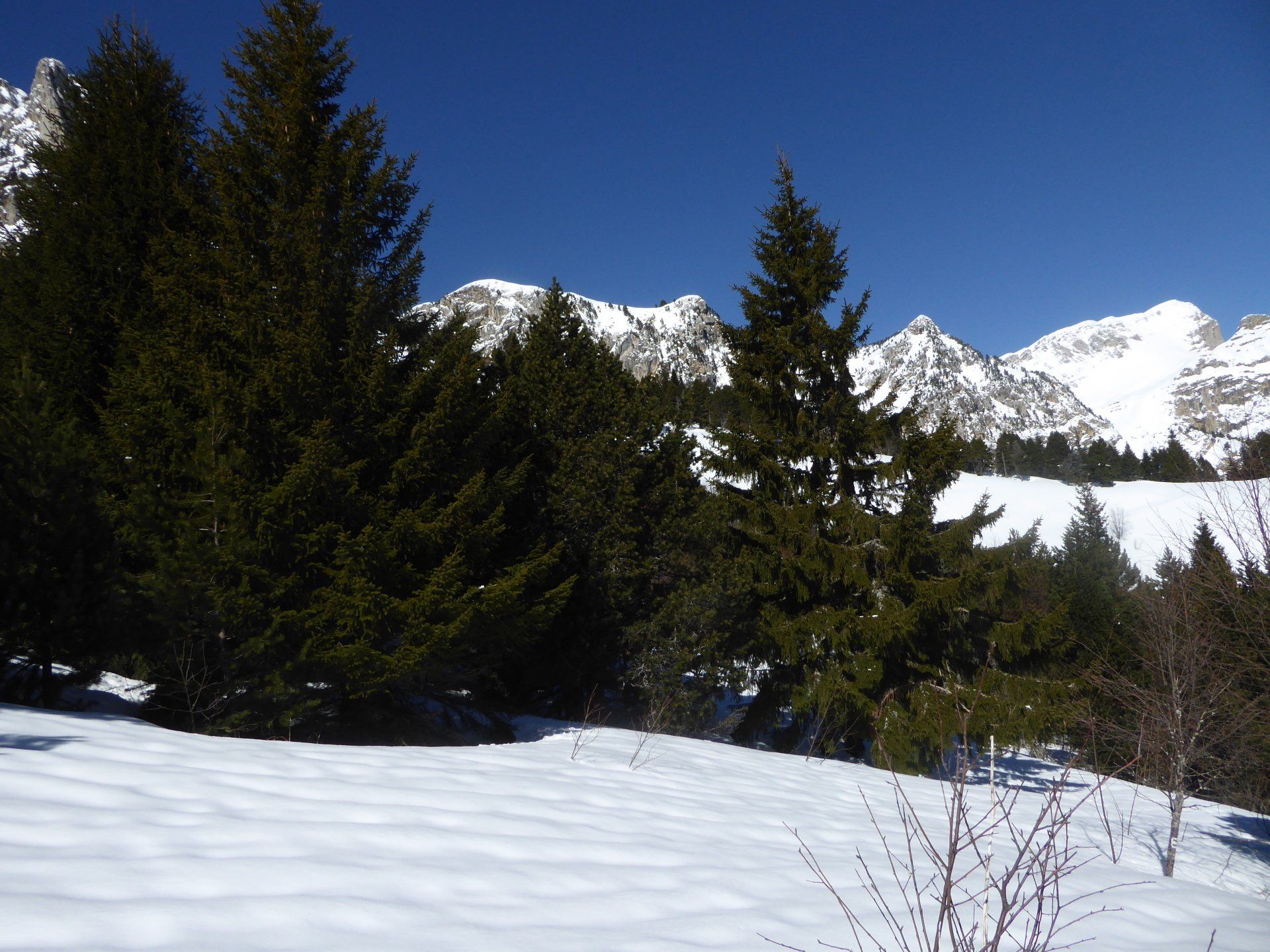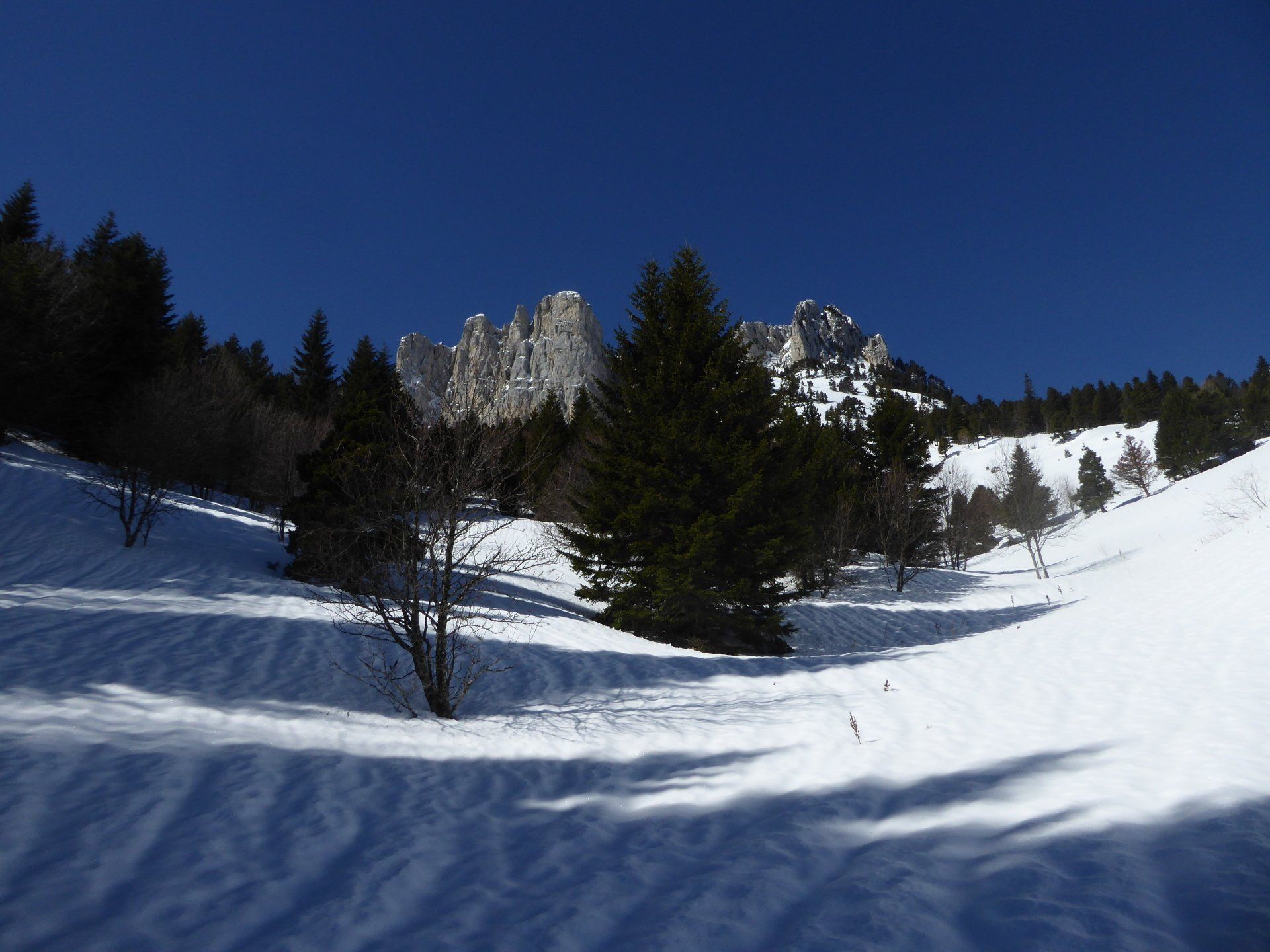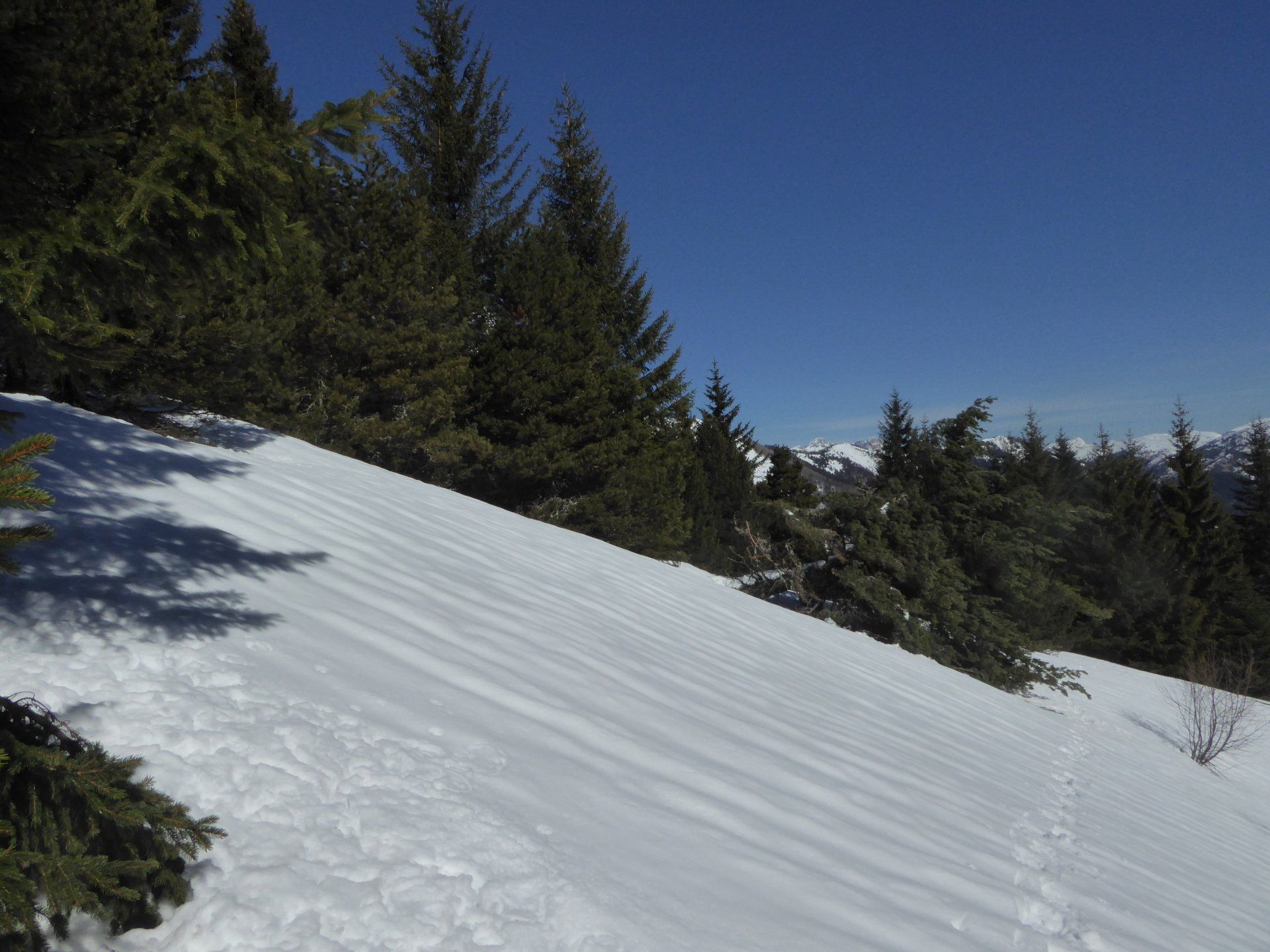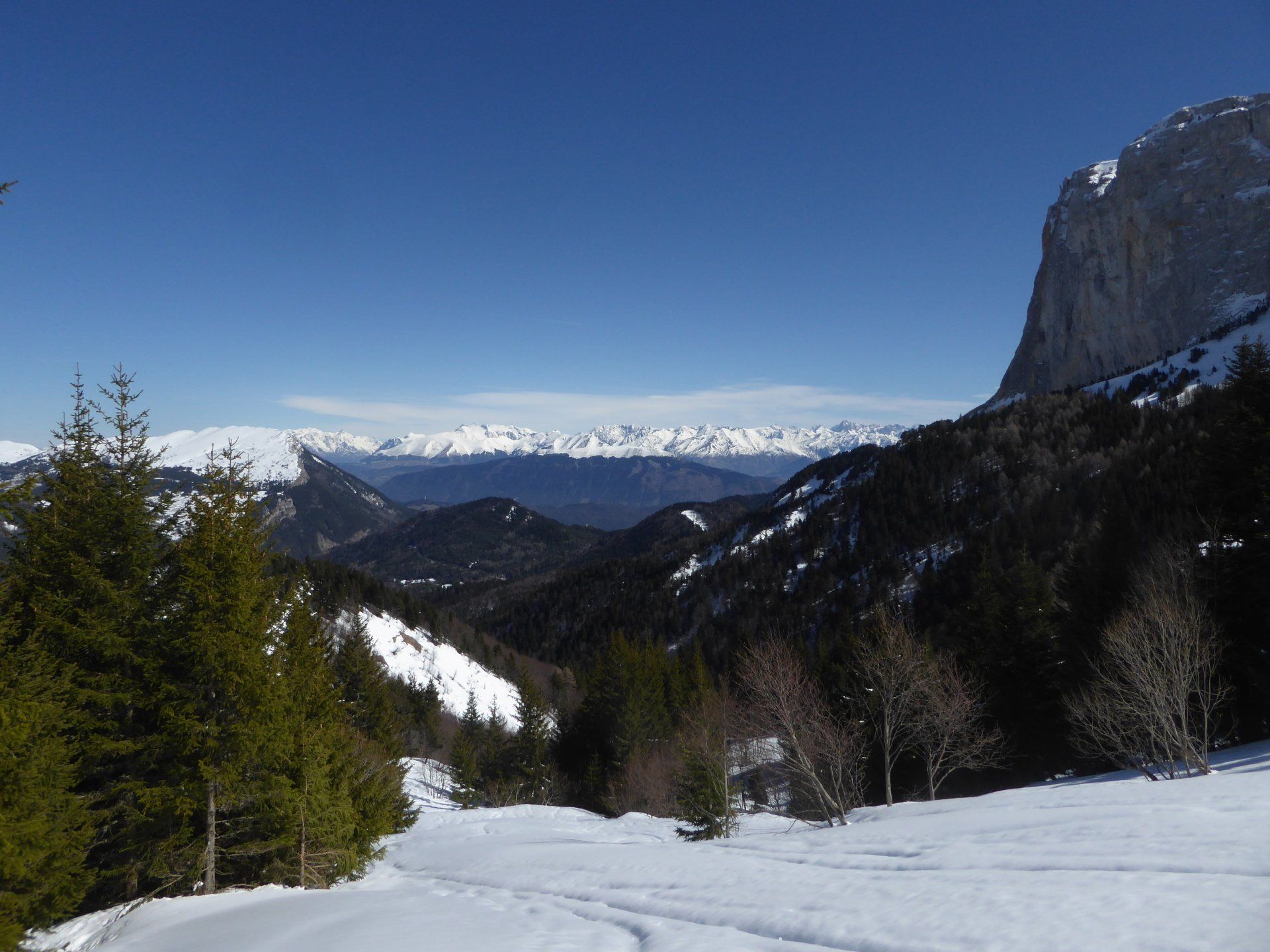 Nous nous sommes égarés avant le Col, arrivés en hors trace. La vue sur l'autre vallée et sur l'Obiou est de toute beauté. Nous cherchons le chemin pour rejoindre le Pas des Bachassons. Nous ne le trouverons jamais. Traversées de zones boisées, nous montons puis, pour éviter des langues de neige incertaines, nous redescendons, et remontons à plusieurs reprises. Le dévers sollicite nos chevilles jusqu'à ce qu'au loin nous repérions un skieur qui descend. Avant de rejoindre sa trace, nous entendons une avalanche qui se déclenche. Il y a plusieurs coulées dans le coin. Bien fatigués par nos zigzags, nous abandonnons notre objectif de relier le Pas des Bachassons. Petite pause casse-croûte. Tee shirt de rigueur tellement il fait bon. Pour descendre, nous suivons la trace de skieurs de randonnée qui sont montés par là. Les quarts de nos raquettes sont moins efficaces que les quarts des skis de randonnées et certains passages sont acrobatiques mais nous sommes bien contents d'avoir trouvé ces traces. La neige glisse, comme si elle roulait sur elle-même. Heureusement, le soleil et le ciel bleu nous auront accompagnés tout du long.