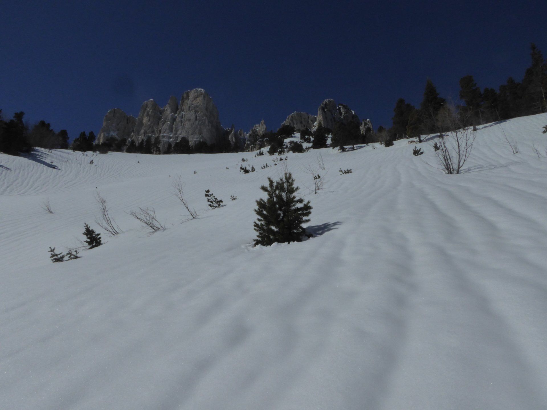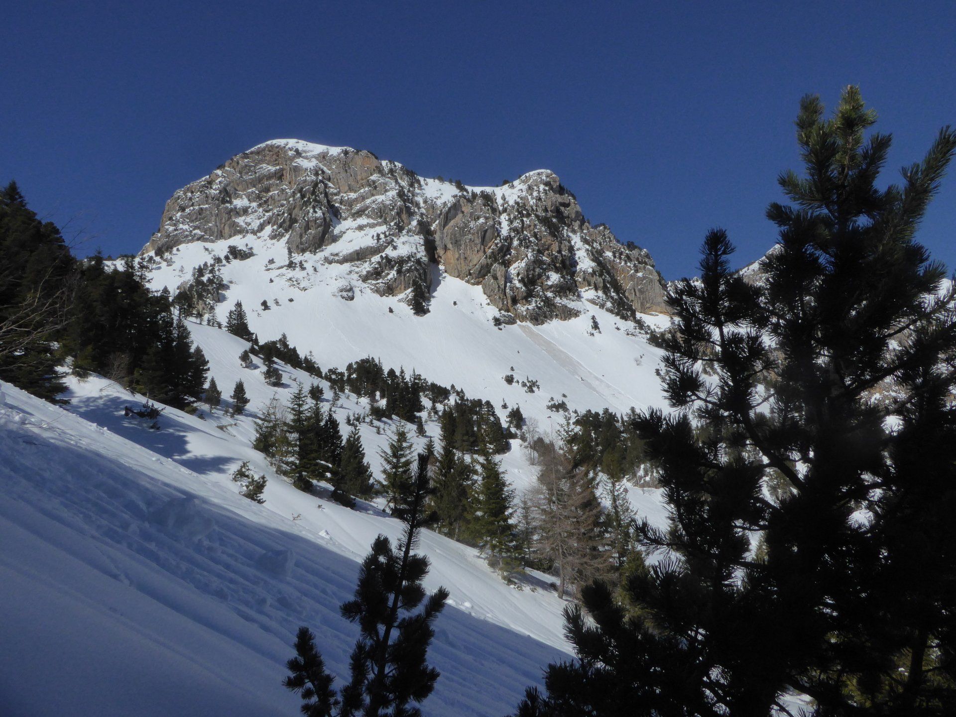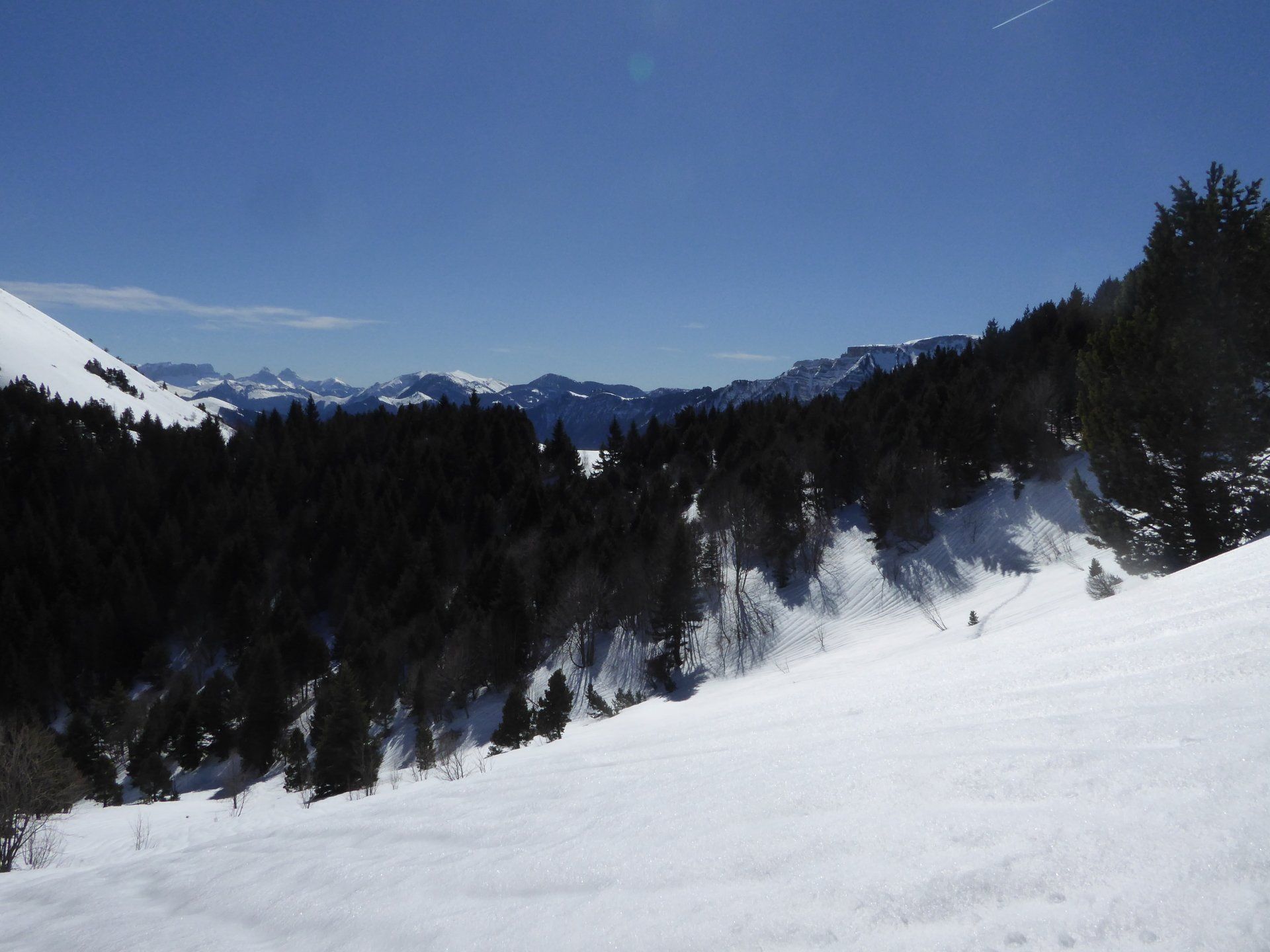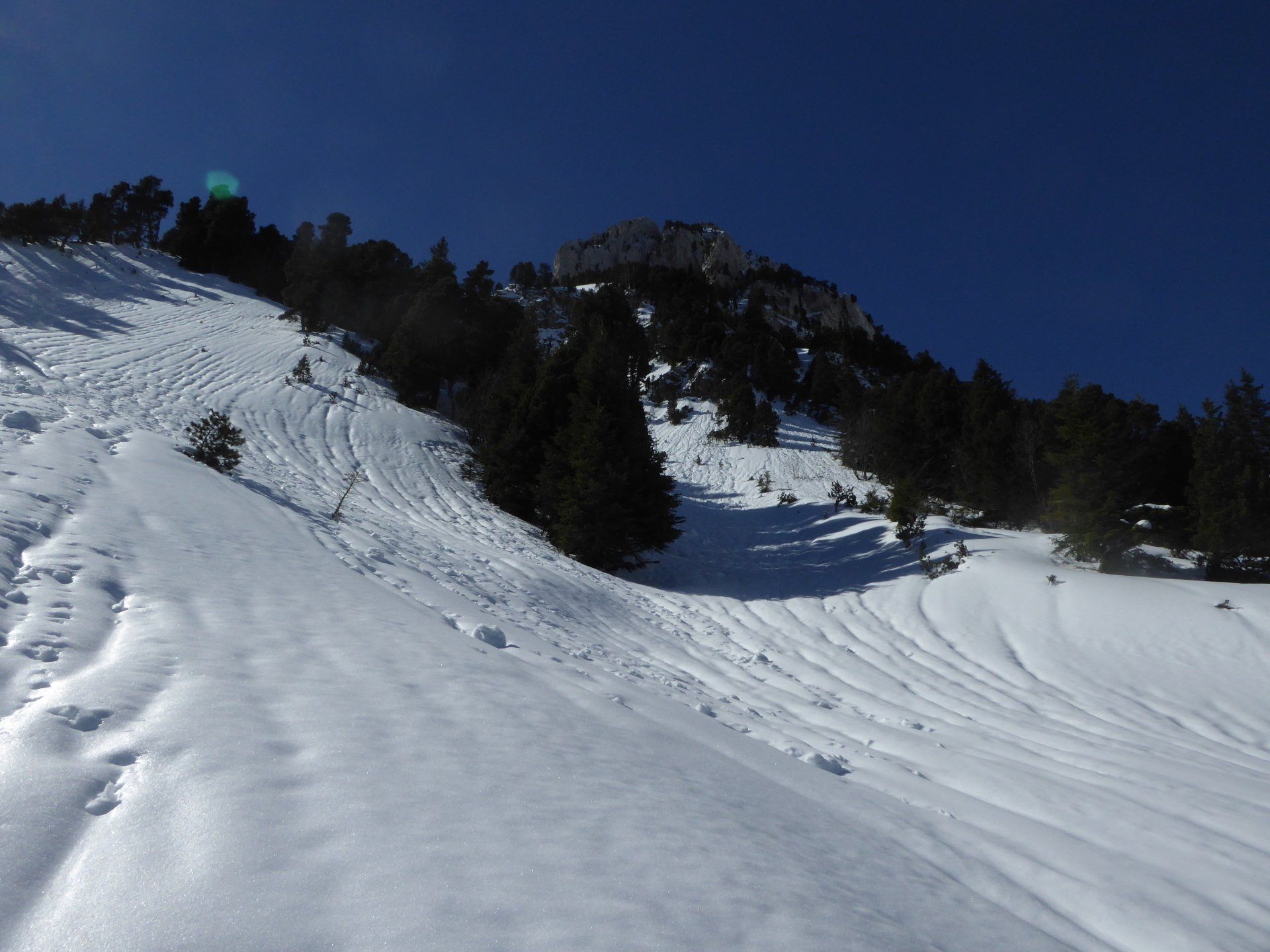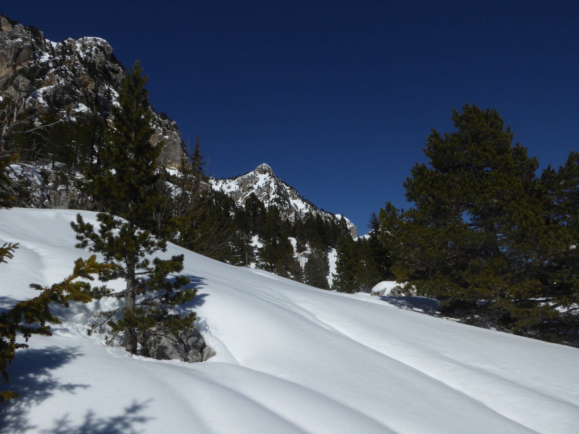 Nous nous sommes égarés avant le Col, arrivés en hors trace. La vue sur l'autre vallée et sur l'Obiou est de toute beauté. Nous cherchons le chemin pour rejoindre le Pas des Bachassons. Nous ne le trouverons jamais. Traversées de zones boisées, nous montons puis, pour éviter des langues de neige incertaines, nous redescendons, et remontons à plusieurs reprises. Le dévers sollicite nos chevilles jusqu'à ce qu'au loin nous repérions un skieur qui descend. Avant de rejoindre sa trace, nous entendons une avalanche qui se déclenche. Il y a plusieurs coulées dans le coin. Bien fatigués par nos zigzags, nous abandonnons notre objectif de relier le Pas des Bachassons. Petite pause casse-croûte. Tee shirt de rigueur tellement il fait bon. Pour descendre, nous suivons la trace de skieurs de randonnée qui sont montés par là. Les quarts de nos raquettes sont moins efficaces que les quarts des skis de randonnées et certains passages sont acrobatiques mais nous sommes bien contents d'avoir trouvé ces traces. La neige glisse, comme si elle roulait sur elle-même. Heureusement, le soleil et le ciel bleu nous auront accompagnés tout du long.