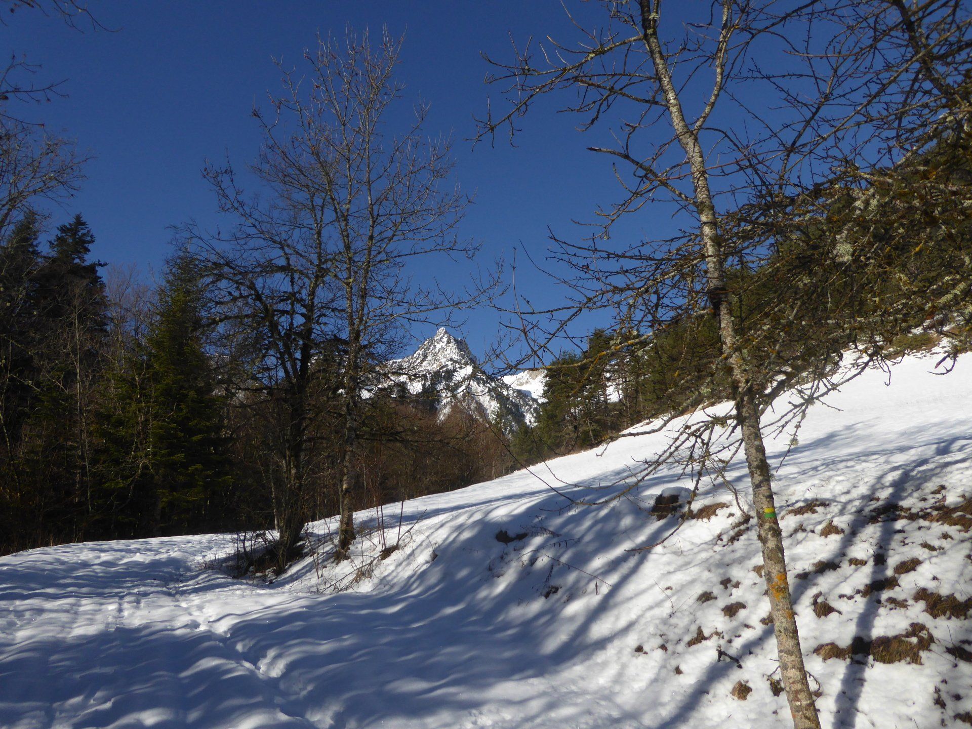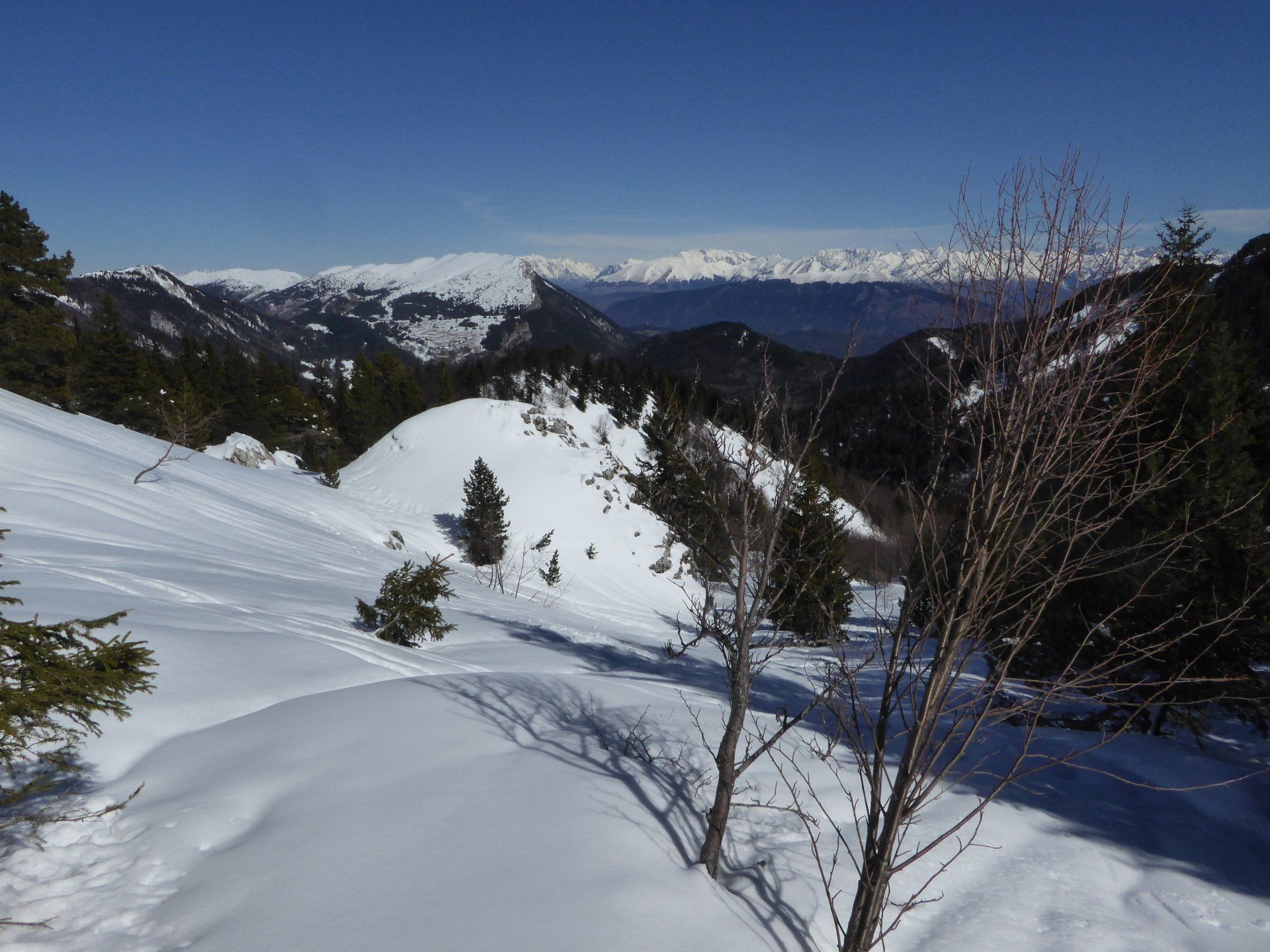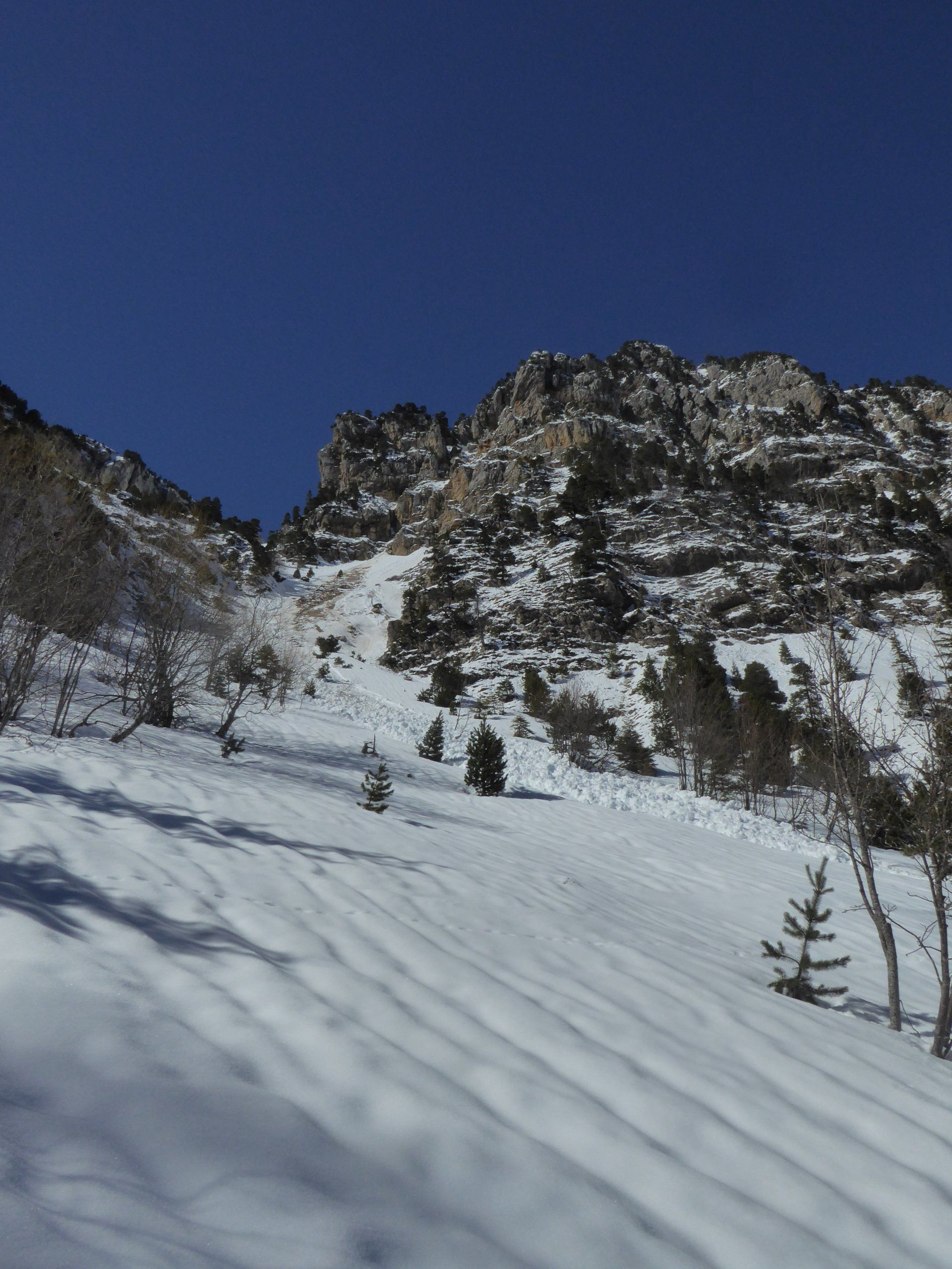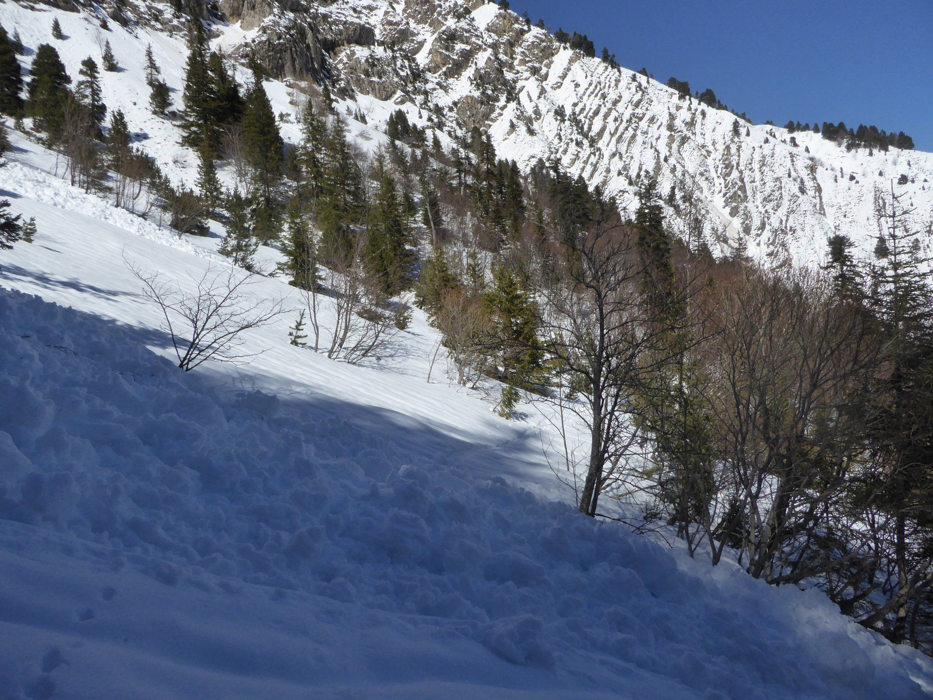 Nous nous sommes égarés avant le Col, arrivés en hors trace. La vue sur l'autre vallée et sur l'Obiou est de toute beauté. Nous cherchons le chemin pour rejoindre le Pas des Bachassons. Nous ne le trouverons jamais. Traversées de zones boisées, nous montons puis, pour éviter des langues de neige incertaines, nous redescendons, et remontons à plusieurs reprises. Le dévers sollicite nos chevilles jusqu'à ce qu'au loin nous repérions un skieur qui descend. Avant de rejoindre sa trace, nous entendons une avalanche qui se déclenche. Il y a plusieurs coulées dans le coin. Bien fatigués par nos zigzags, nous abandonnons notre objectif de relier le Pas des Bachassons. Petite pause casse-croûte. Tee shirt de rigueur tellement il fait bon. Pour descendre, nous suivons la trace de skieurs de randonnée qui sont montés par là. Les quarts de nos raquettes sont moins efficaces que les quarts des skis de randonnées et certains passages sont acrobatiques mais nous sommes bien contents d'avoir trouvé ces traces. La neige glisse, comme si elle roulait sur elle-même. Heureusement, le soleil et le ciel bleu nous auront accompagnés tout du long.