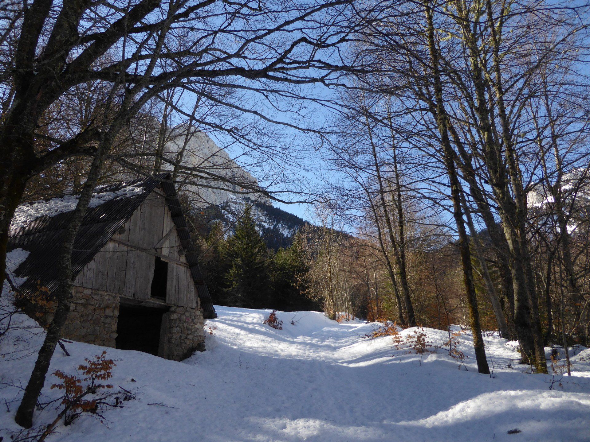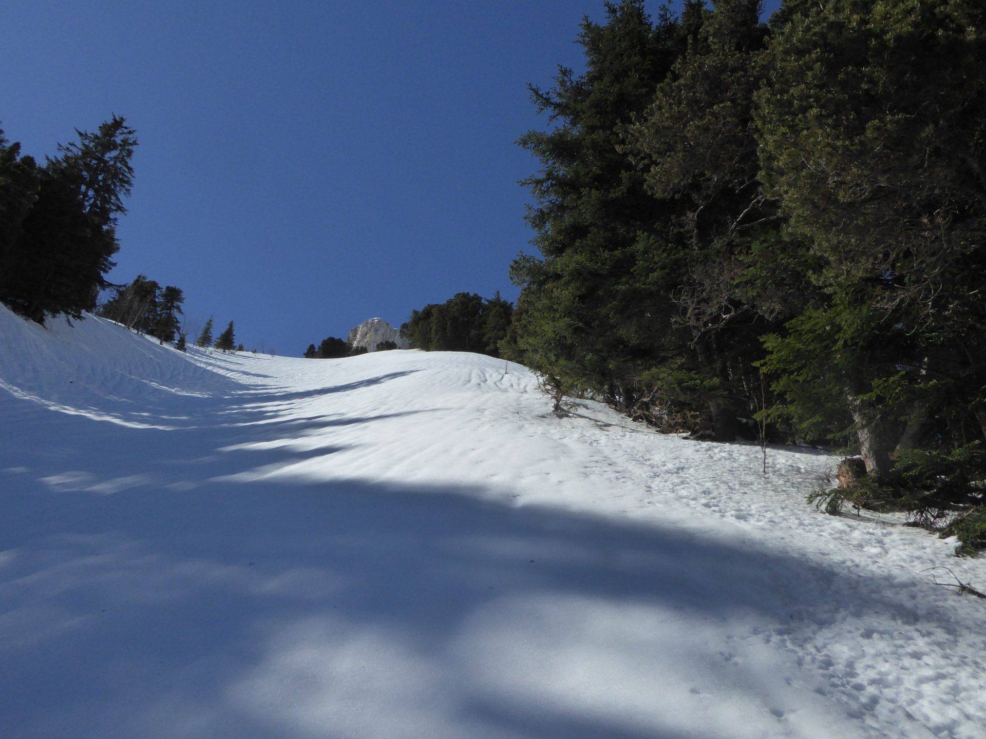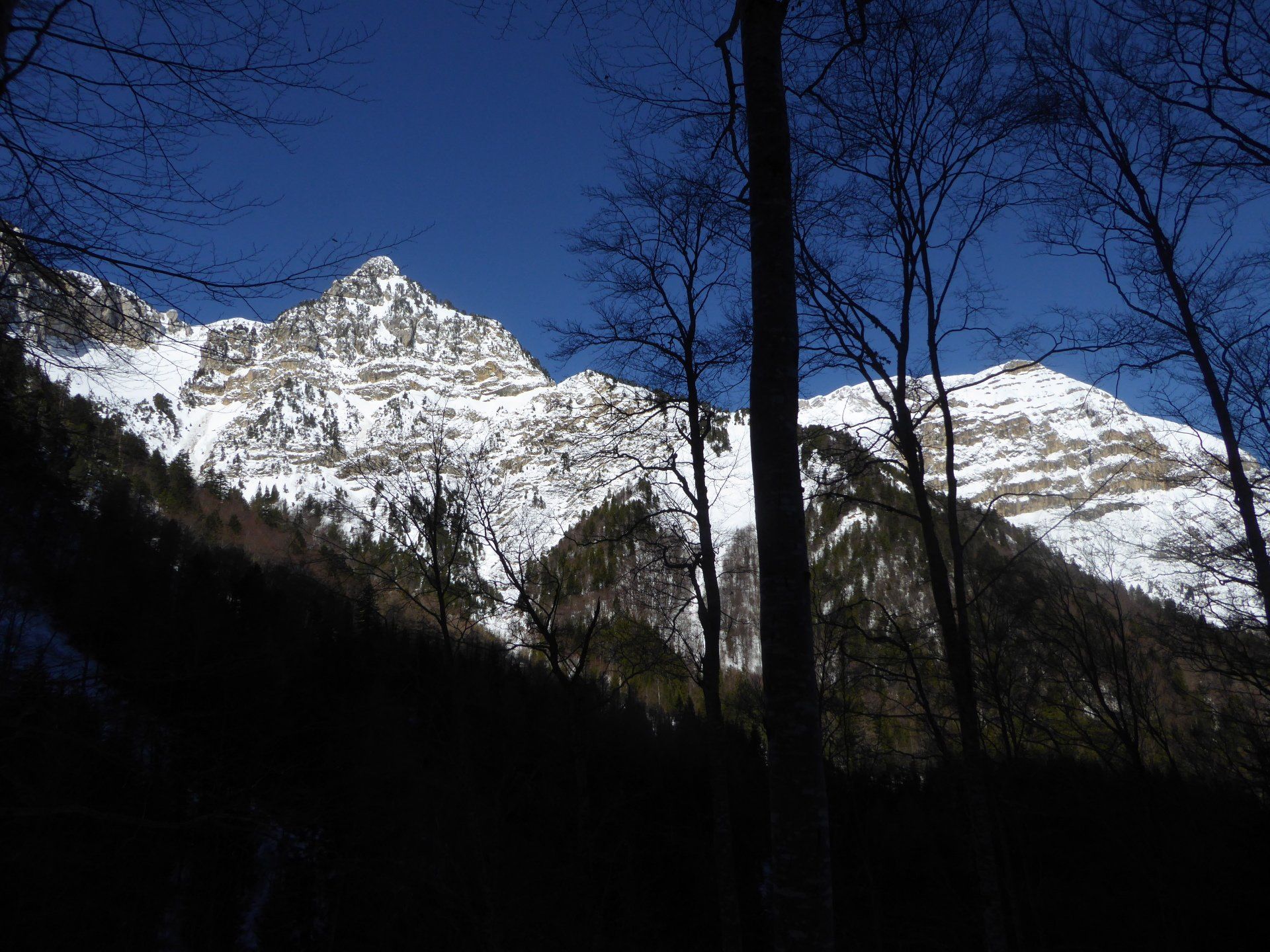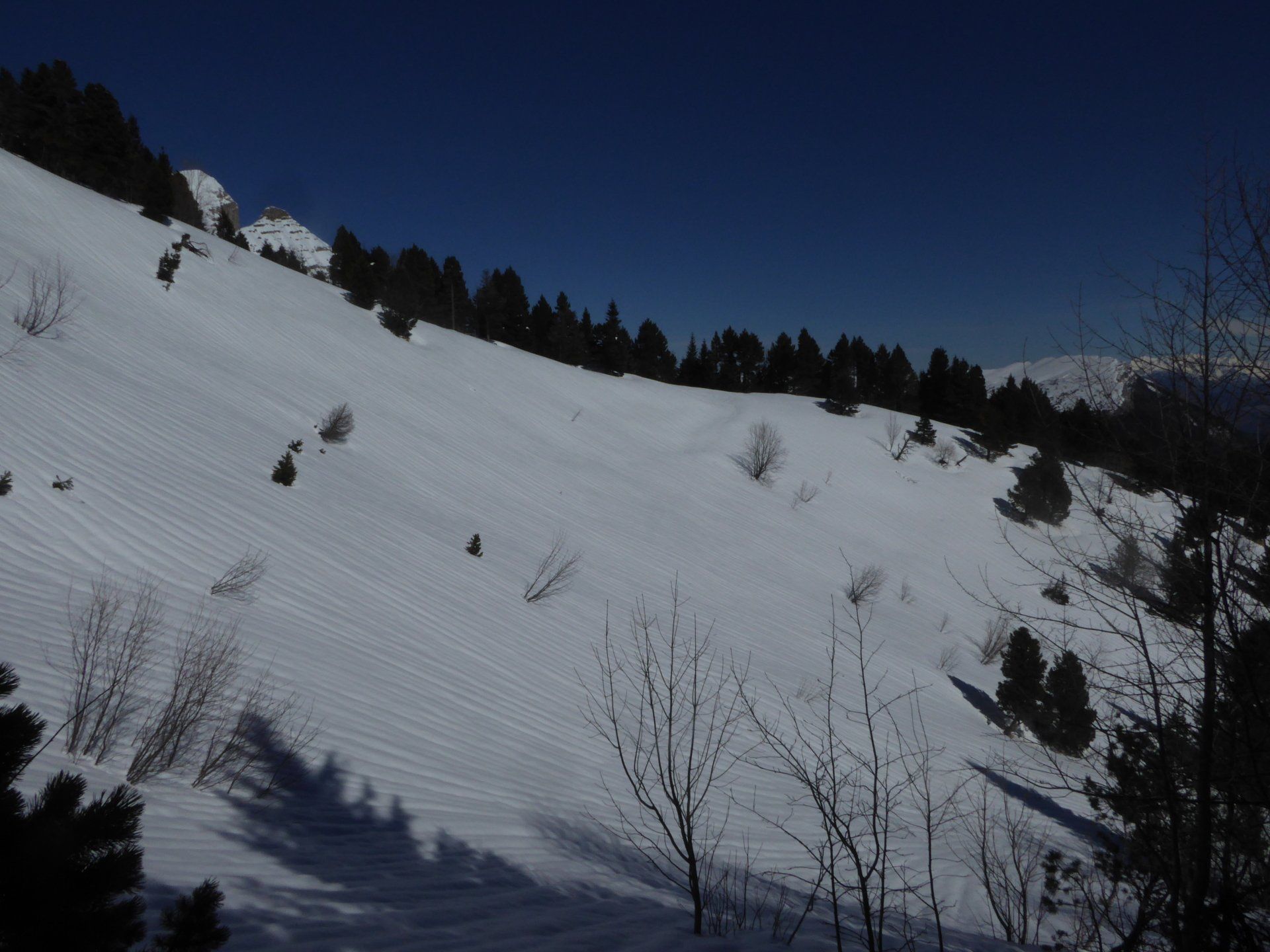 Nous nous sommes égarés avant le Col, arrivés en hors trace. La vue sur l'autre vallée et sur l'Obiou est de toute beauté. Nous cherchons le chemin pour rejoindre le Pas des Bachassons. Nous ne le trouverons jamais. Traversées de zones boisées, nous montons puis, pour éviter des langues de neige incertaines, nous redescendons, et remontons à plusieurs reprises. Le dévers sollicite nos chevilles jusqu'à ce qu'au loin nous repérions un skieur qui descend. Avant de rejoindre sa trace, nous entendons une avalanche qui se déclenche. Il y a plusieurs coulées dans le coin. Bien fatigués par nos zigzags, nous abandonnons notre objectif de relier le Pas des Bachassons. Petite pause casse-croûte. Tee shirt de rigueur tellement il fait bon. Pour descendre, nous suivons la trace de skieurs de randonnée qui sont montés par là. Les quarts de nos raquettes sont moins efficaces que les quarts des skis de randonnées et certains passages sont acrobatiques mais nous sommes bien contents d'avoir trouvé ces traces. La neige glisse, comme si elle roulait sur elle-même. Heureusement, le soleil et le ciel bleu nous auront accompagnés tout du long.