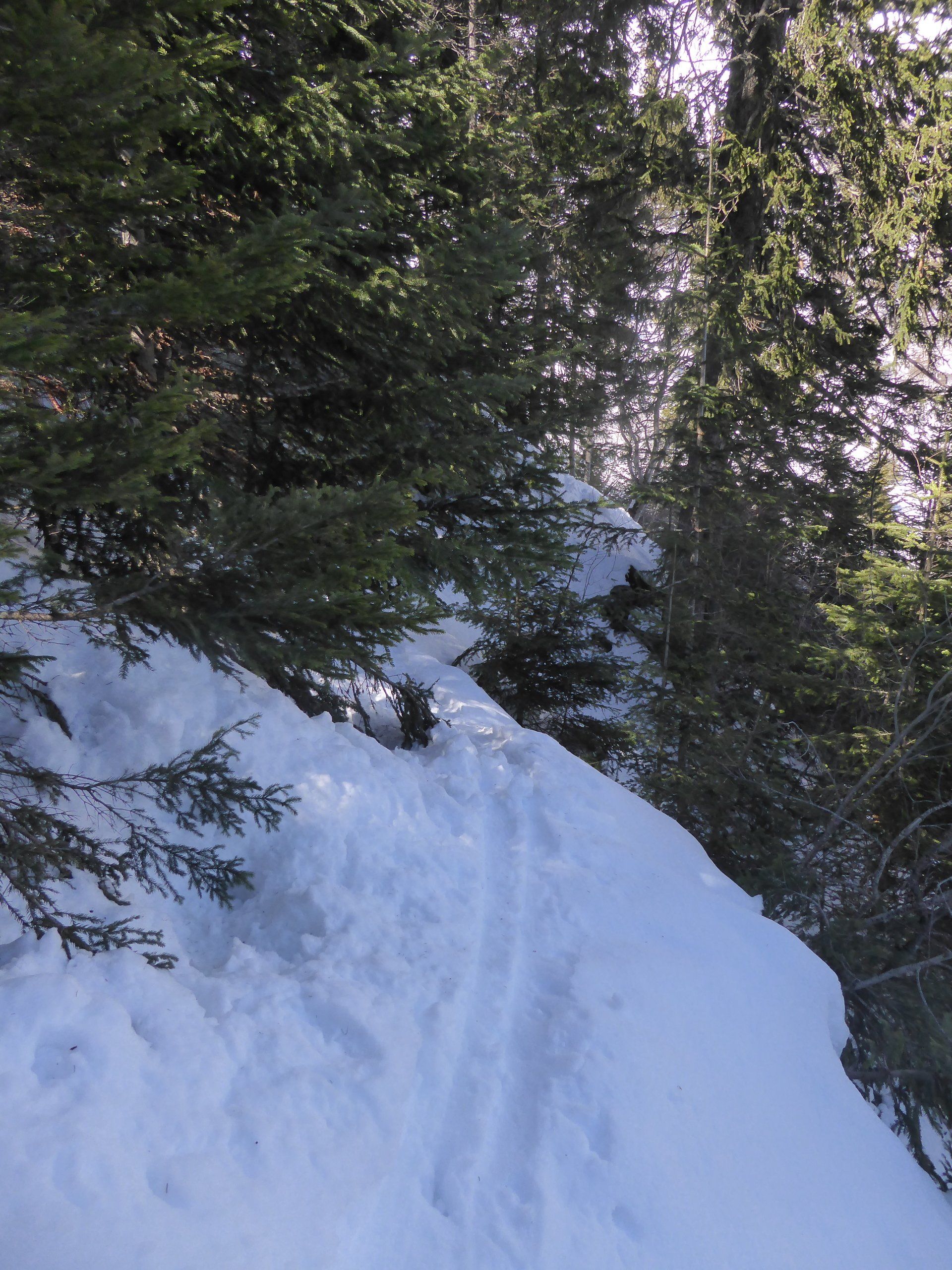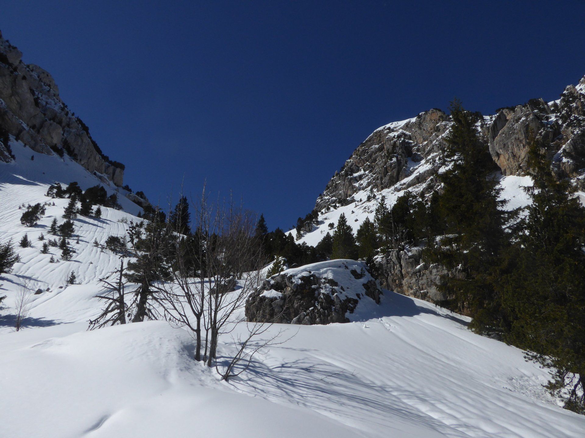 Descente un peu aléatoire, des traces de ski un peu acrobatiques à suivre, avant de retrouver le bas du vallon.