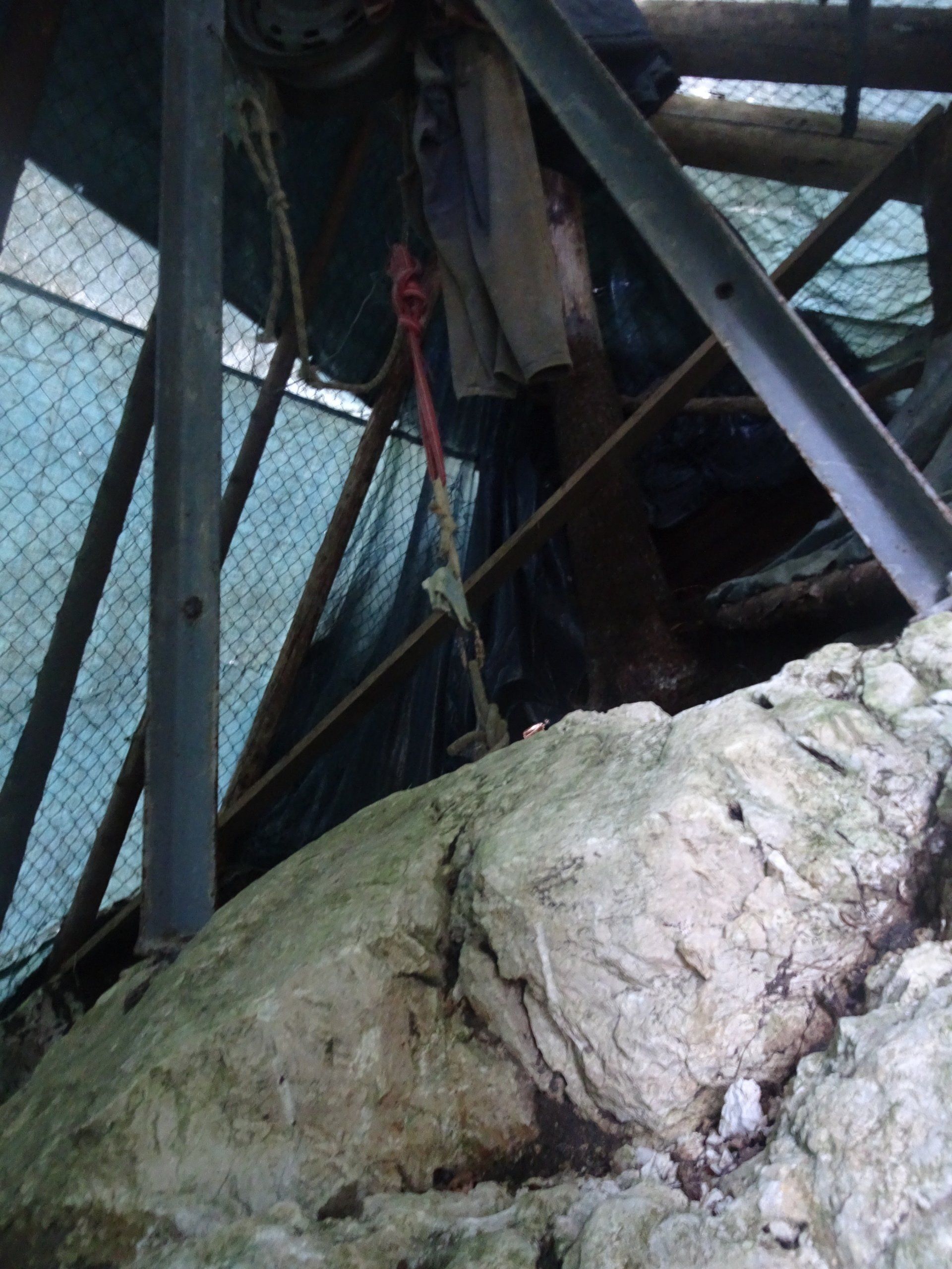 Pour faire une boucle et non un simple aller-retour, nous devons emprunter un sentier repéré en pointillé sur la carte. Influencés par de larges traces d'exploitation forestière, nous tournons trop tôt et entamons un tout droit dans la pente qui se perd dans un hors piste. Nous retrouvons une trace qui nous fait passer à coté d'un trou d'exploration bien équipé.
