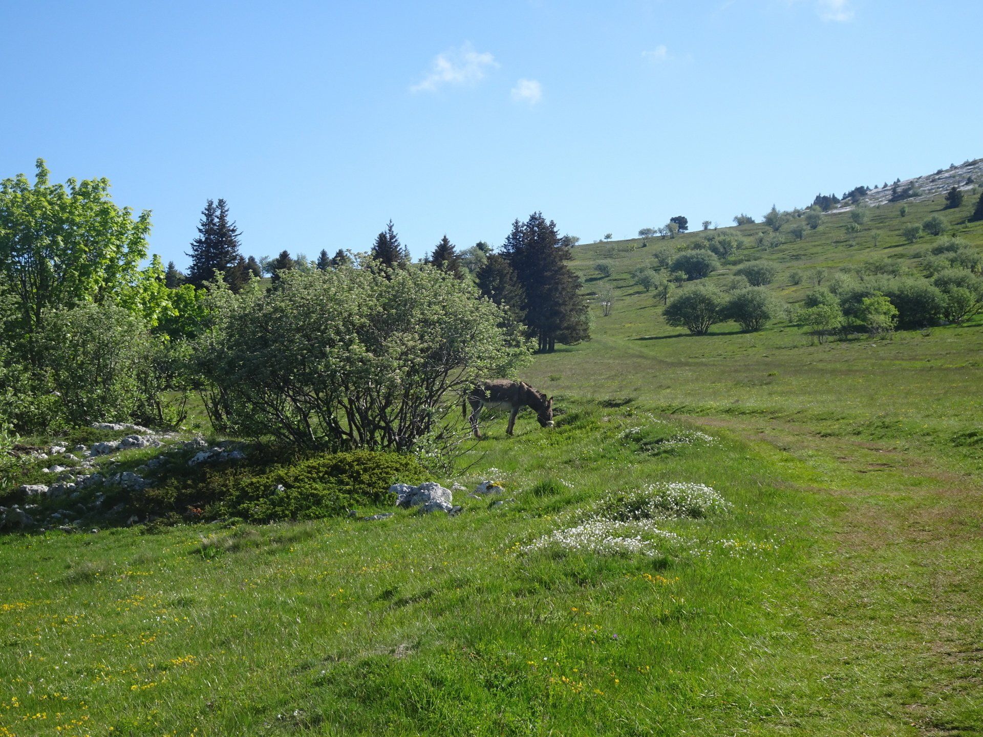 Un dernier grand lacet avant de déboucher sur une sorte de plateau au cœur duquel se cache un refuge. Plusieurs personnes y ont passé la nuit, d'autres en bivouac juste devant. Un peu plus loin, nous croisons un âne de bat qui profite de l'herbe bien verte avant d'être harnaché.