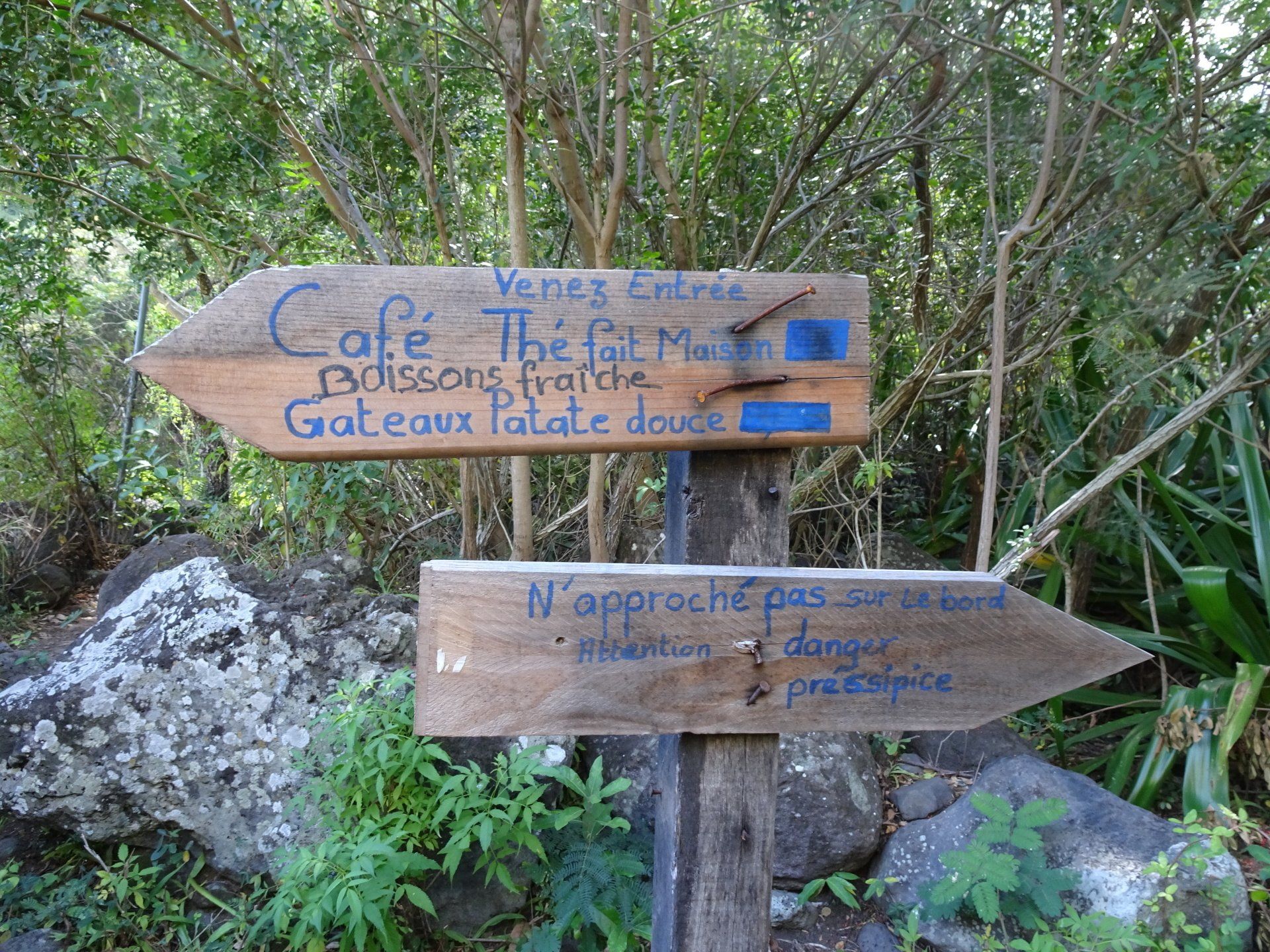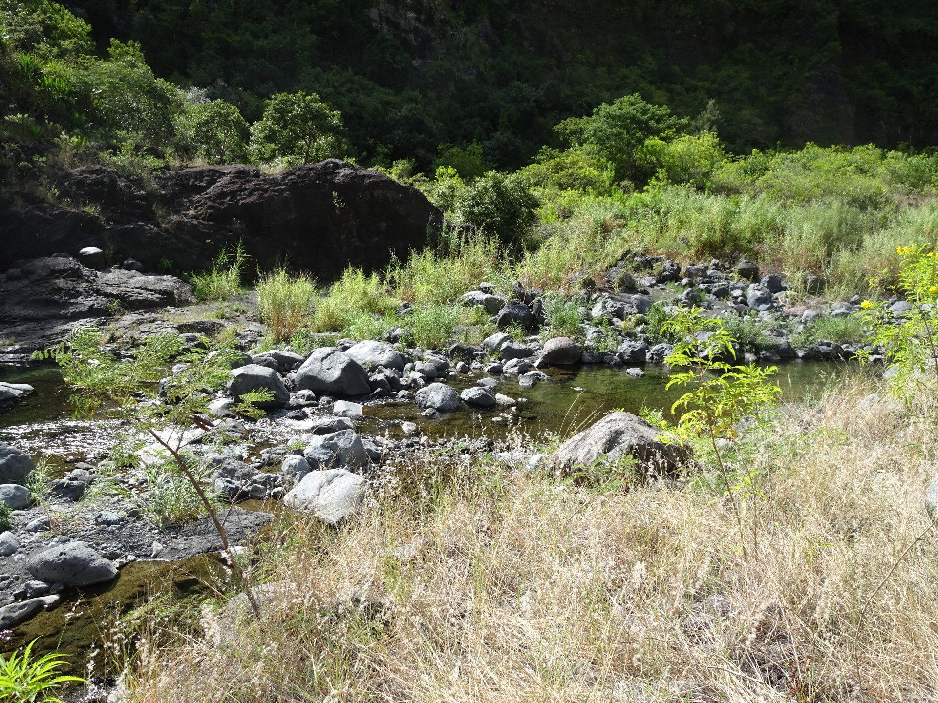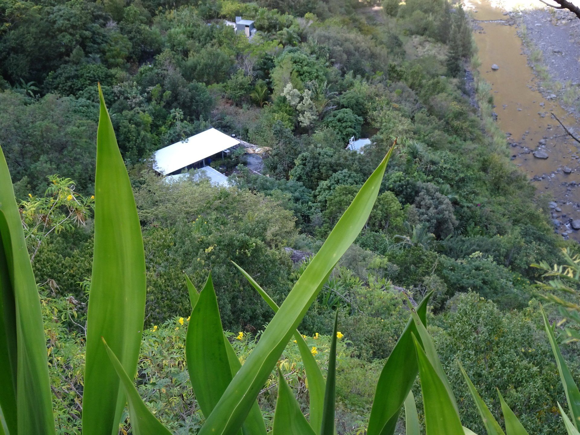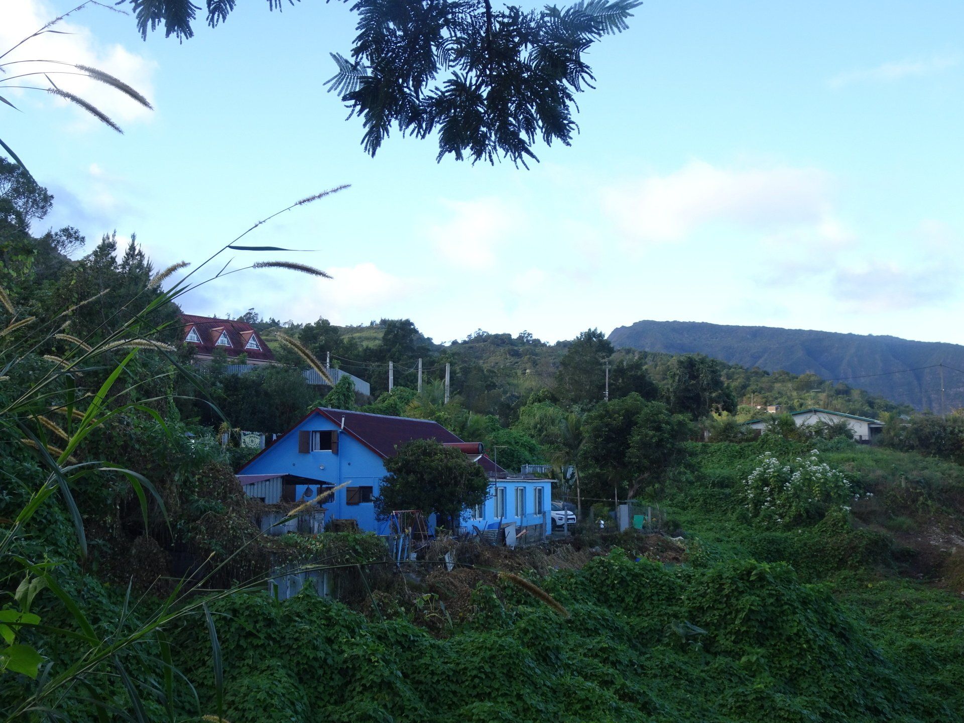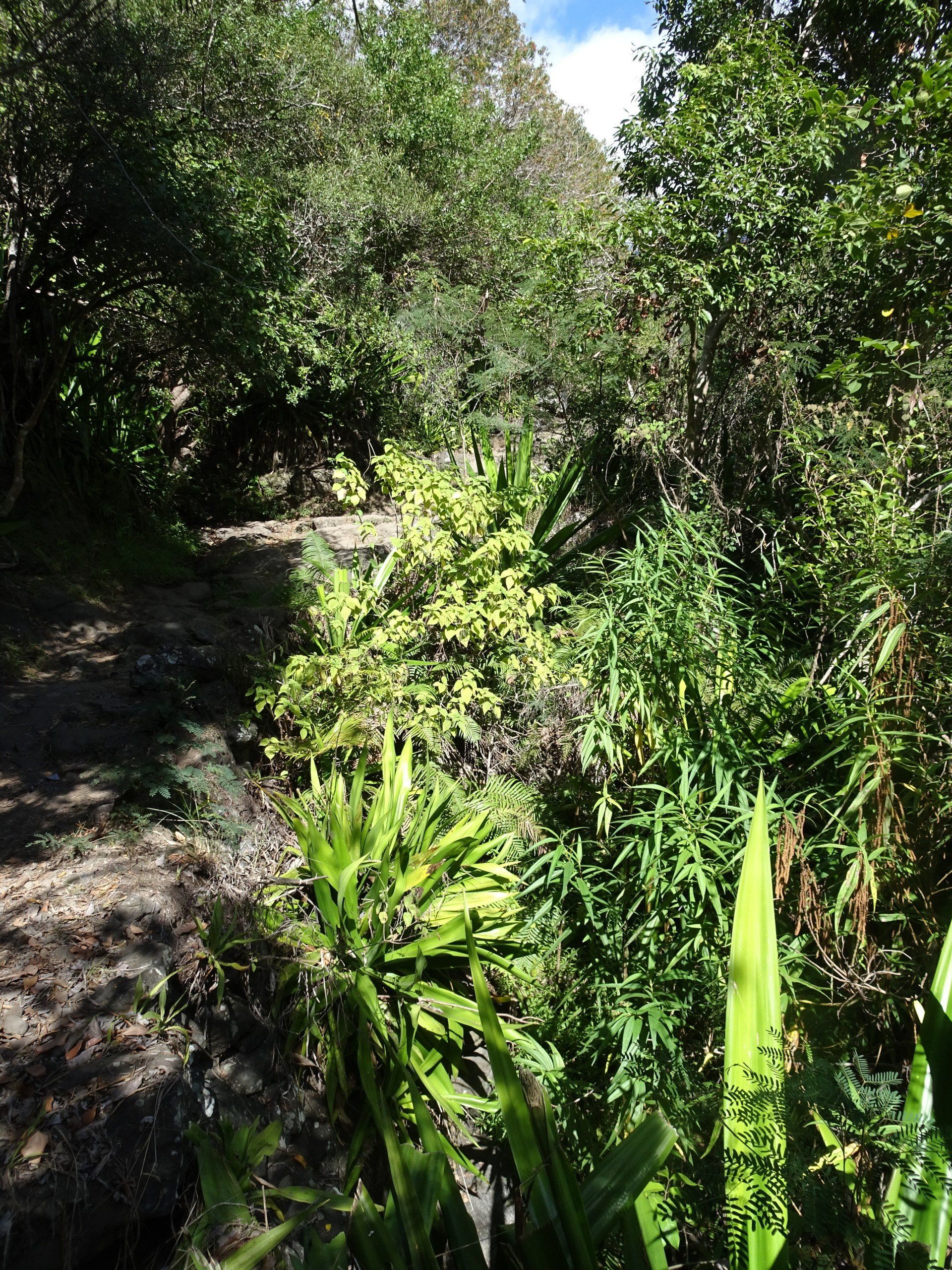 Demi tour, nous finissons par trouver l’église et suivons de vue un trailer qui s’enfile par un étroit passage entre 2 propriétés qui nous conduit jusqu’au départ du chemin descendant vers 2 bras.