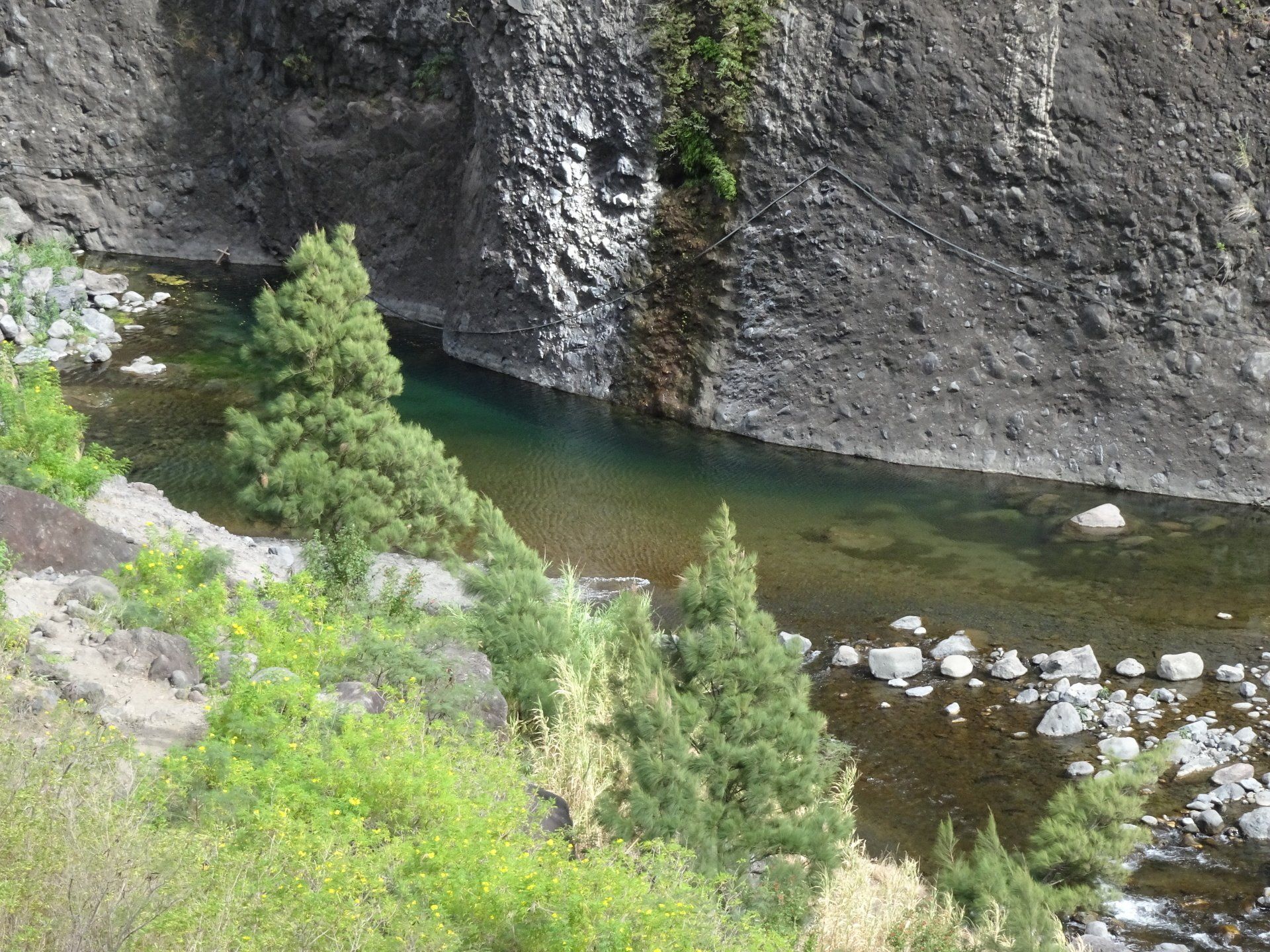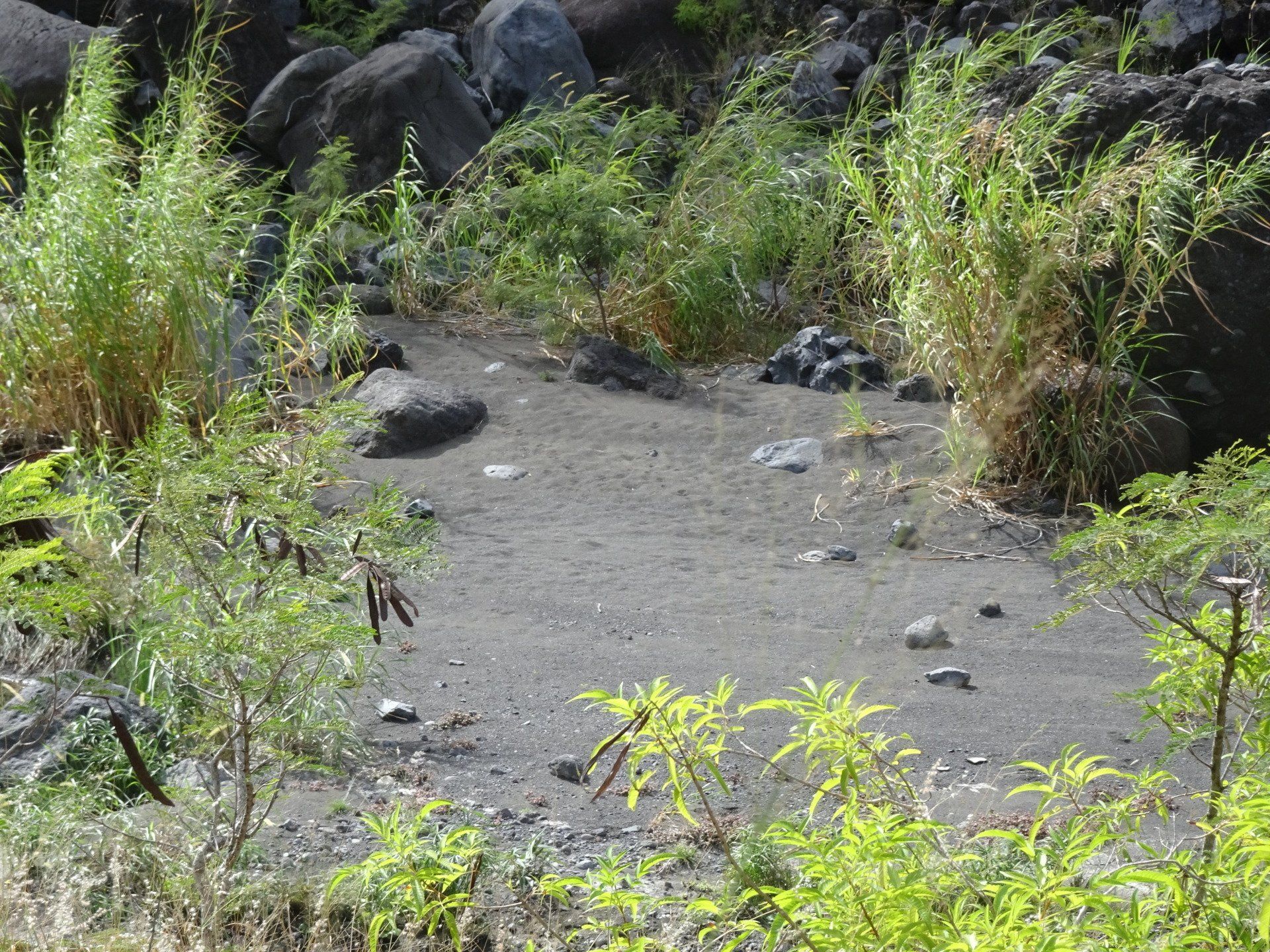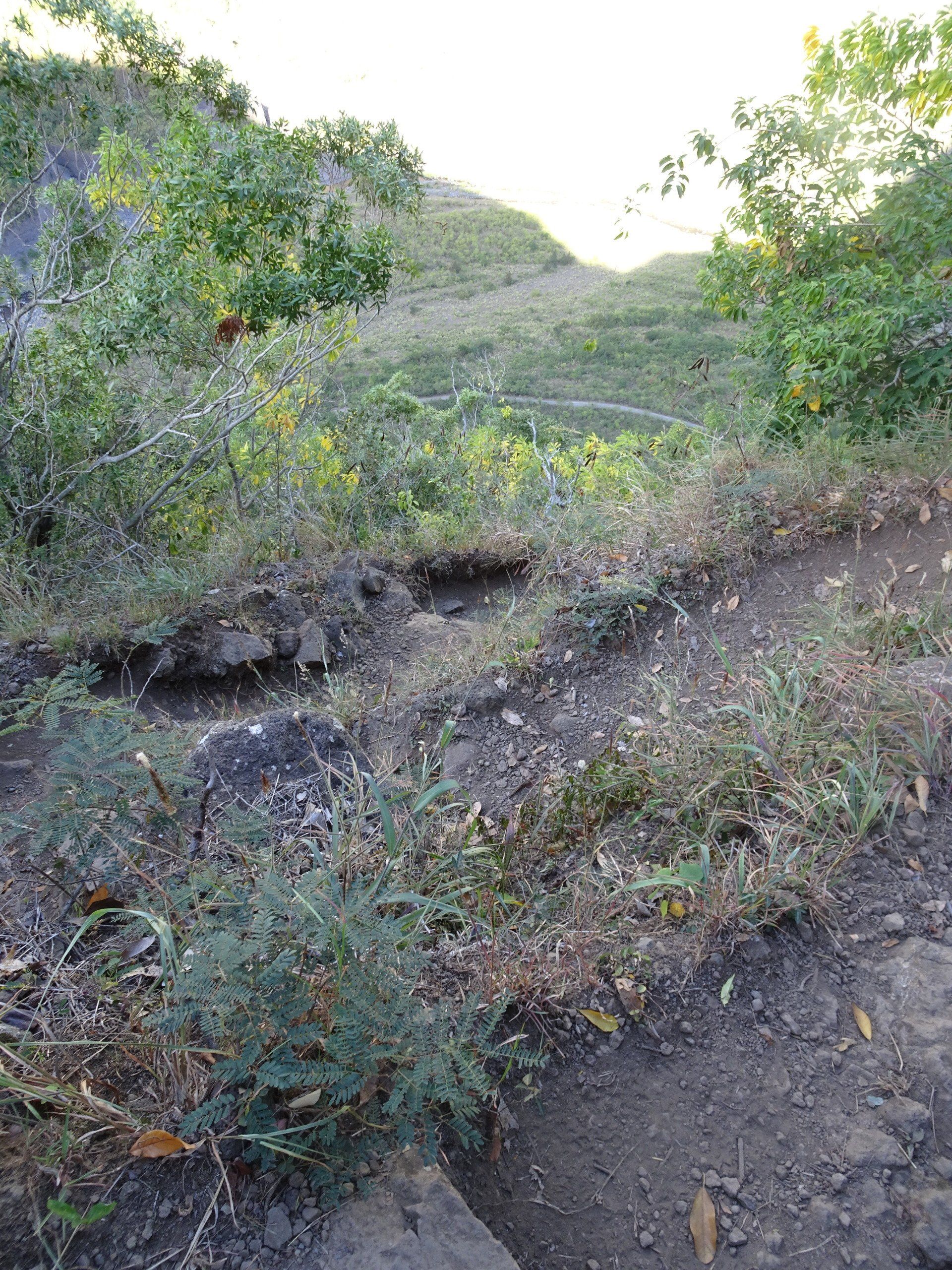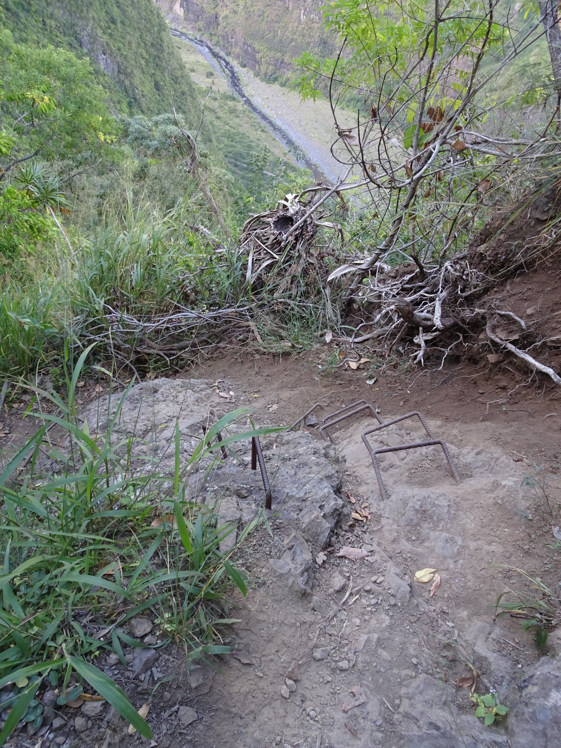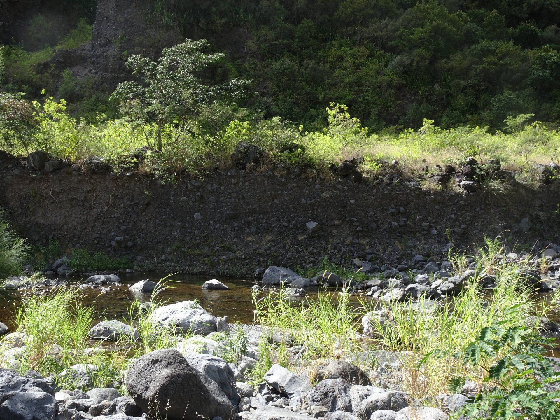 Demi tour, nous finissons par trouver l’église et suivons de vue un trailer qui s’enfile par un étroit passage entre 2 propriétés qui nous conduit jusqu’au départ du chemin descendant vers 2 bras.