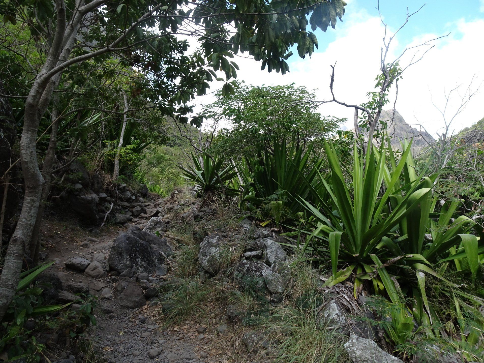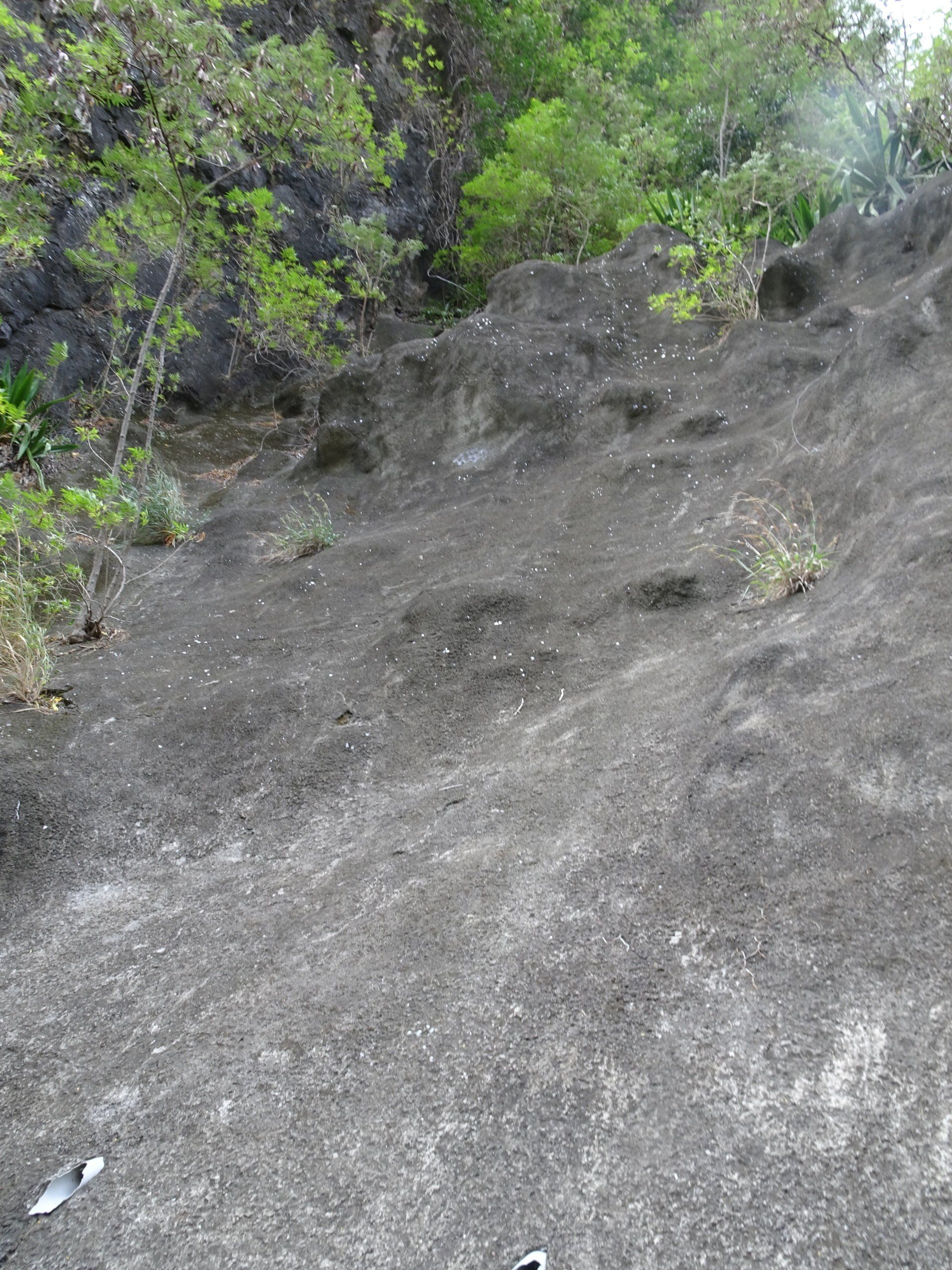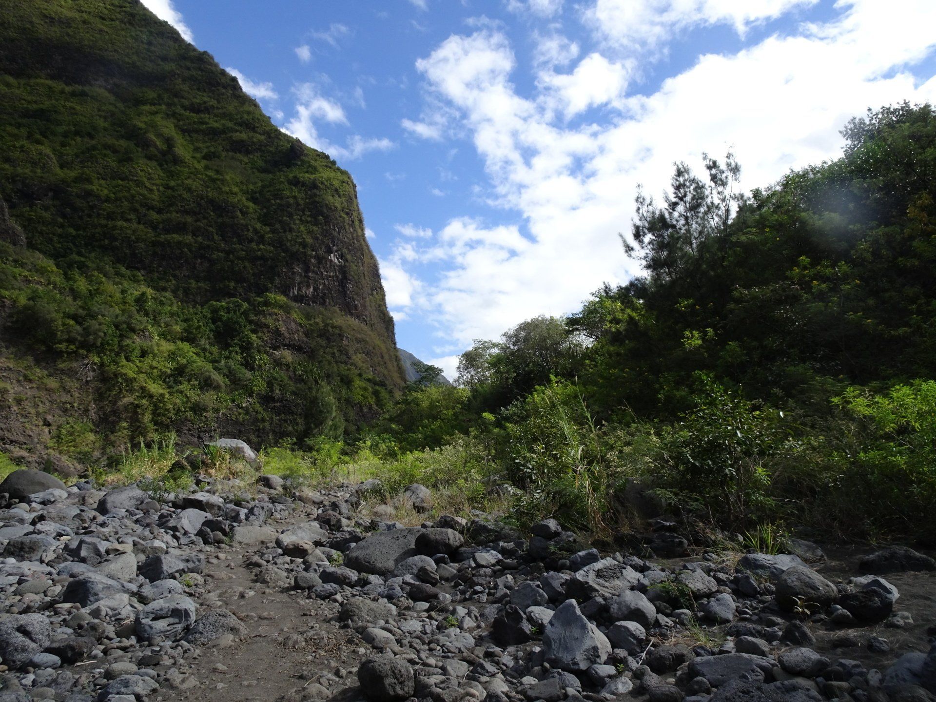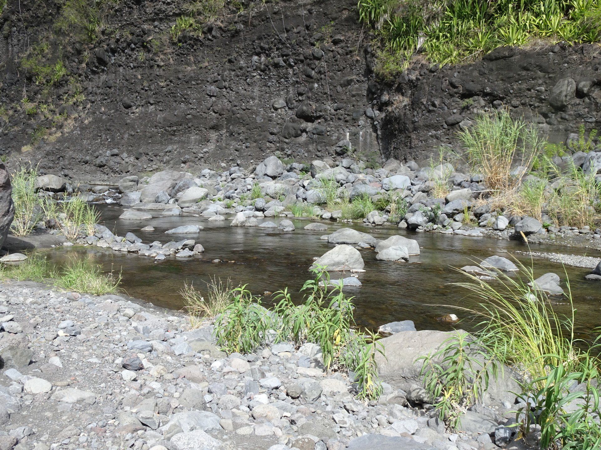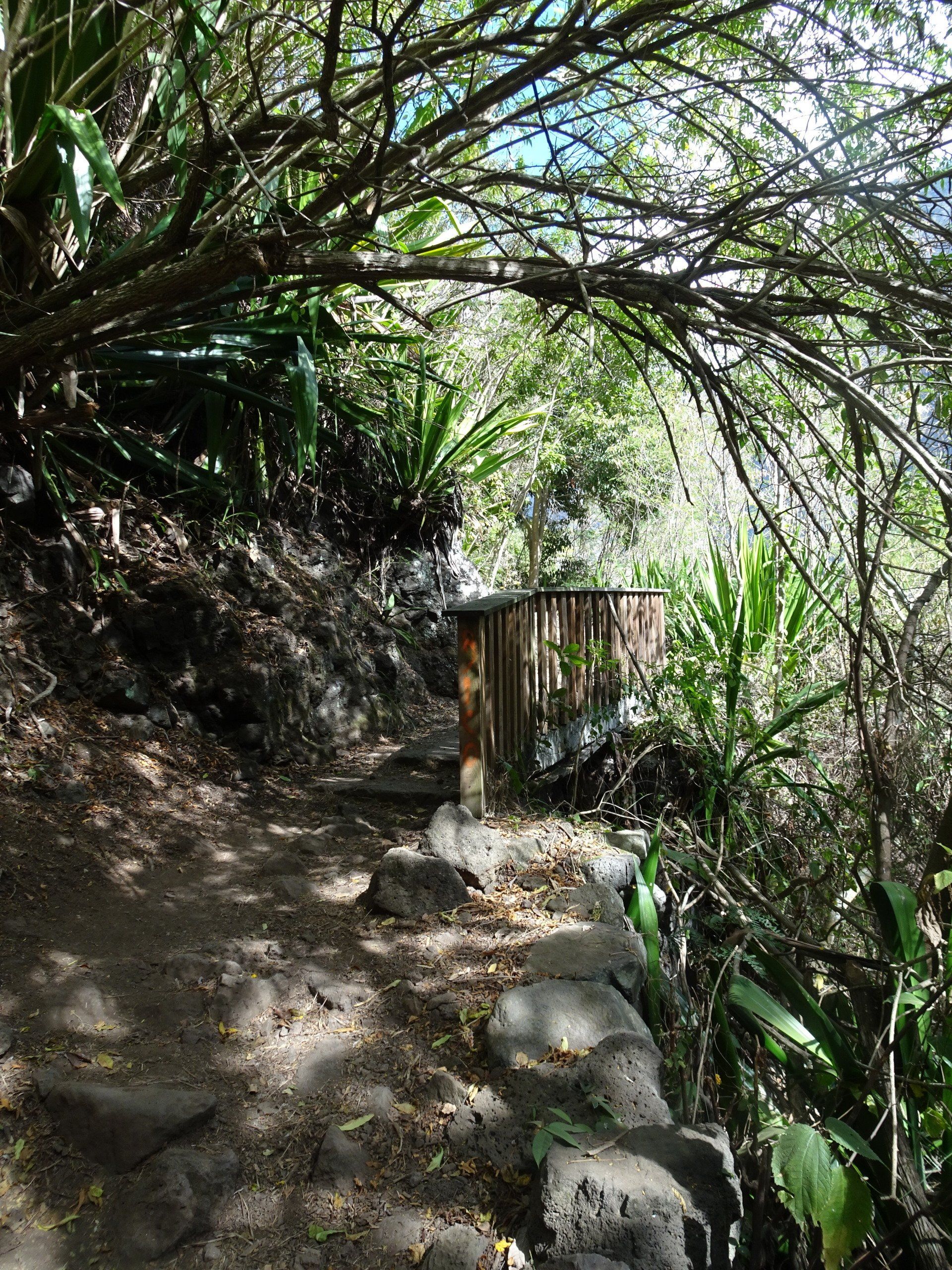 Demi tour, nous finissons par trouver l’église et suivons de vue un trailer qui s’enfile par un étroit passage entre 2 propriétés qui nous conduit jusqu’au départ du chemin descendant vers 2 bras.