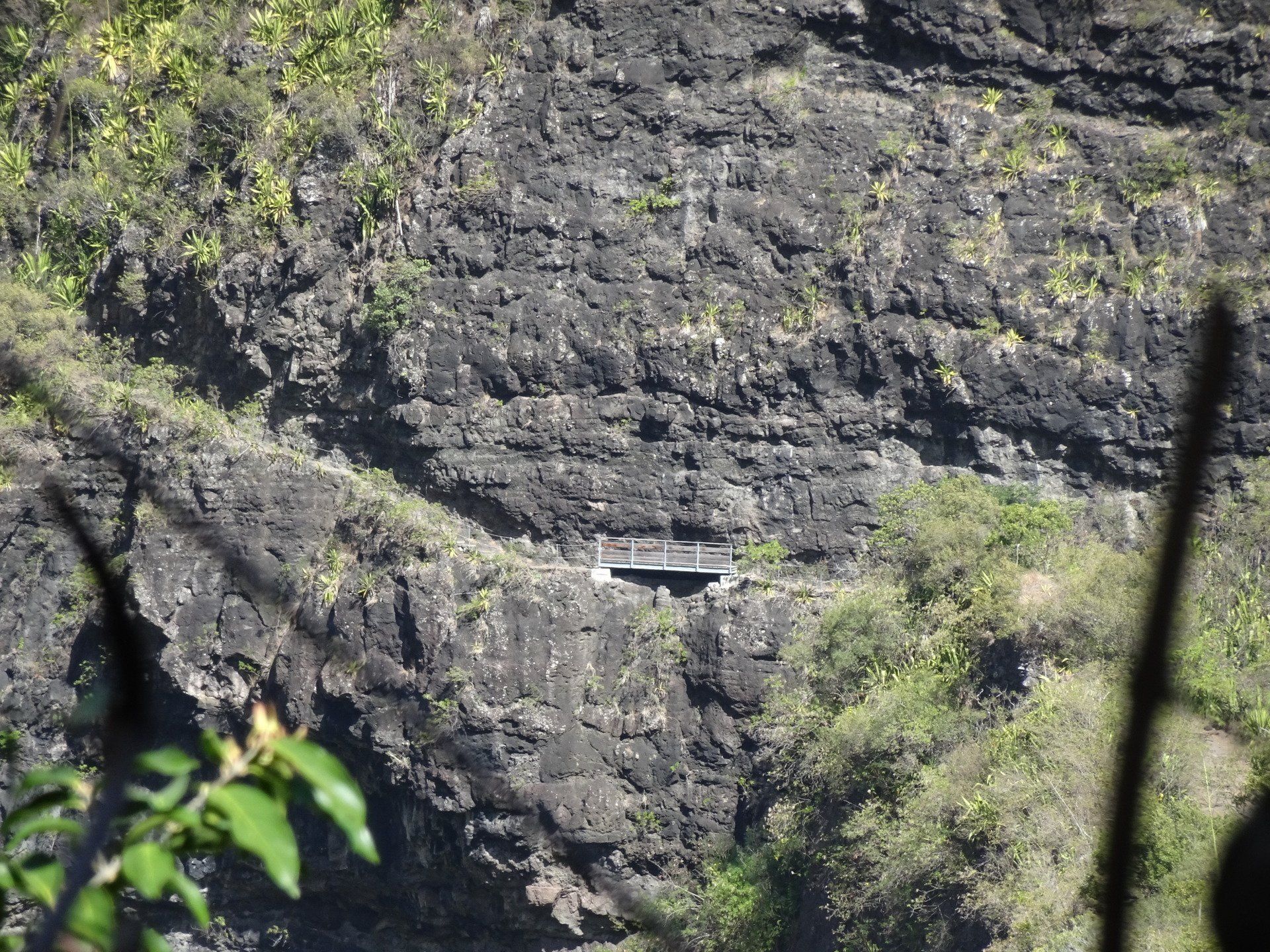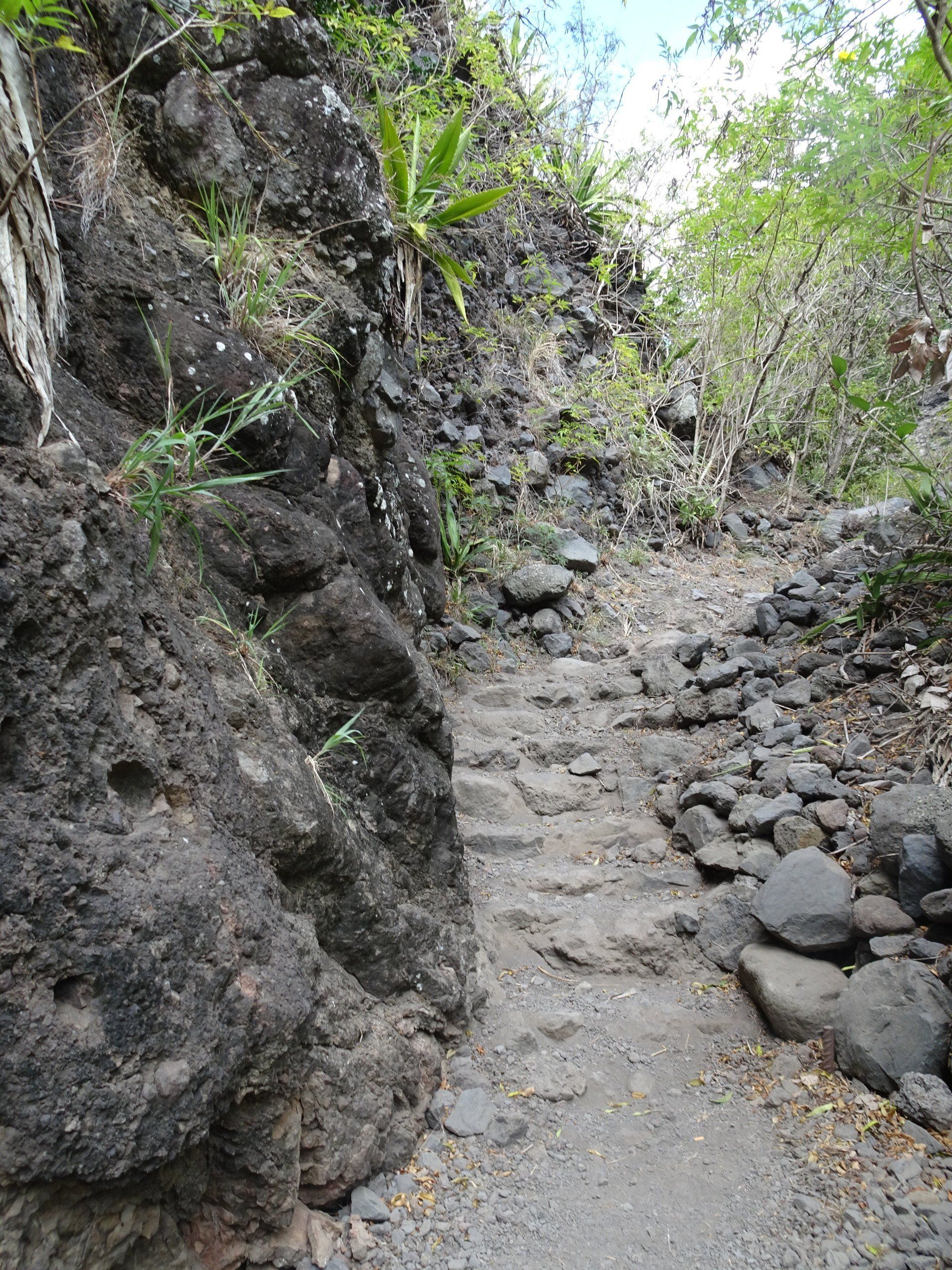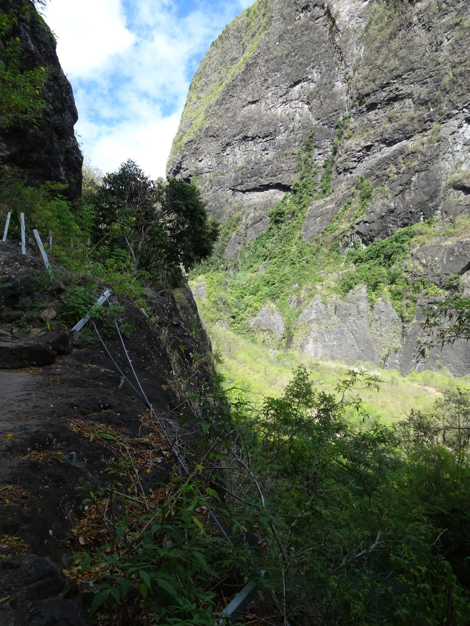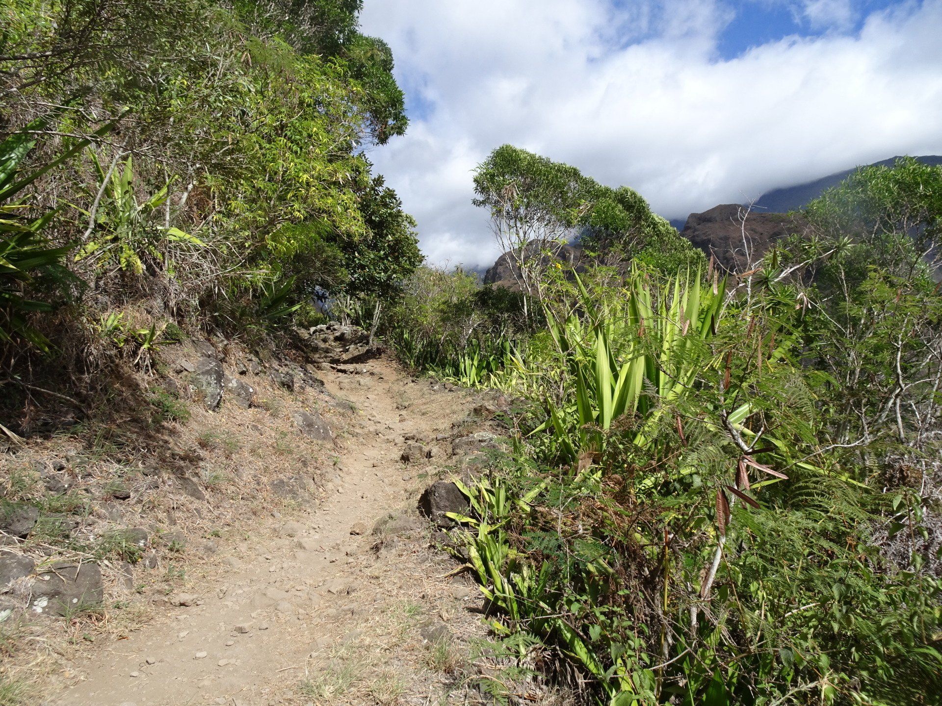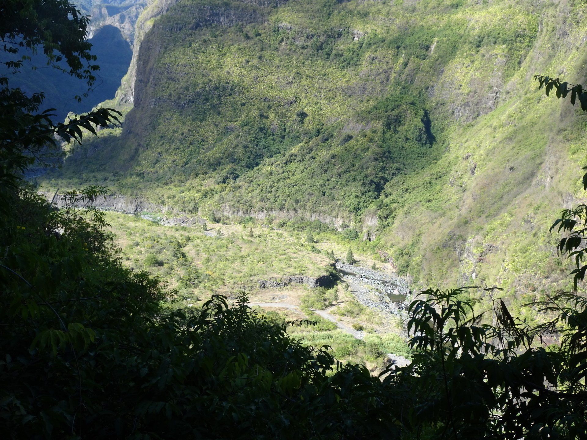 Demi tour, nous finissons par trouver l’église et suivons de vue un trailer qui s’enfile par un étroit passage entre 2 propriétés qui nous conduit jusqu’au départ du chemin descendant vers 2 bras.