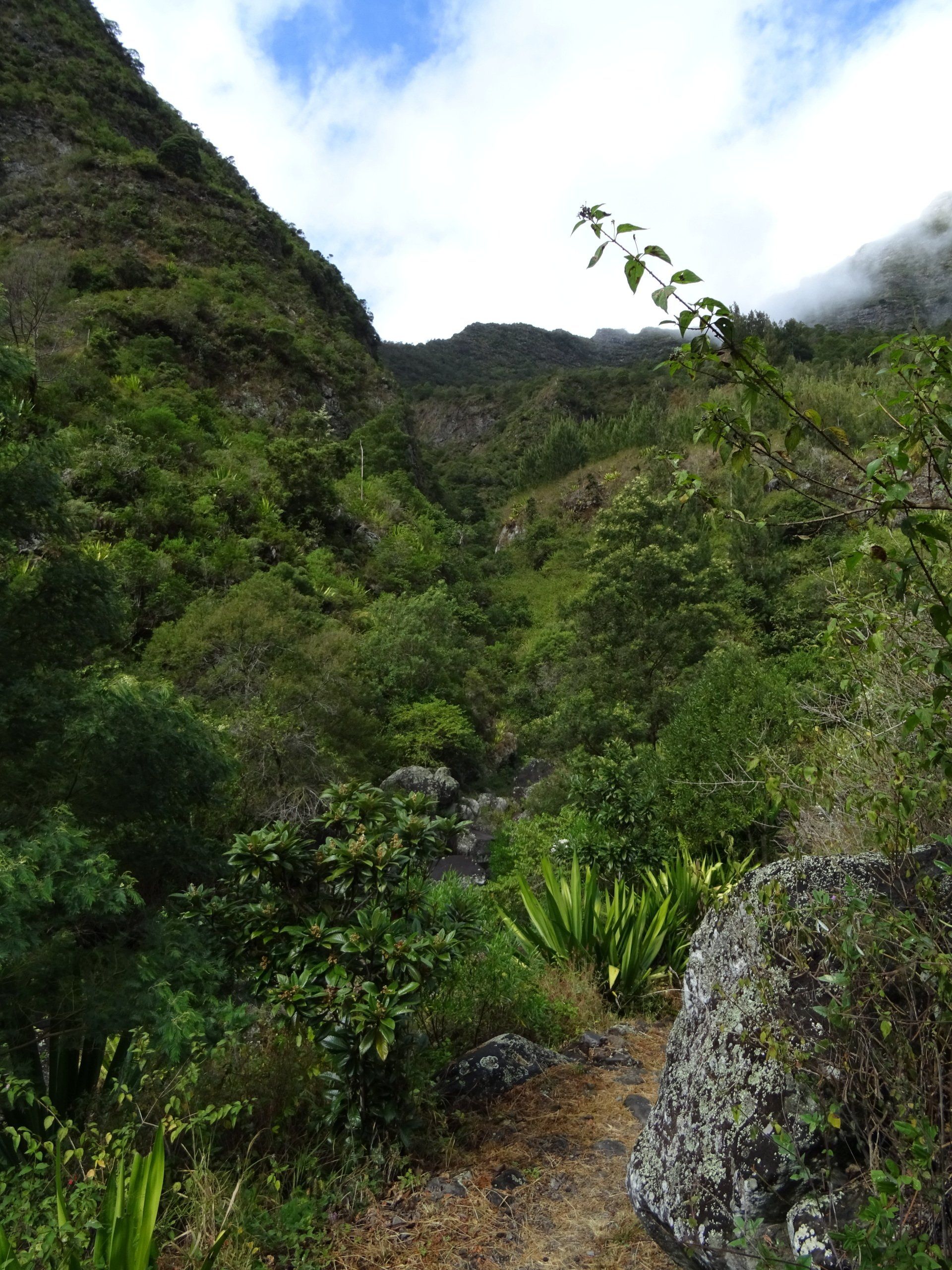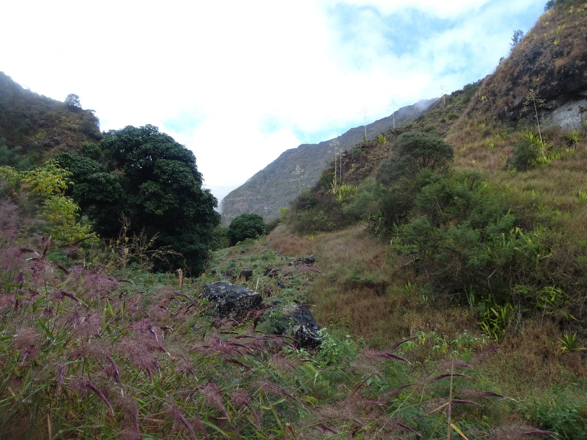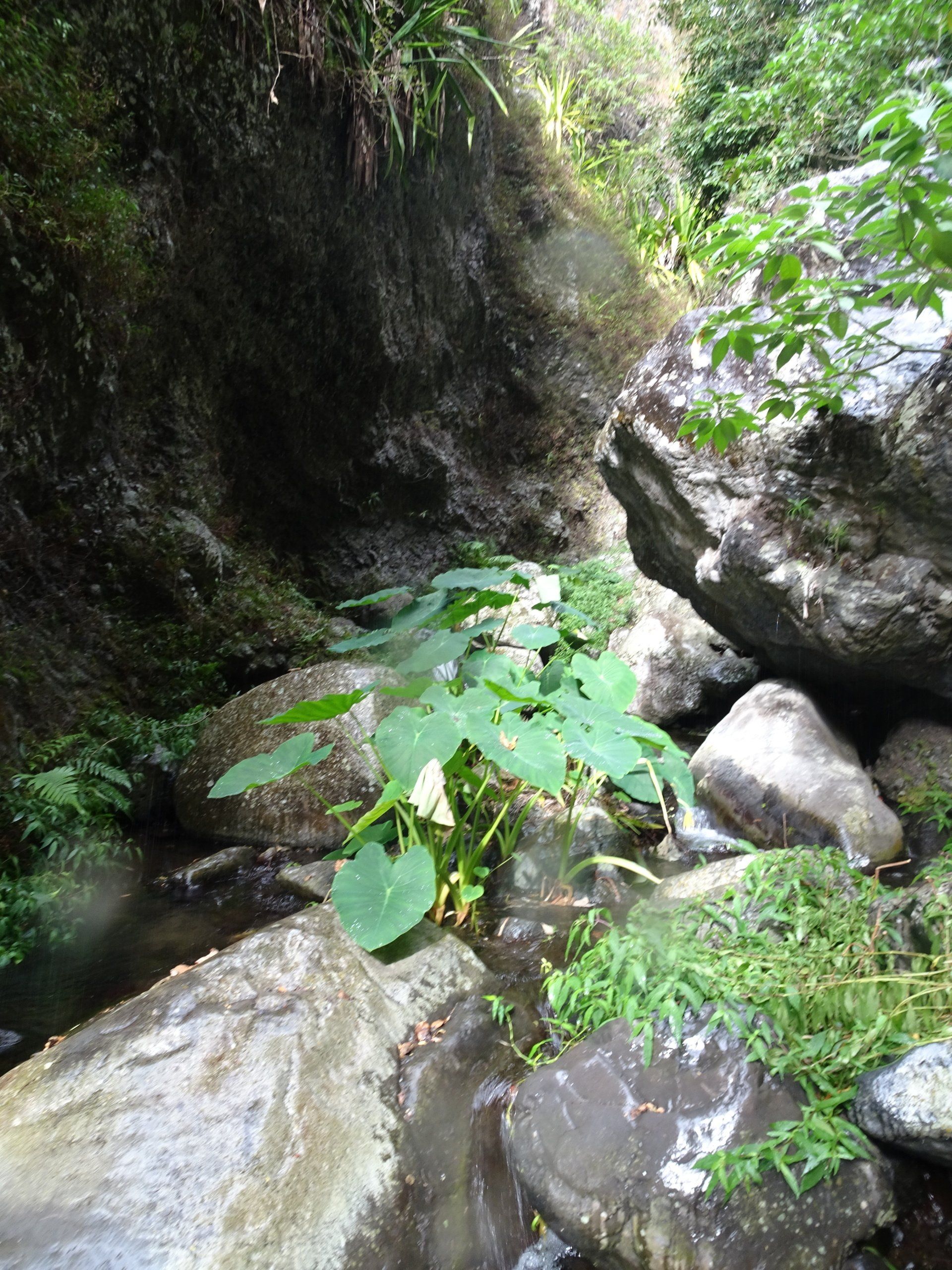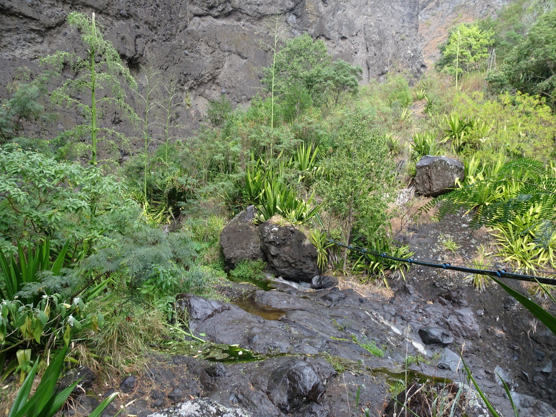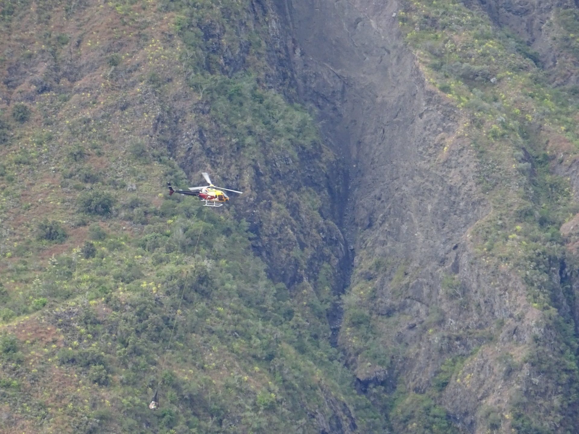 L’hélico doit passer aujourd’hui mais fin de matinée. Nous serons déjà partis. Ça serait risqué de l’attendre, grosse journée prévue. Parmi les 3 itinéraires, nous avons choisi le plus long, par l’îlet des orangers et la brèche. Nous partons juste avant le départ des enfants à l’école. Les muscles s’habituent, les douleurs sont moins présentes.