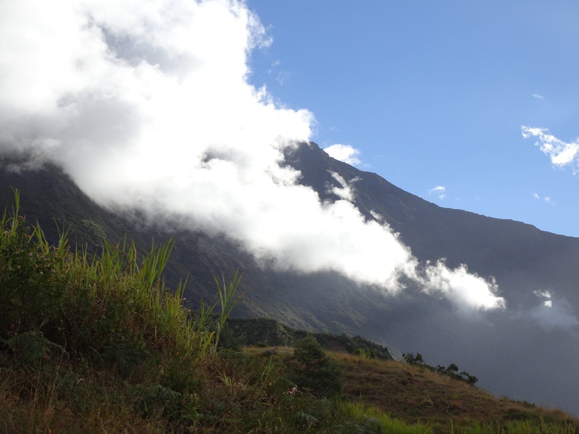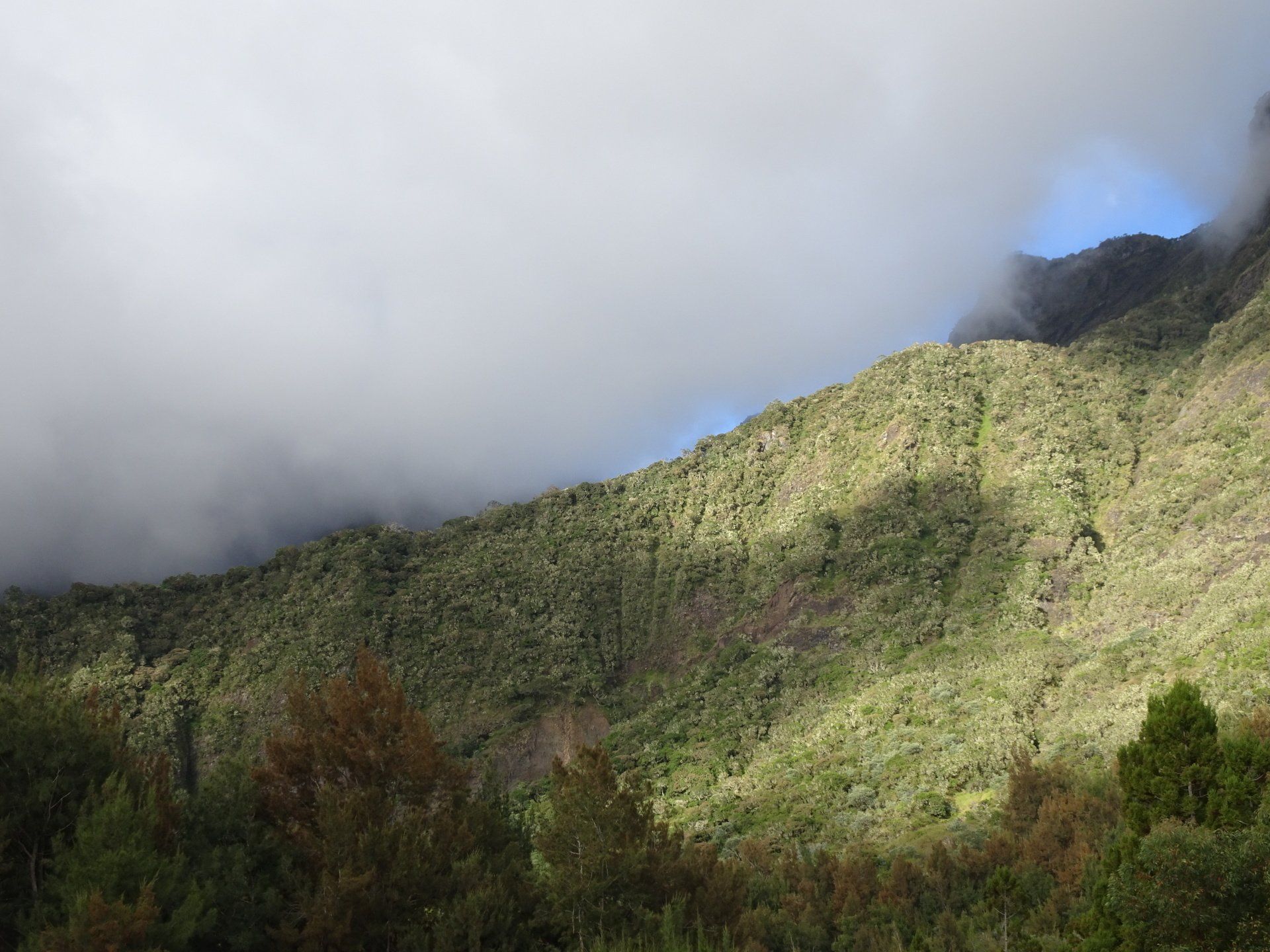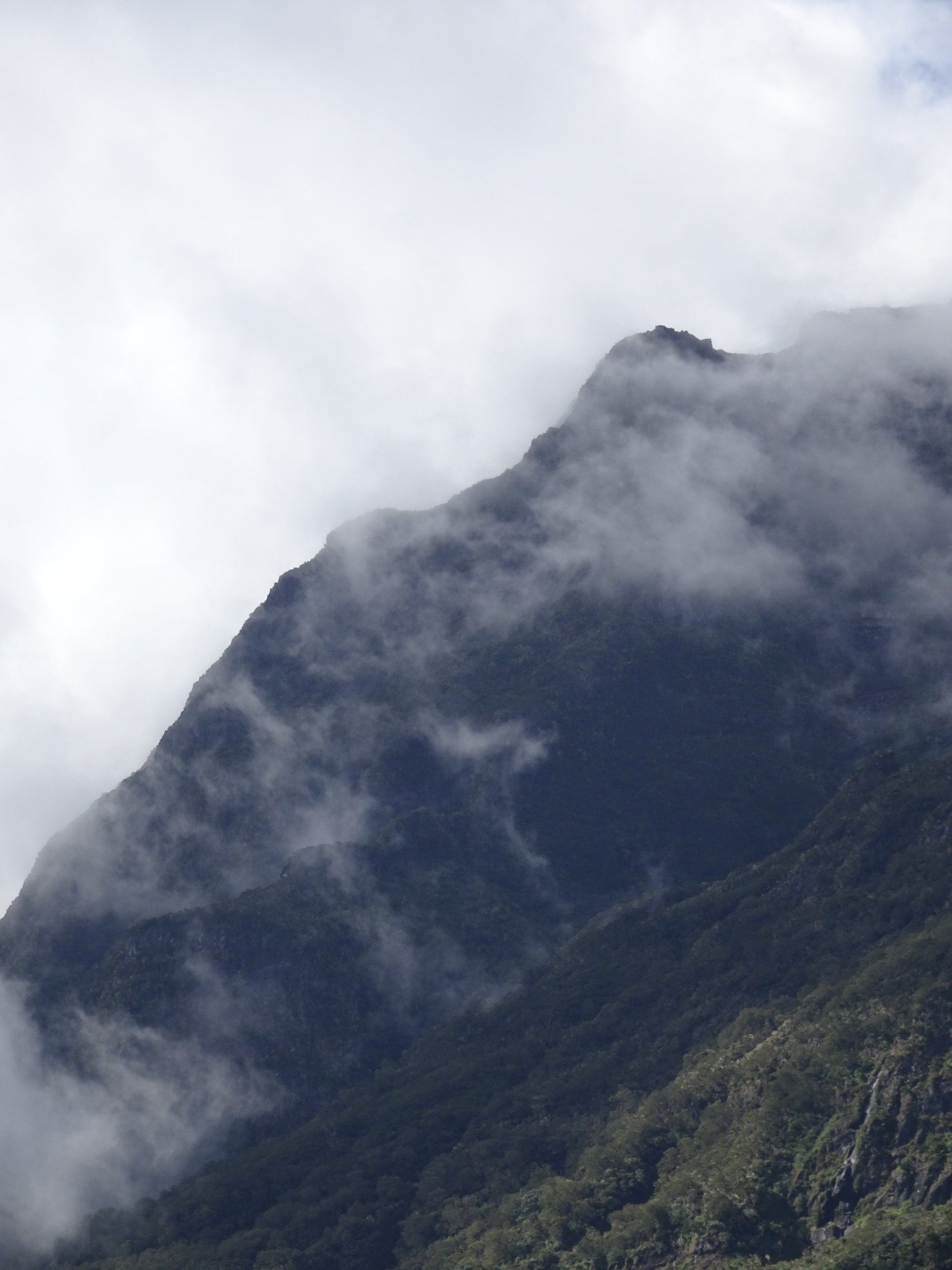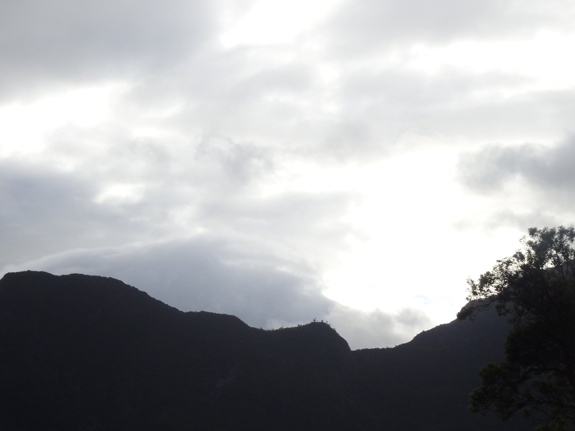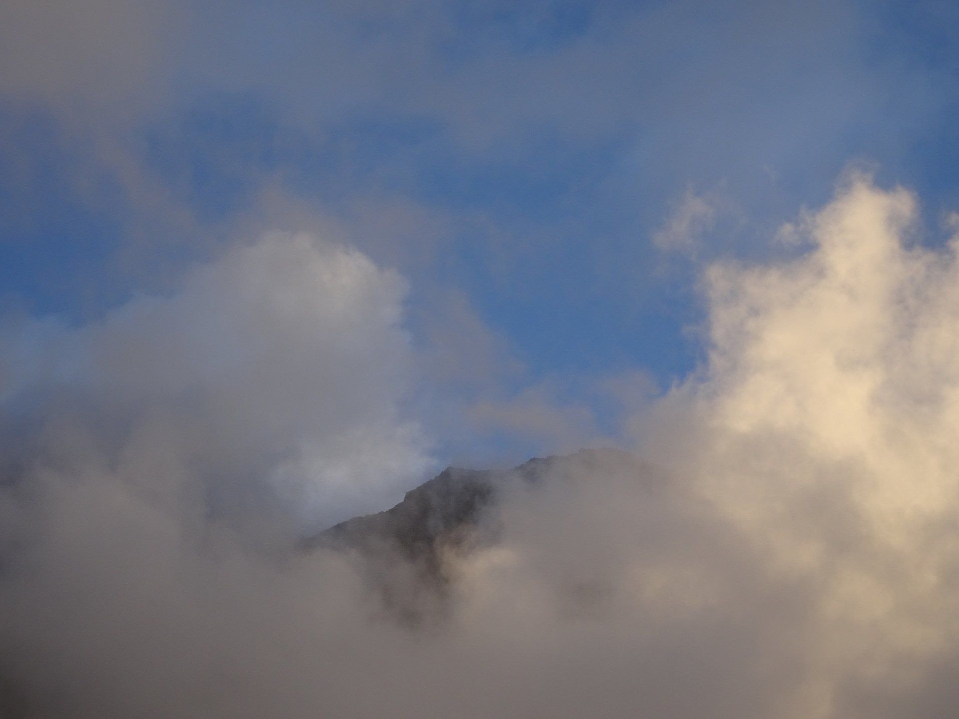 Nous aurons quelques gouttes au départ mais finalement, les sur-sacs ne serviront pas vraiment. Les montées-descentes se font sous un ciel couvert, l’atmosphère est pleine de microgouttes.