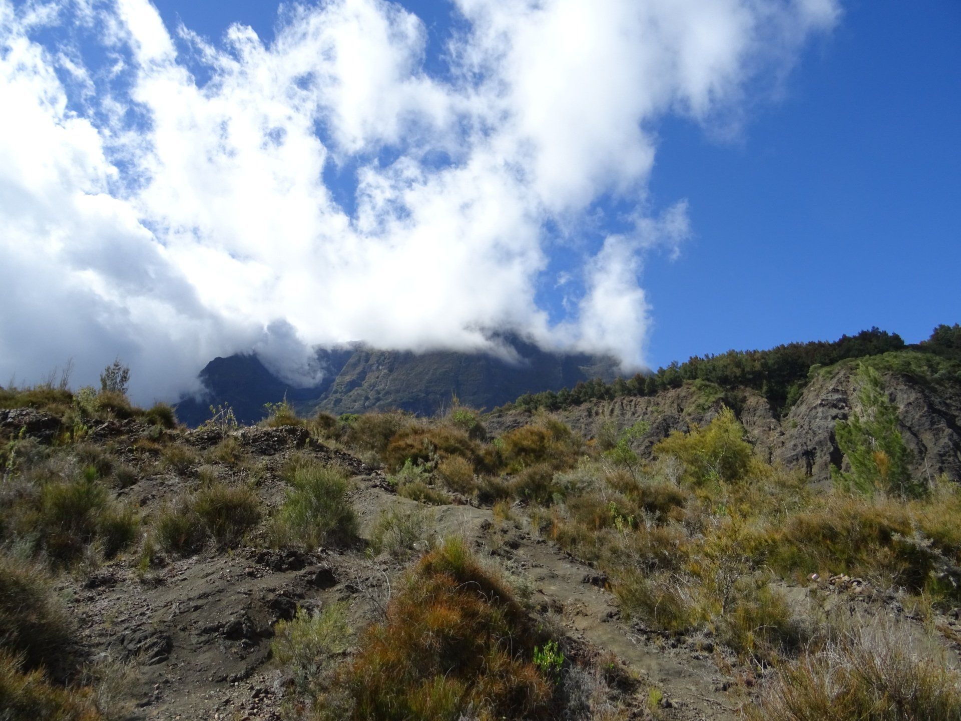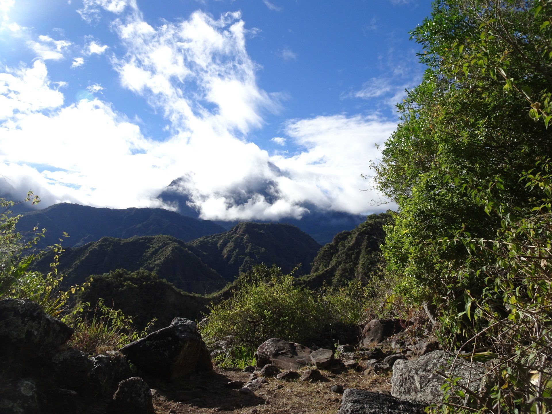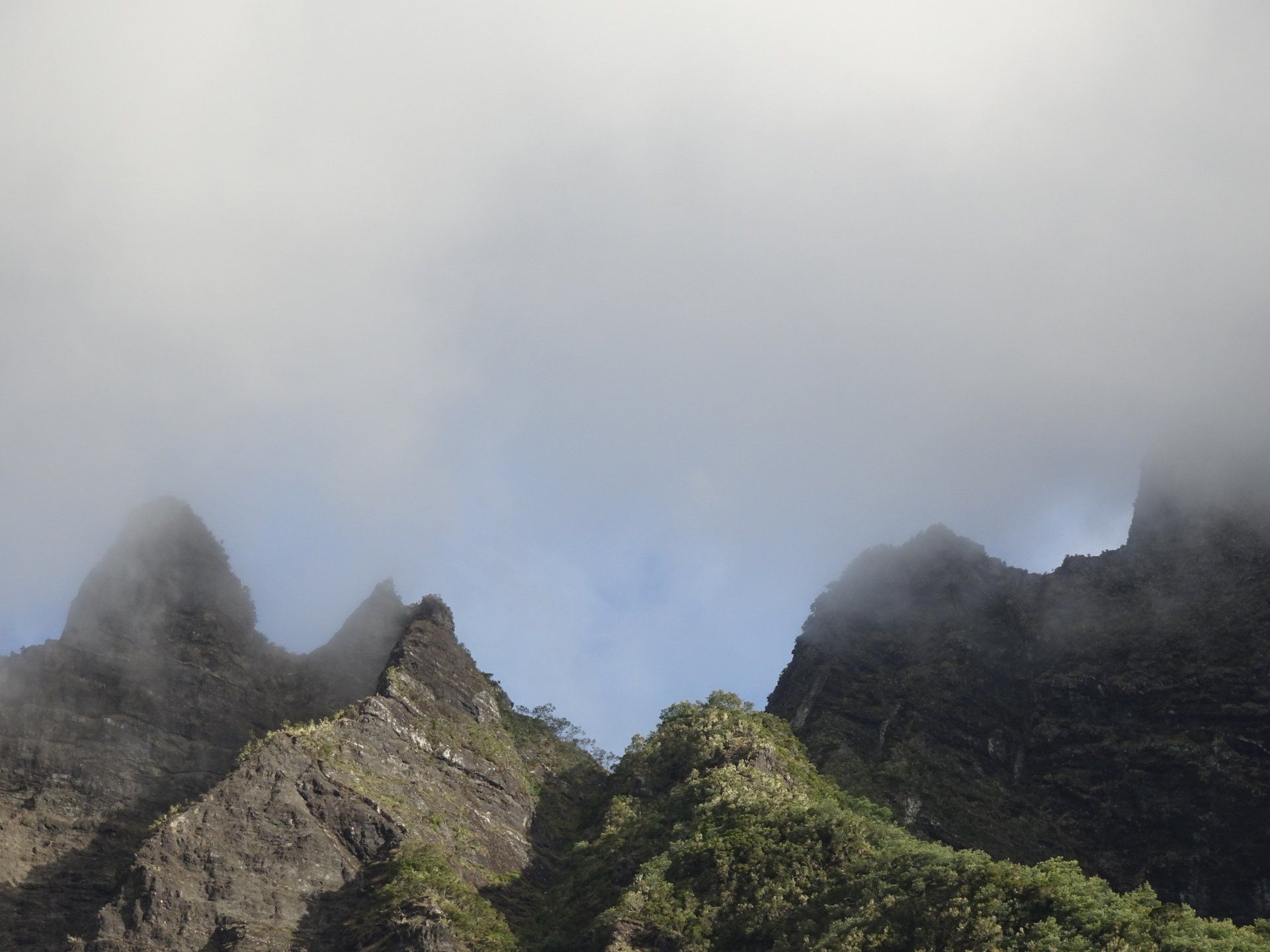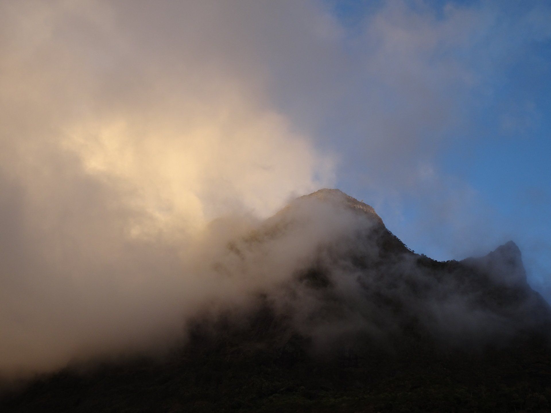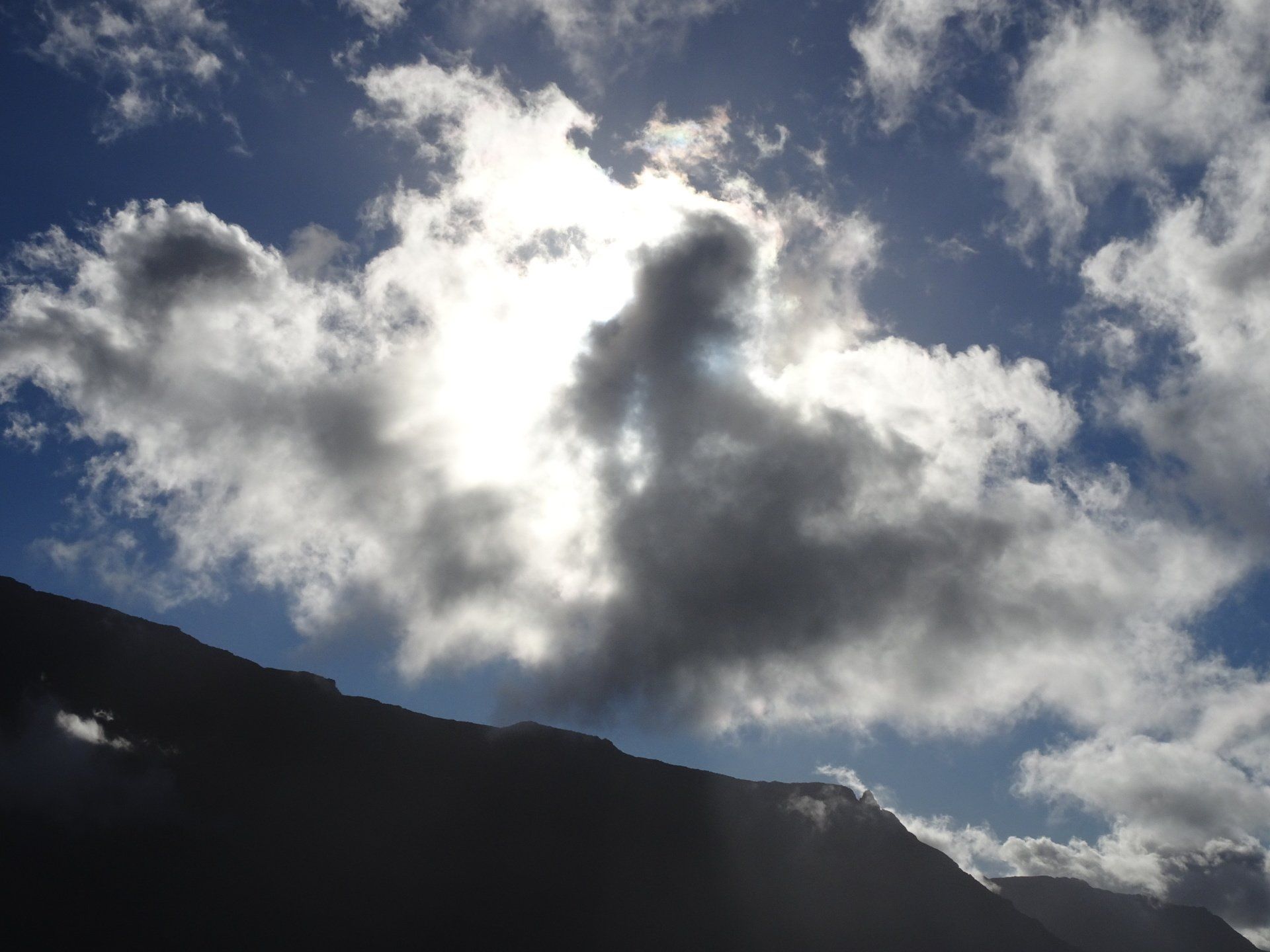 Nous aurons quelques gouttes au départ mais finalement, les sur-sacs ne serviront pas vraiment. Les montées-descentes se font sous un ciel couvert, l’atmosphère est pleine de microgouttes.
