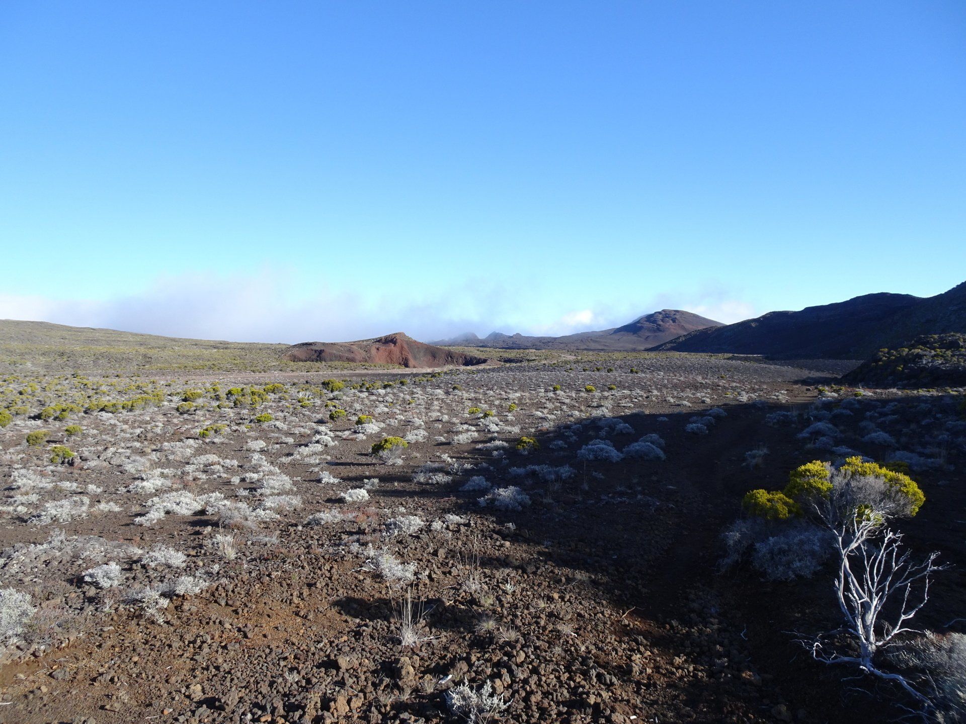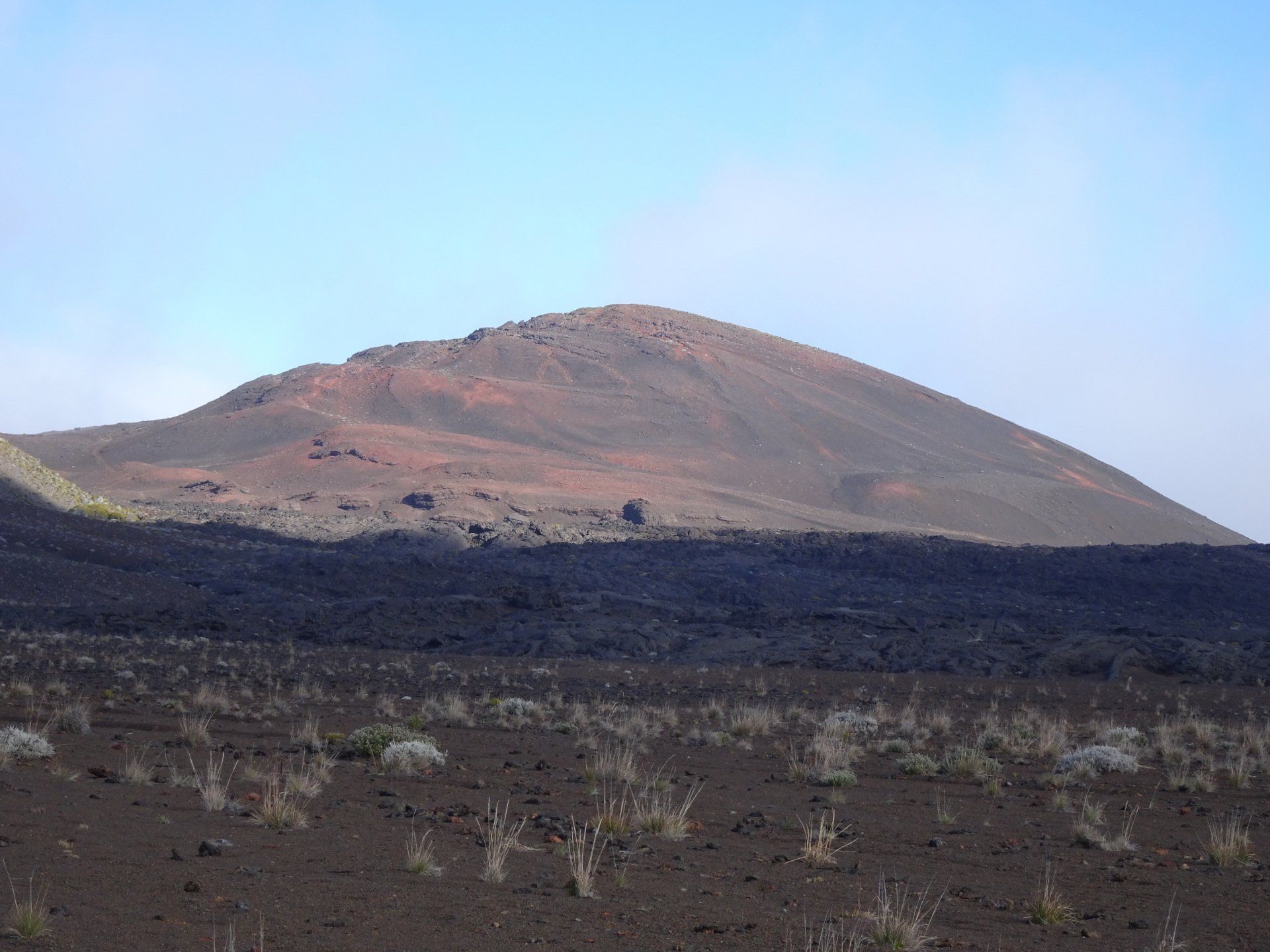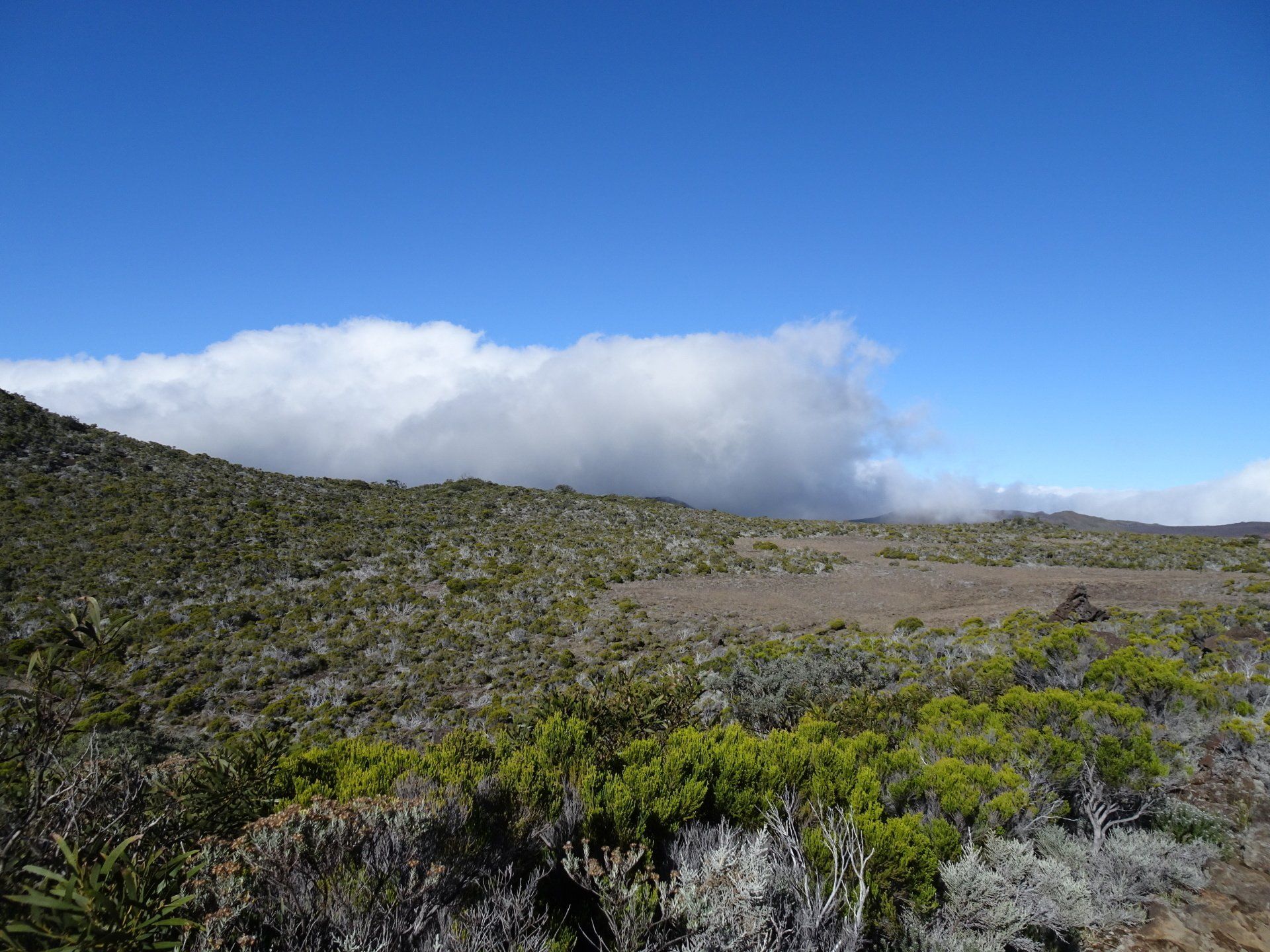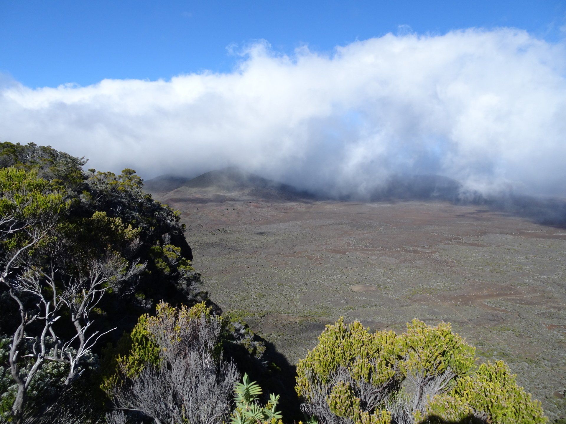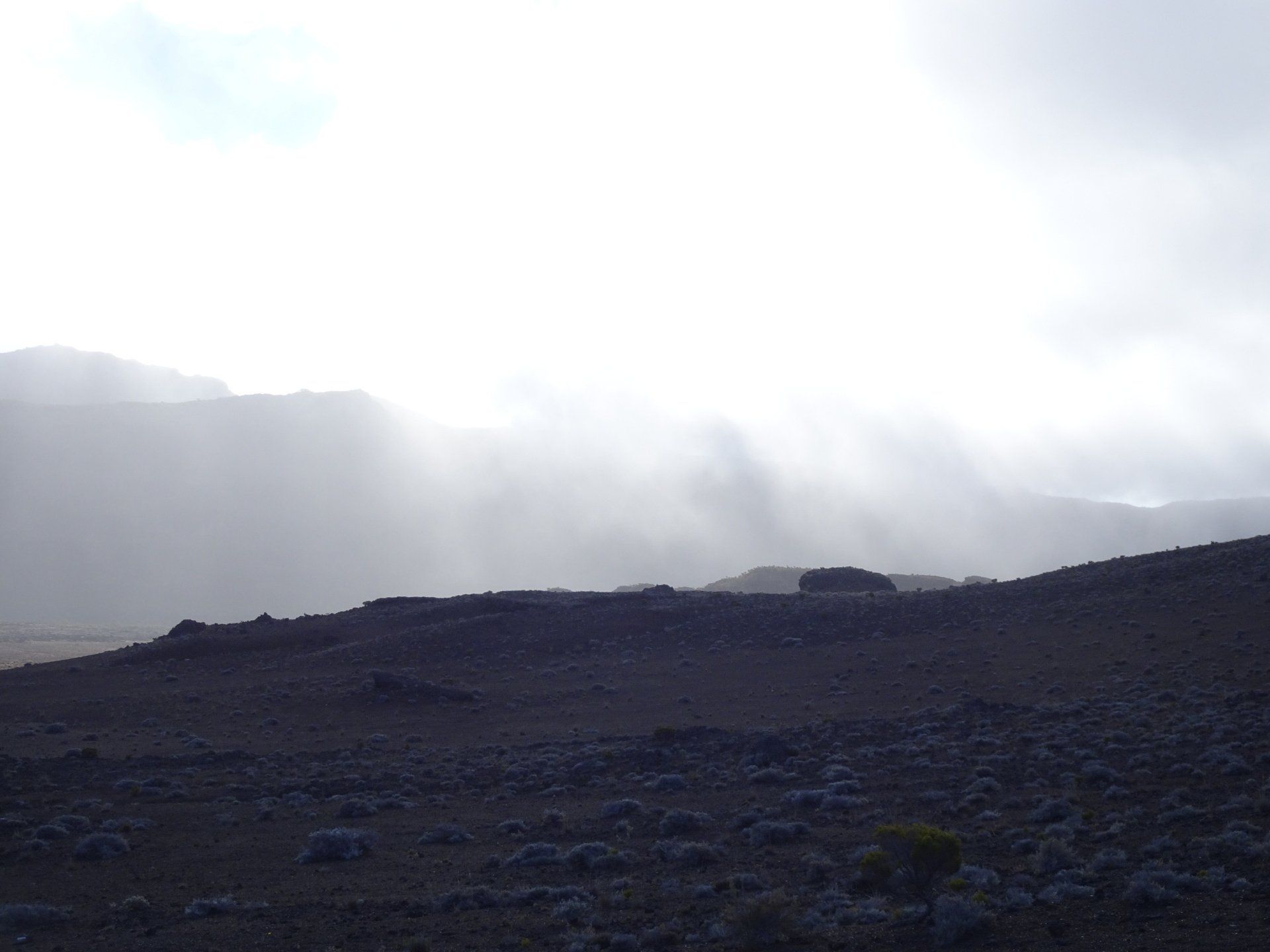 L’enclos qui donne accès à la plaine du Volcan est fermé, a priori encore pour un certain temps. De ce fait et aussi à cause de la météo un peu pourrie qui semble vouloir durer, nous décidons de ne rester qu’une seule nuit au lieu des 2 initialement réservées. Nous n’arrivons pas à joindre le gîte de Basse-vallée pour le lendemain soir. 2 chemins s’offrent à nous pour la grande descente. Au gîte, personne ne semble en mesure de départager les 2 options.