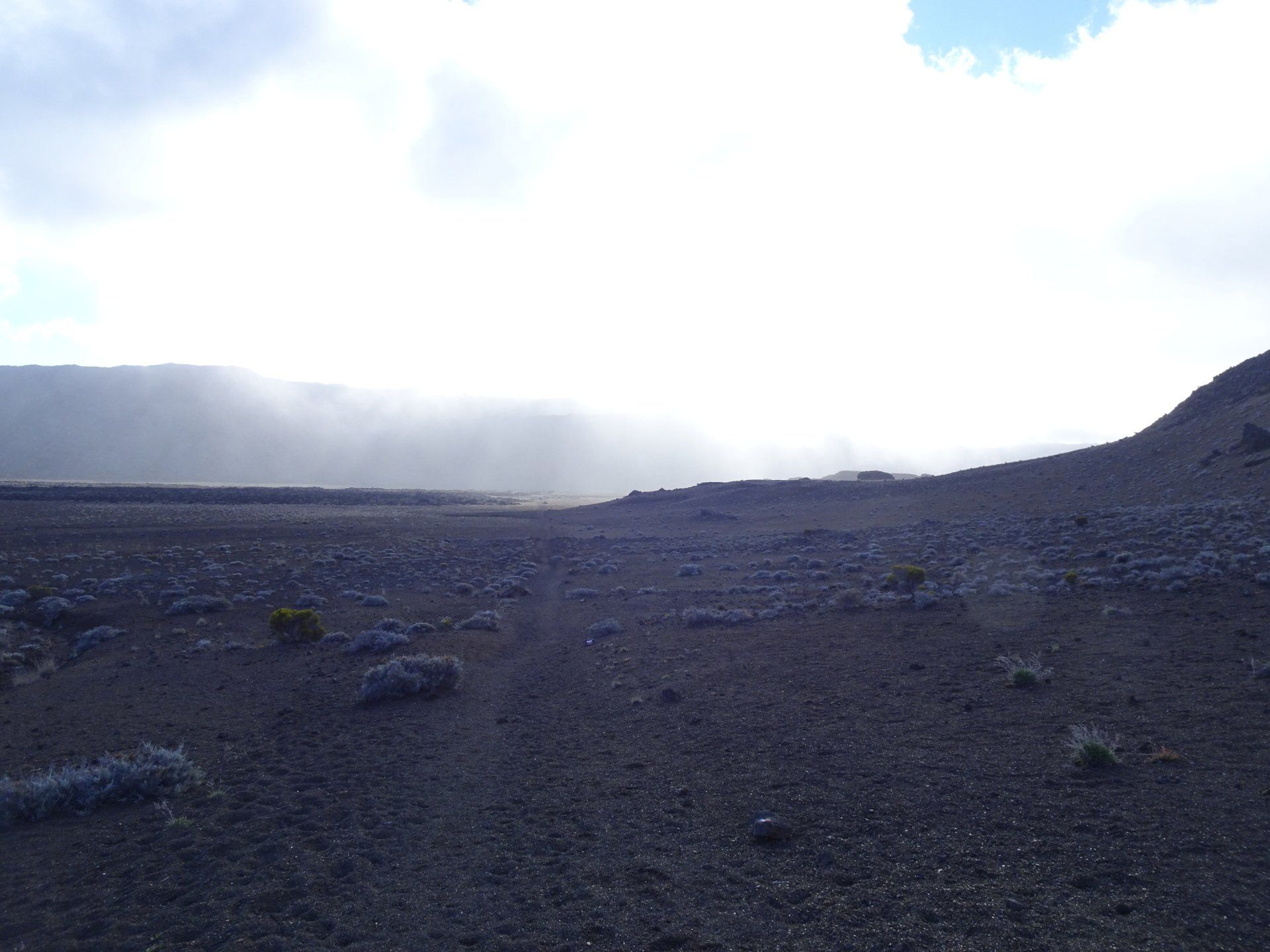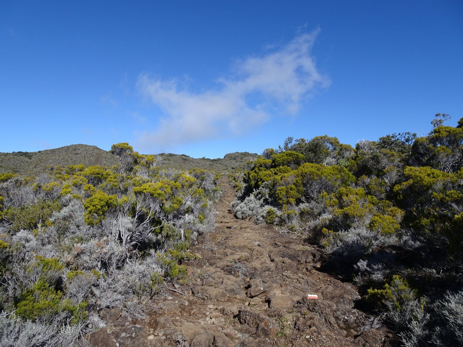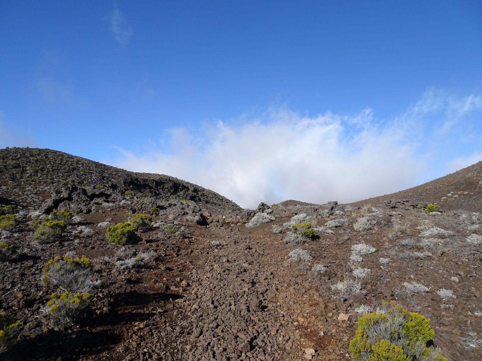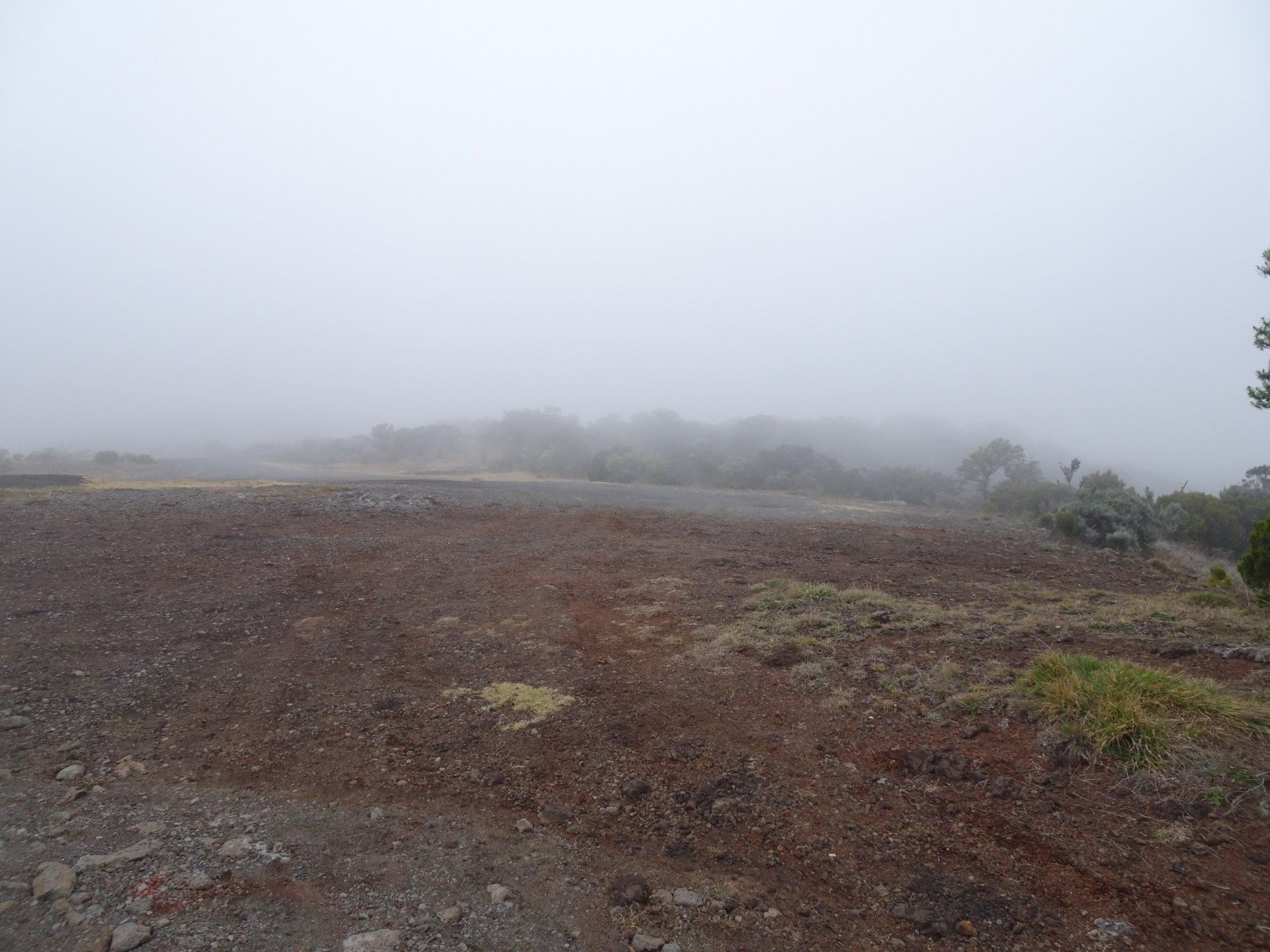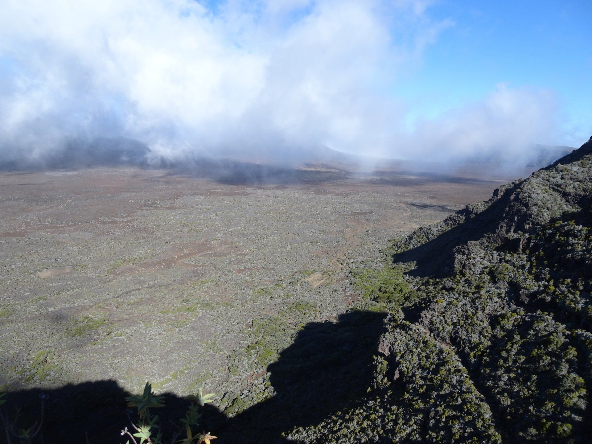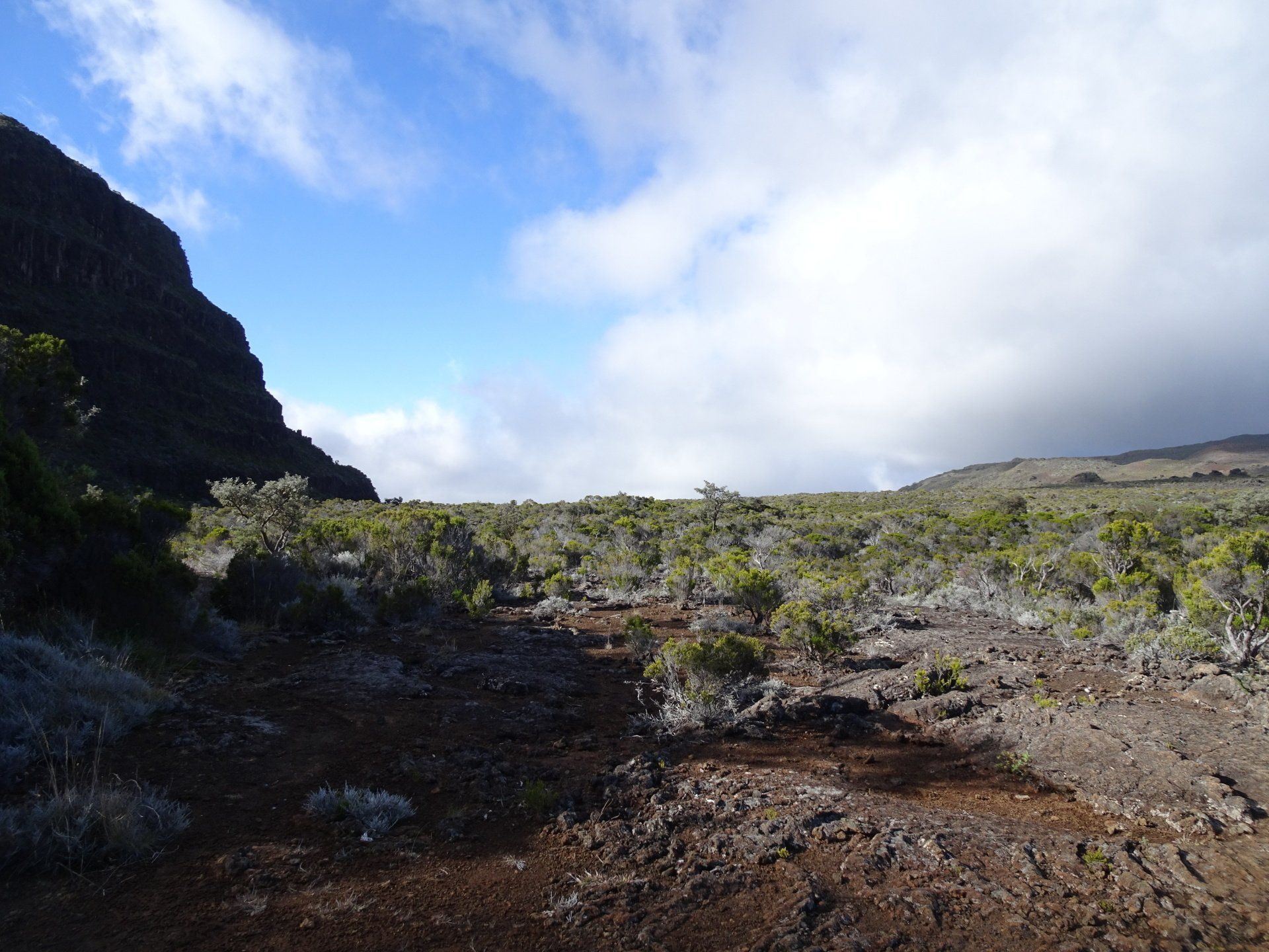 L’enclos qui donne accès à la plaine du Volcan est fermé, a priori encore pour un certain temps. De ce fait et aussi à cause de la météo un peu pourrie qui semble vouloir durer, nous décidons de ne rester qu’une seule nuit au lieu des 2 initialement réservées. Nous n’arrivons pas à joindre le gîte de Basse-vallée pour le lendemain soir. 2 chemins s’offrent à nous pour la grande descente. Au gîte, personne ne semble en mesure de départager les 2 options.