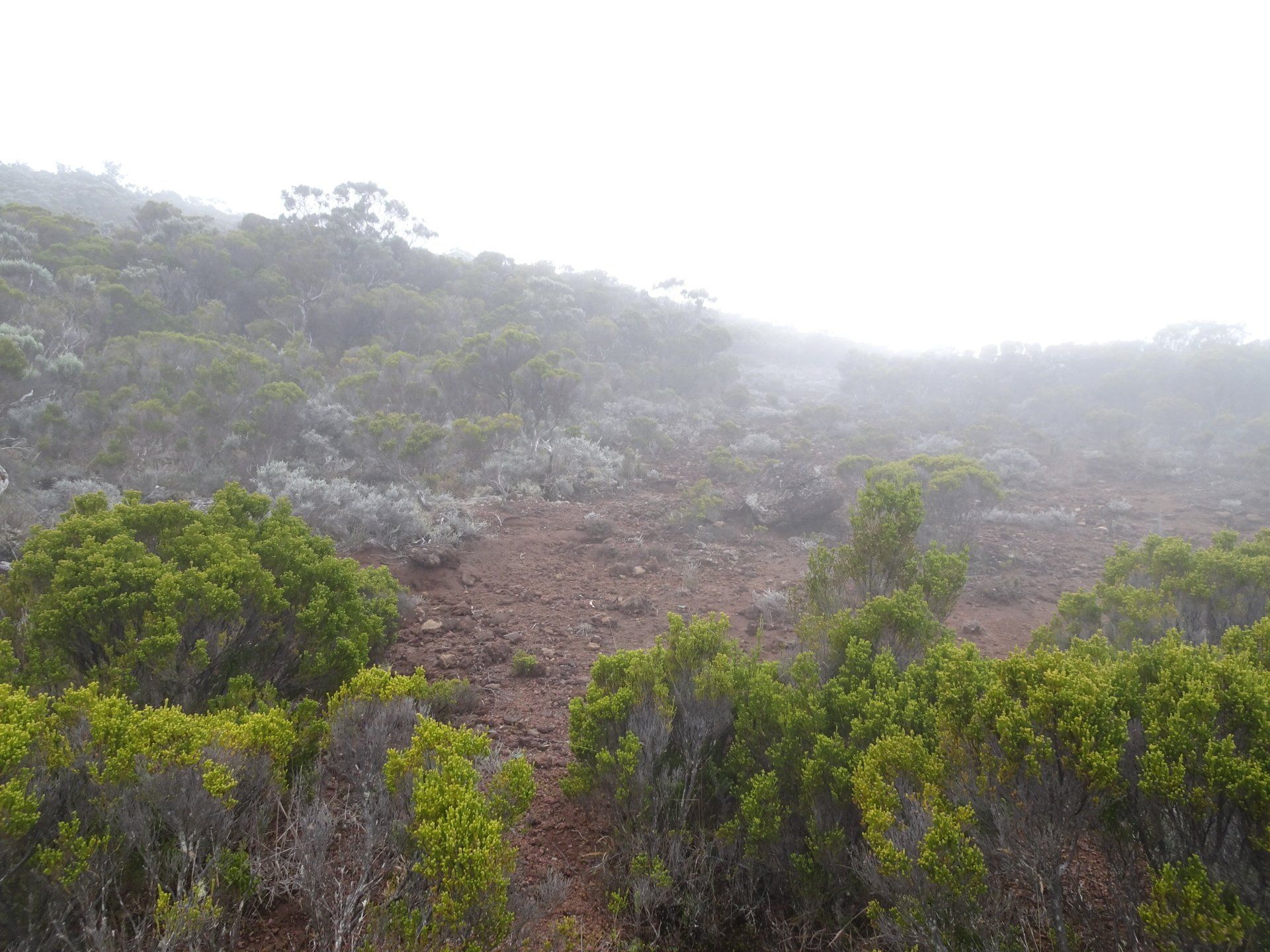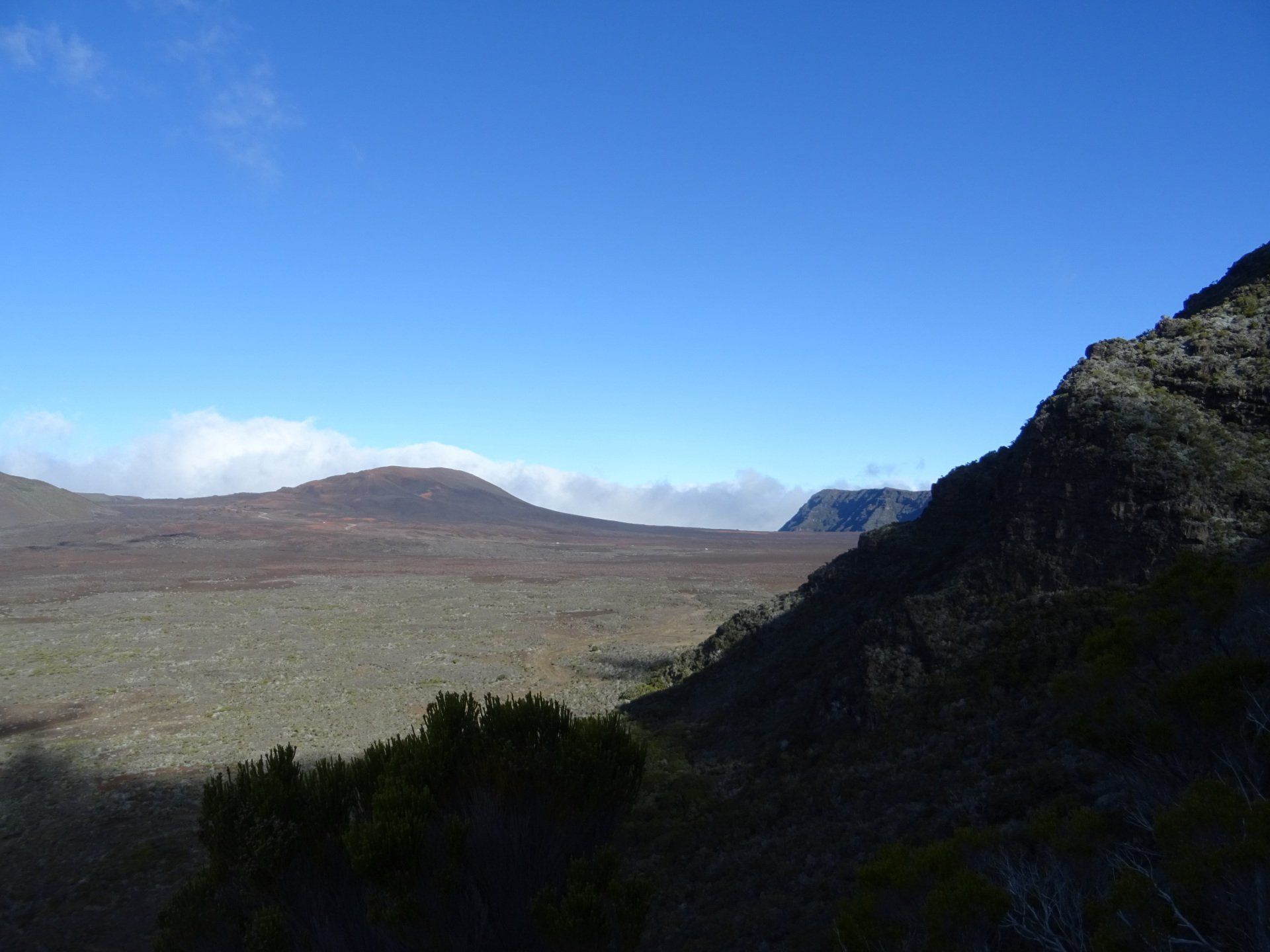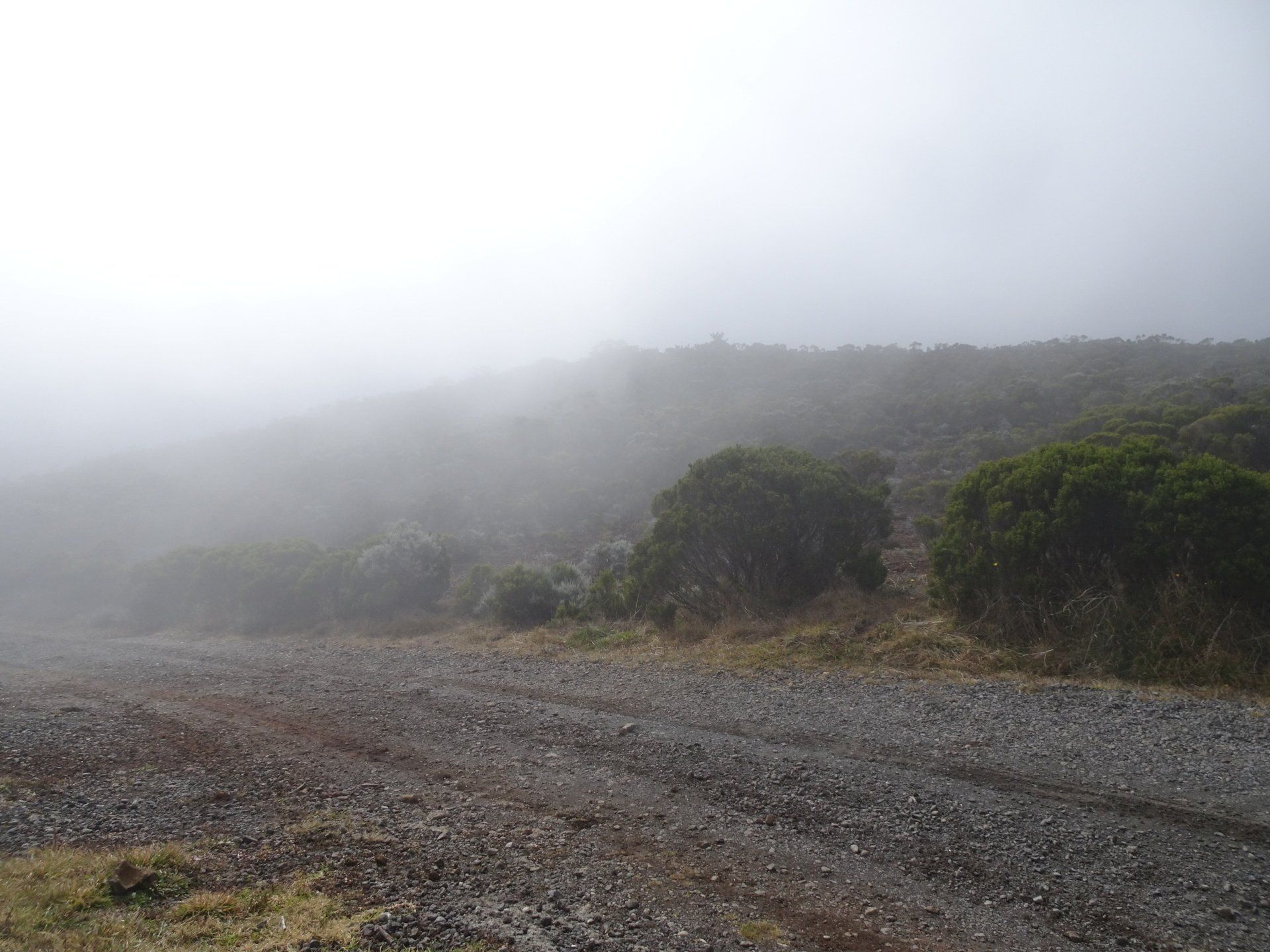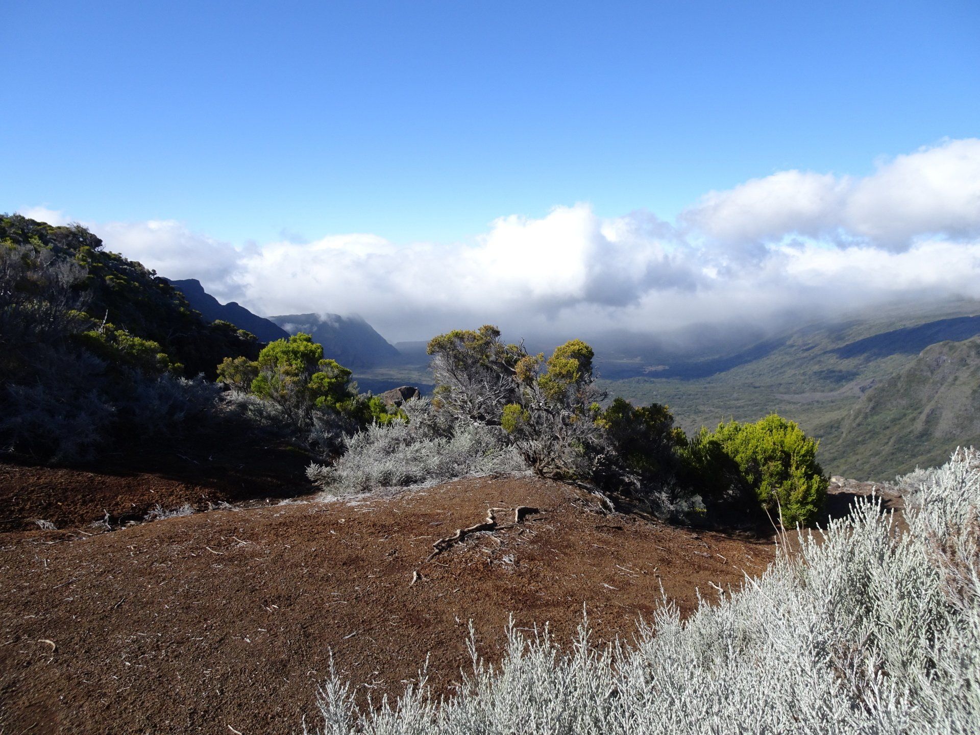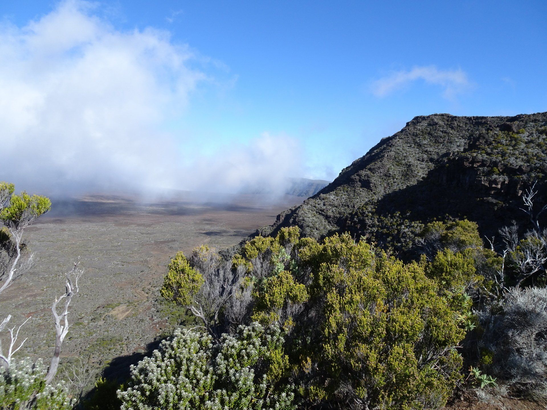 L’enclos qui donne accès à la plaine du Volcan est fermé, a priori encore pour un certain temps. De ce fait et aussi à cause de la météo un peu pourrie qui semble vouloir durer, nous décidons de ne rester qu’une seule nuit au lieu des 2 initialement réservées. Nous n’arrivons pas à joindre le gîte de Basse-vallée pour le lendemain soir. 2 chemins s’offrent à nous pour la grande descente. Au gîte, personne ne semble en mesure de départager les 2 options.