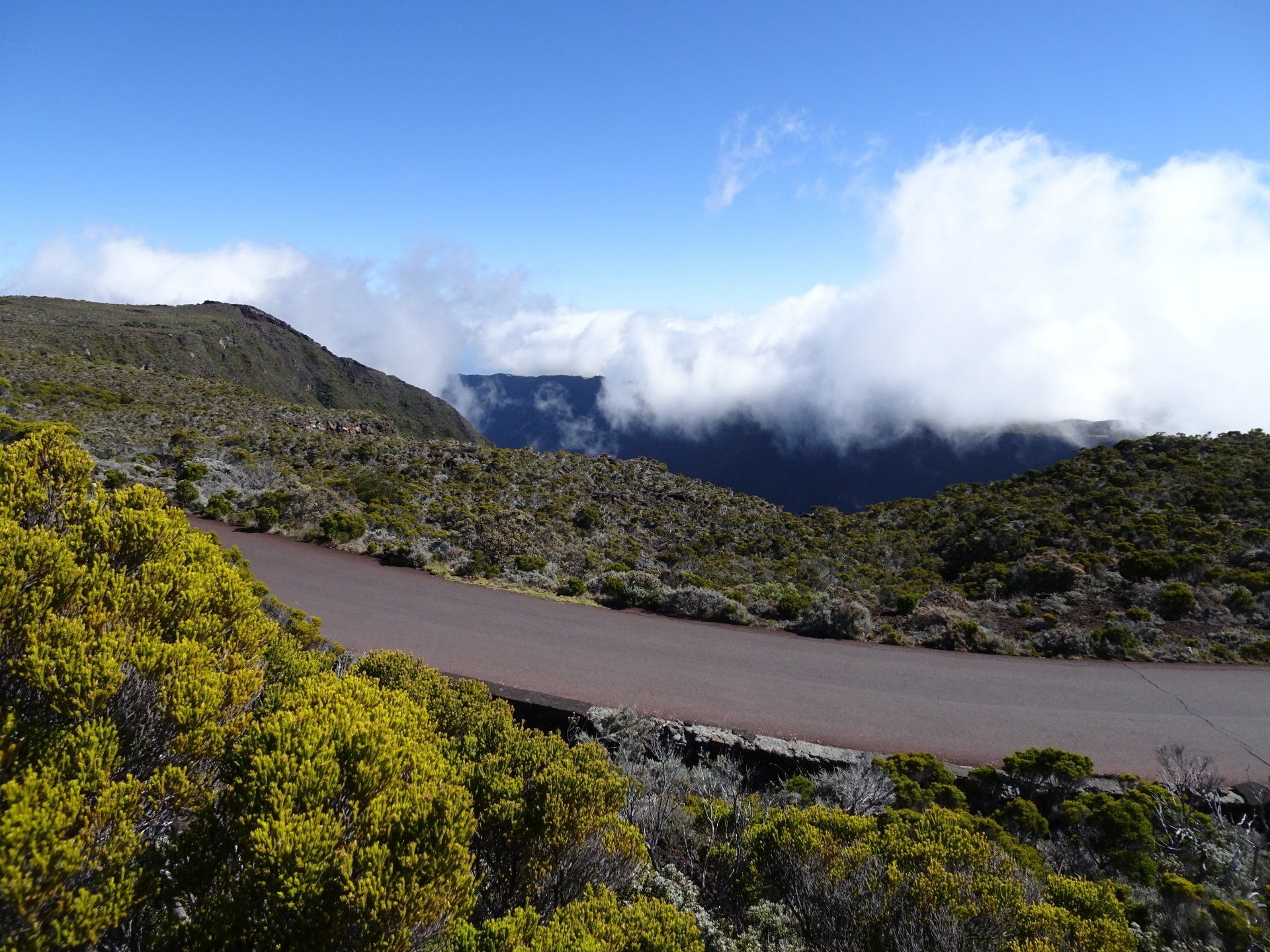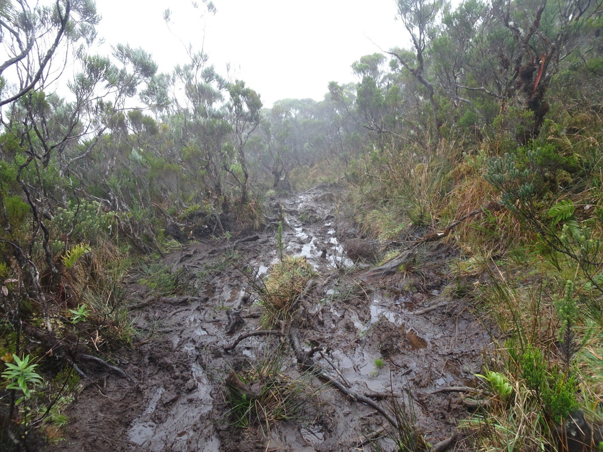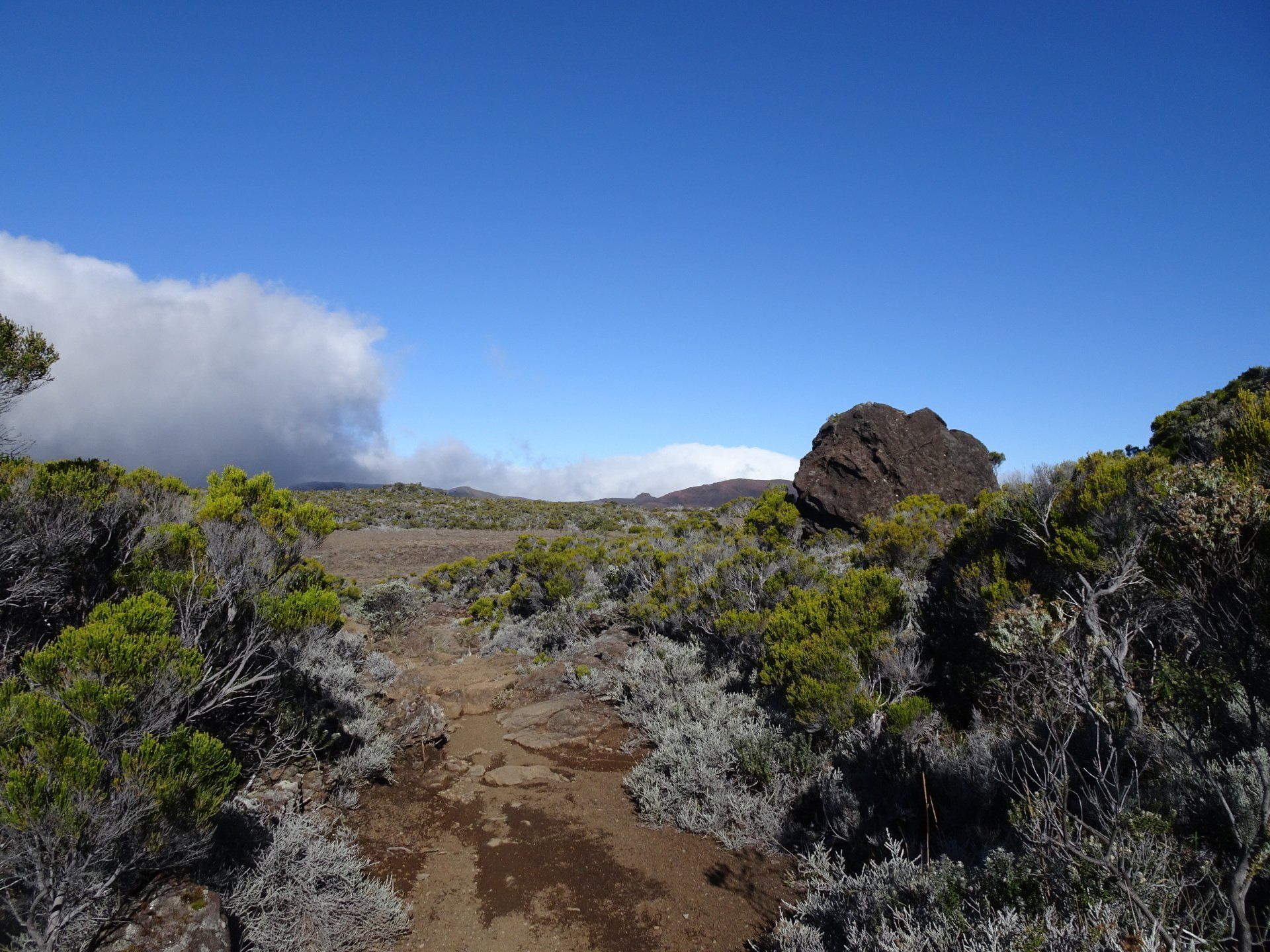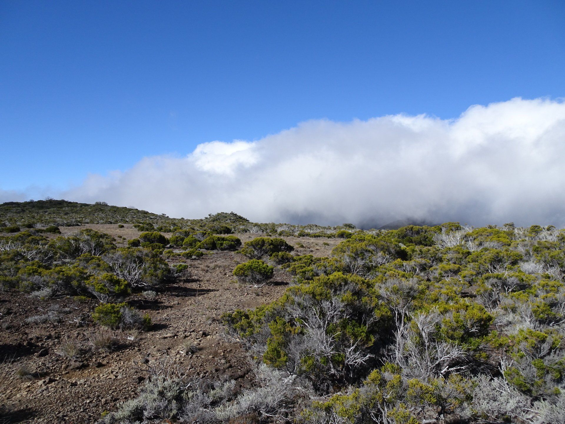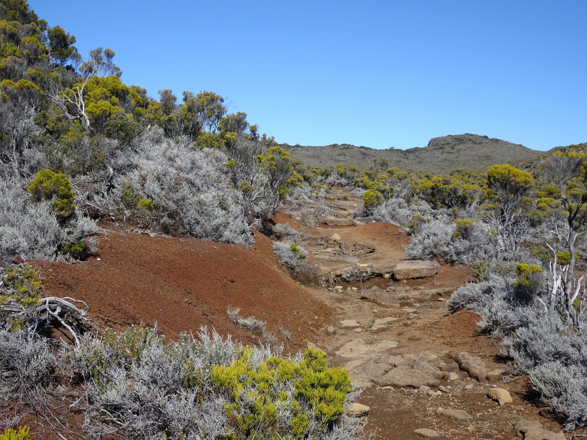 L’enclos qui donne accès à la plaine du Volcan est fermé, a priori encore pour un certain temps. De ce fait et aussi à cause de la météo un peu pourrie qui semble vouloir durer, nous décidons de ne rester qu’une seule nuit au lieu des 2 initialement réservées. Nous n’arrivons pas à joindre le gîte de Basse-vallée pour le lendemain soir. 2 chemins s’offrent à nous pour la grande descente. Au gîte, personne ne semble en mesure de départager les 2 options.