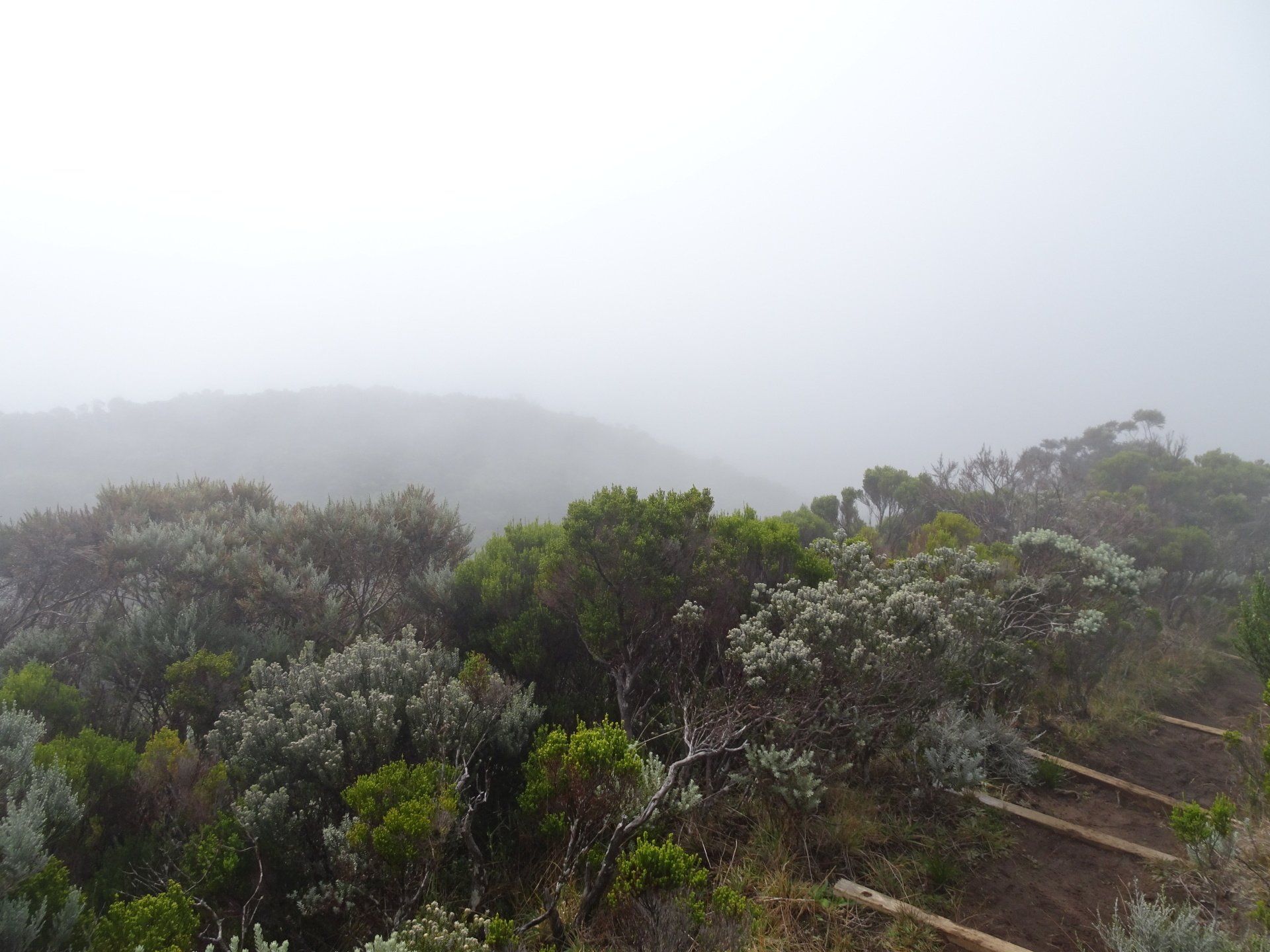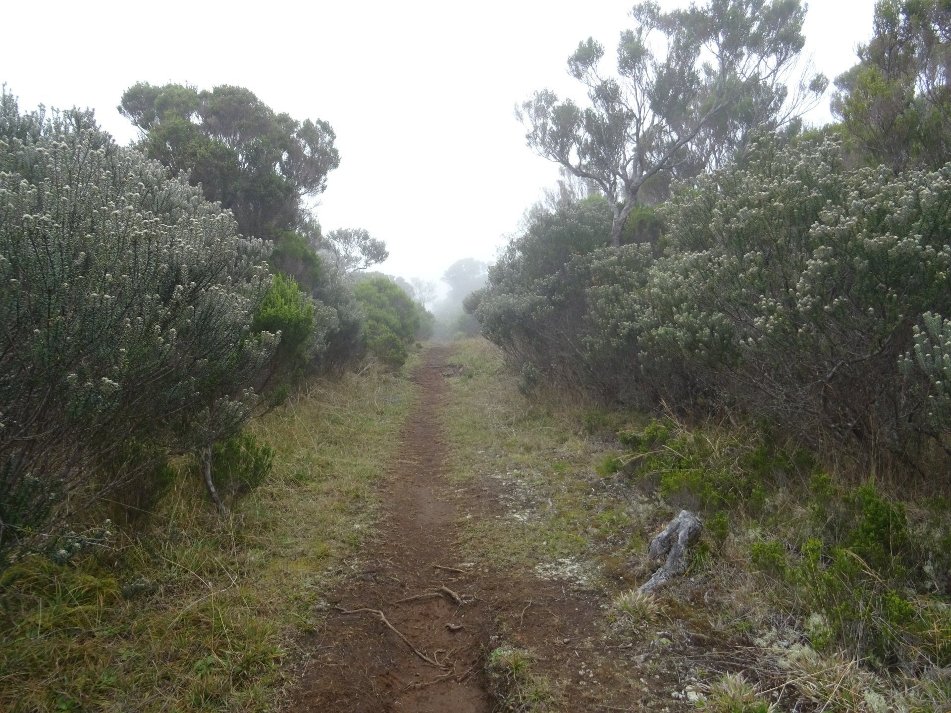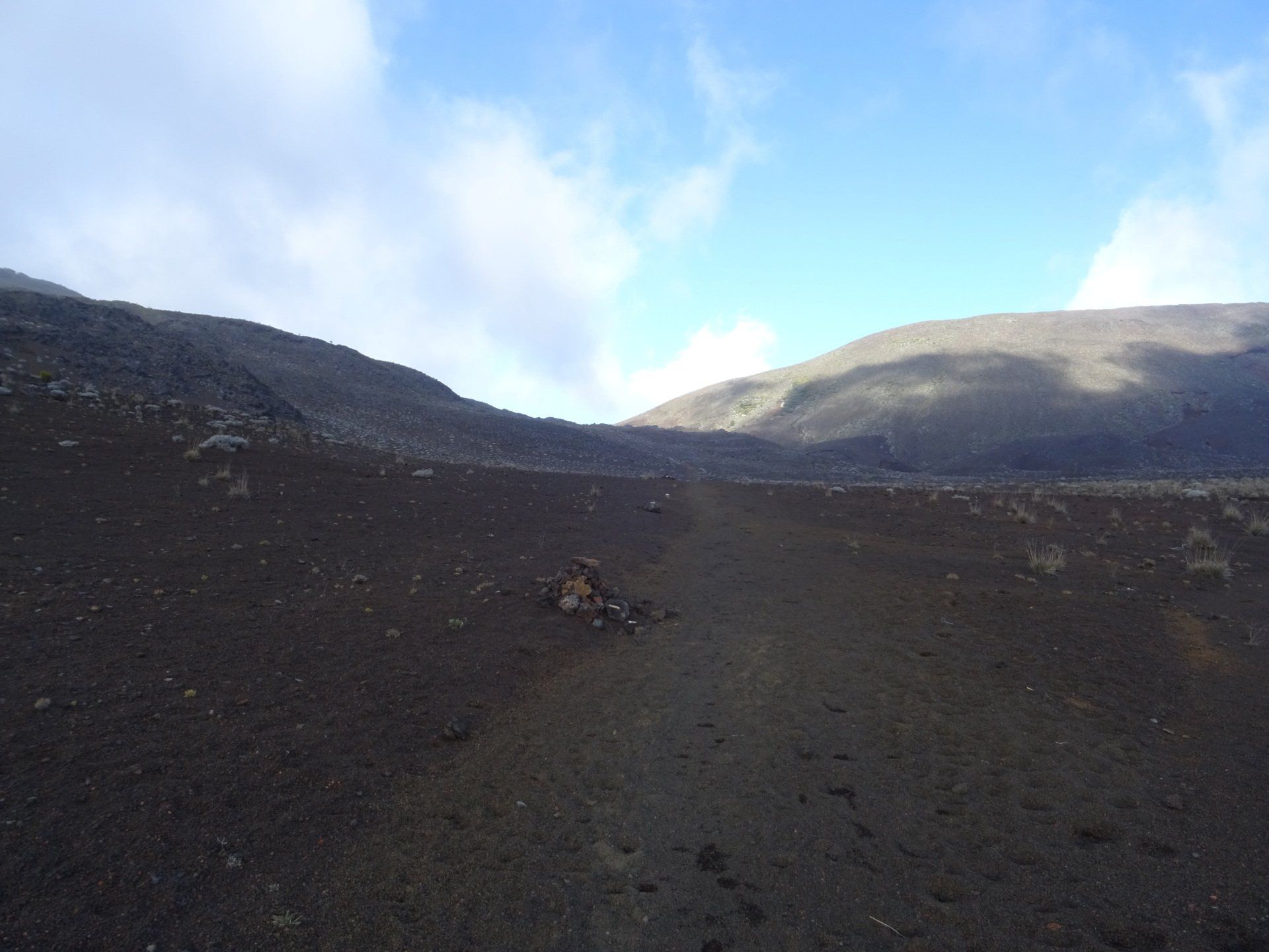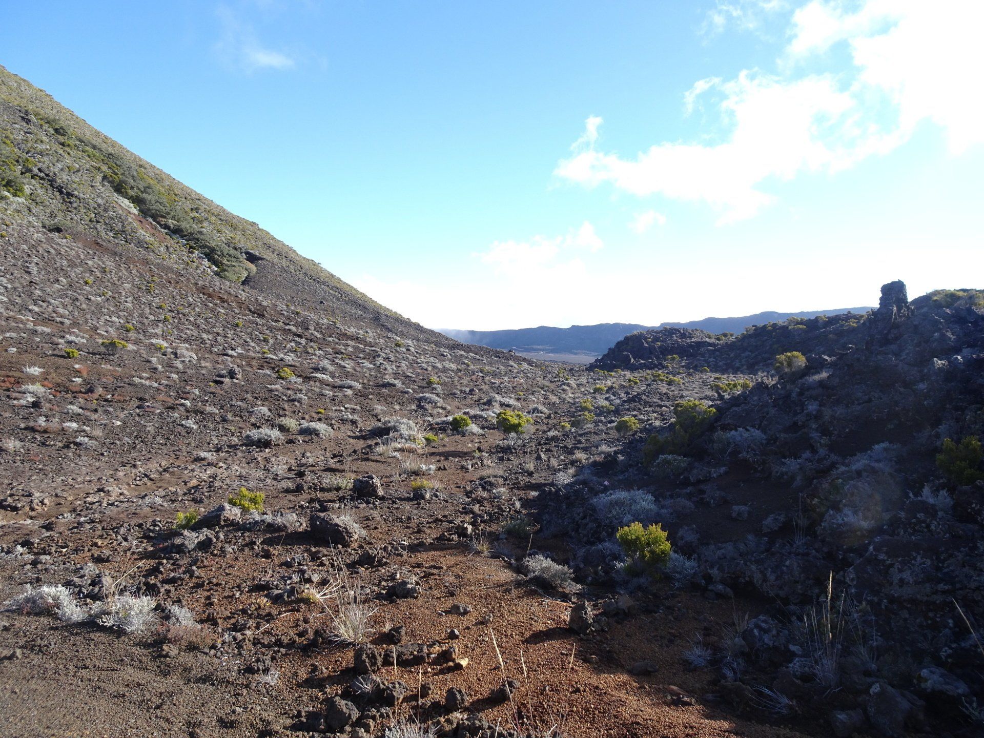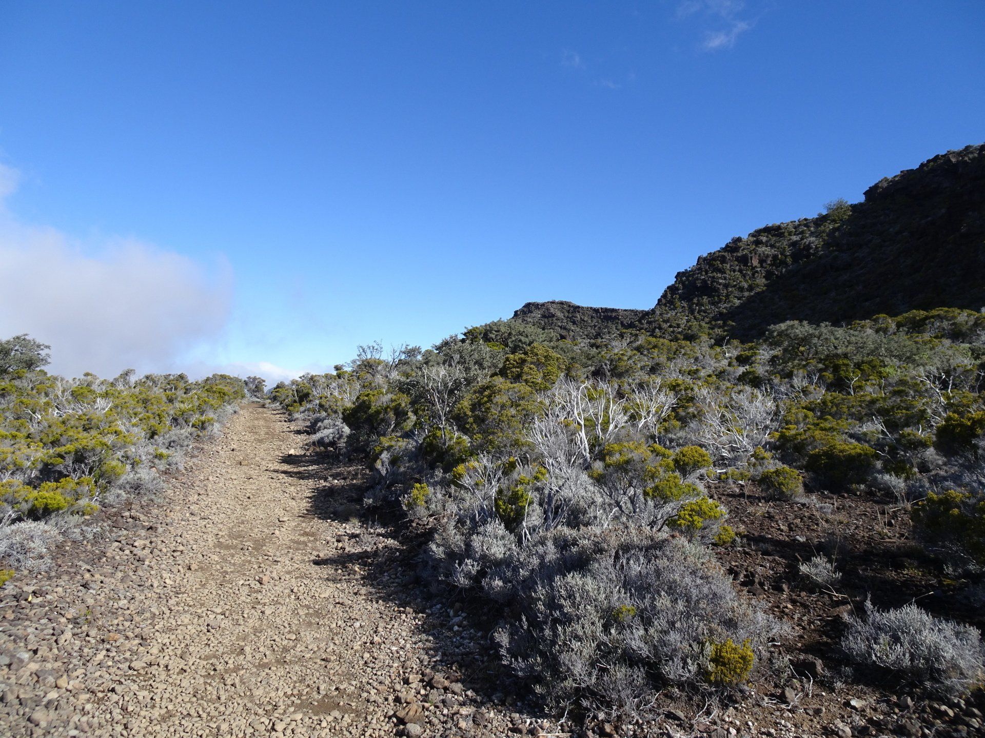 L’enclos qui donne accès à la plaine du Volcan est fermé, a priori encore pour un certain temps. De ce fait et aussi à cause de la météo un peu pourrie qui semble vouloir durer, nous décidons de ne rester qu’une seule nuit au lieu des 2 initialement réservées. Nous n’arrivons pas à joindre le gîte de Basse-vallée pour le lendemain soir. 2 chemins s’offrent à nous pour la grande descente. Au gîte, personne ne semble en mesure de départager les 2 options.